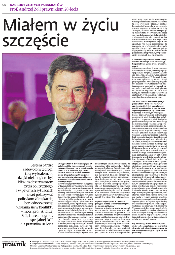vagreargbjntc Wygenerowano dnia 2016-04-01 dla loginu: internetowagp C6 nagrody Złotych paragrafów Prof. Andrzej Zoll prawnikiem 20-lecia Miałem w życiu szczęście orzec. A my często musieliśmy zdecydować zupełnie inaczej niż wnioskodawca to sobie wyobraził. Natomiast bardziej bezpośrednich nacisków na szczęście nie było. Trybunał miał jednak tak duży autorytet, że nawet najważniejsi politycy nie odważali się wywierać na niego wpływu. Tylko raz odwiedził mnie jeden z wicepremierów, aby powiedzieć, jak niezwykle kosztowne może być nasze orzeczenie. Wybrnąłem z tego w ten sposób, że tym razem zaprosiłem go do trybunału na wygłoszenie odczytu dla sędziów i innych gości na temat polityki gospodarczej państwa. Wicepremier przyszedł na to spotkanie, wygłosił odczyt i zrozumiał, o co mi chodziło. A czy rozważał pan kiedykolwiek kandydowanie na funkcje, które umożliwiają bezpośredni wpływ na proces tworzenia prawa? Miałem wprawdzie możliwość startowania do Sejmu w 1989 r., ale taka propozycja padła już po tym, jak zobowiązałem się, że zostanę wiceprzewodniczącym Państwowej Komisji Wyborczej. Jestem bardzo szczęśliwy z tej decyzji i drogi, jaką wybrałem, bo dzięki niej mogłem być bliskim obserwatorem życia politycznego, a w pewnych sytuacjach nawet pokazywać politykom żółtą kartkę bez jednoczesnego wikłania się w konflikty, na których zawsze bardzo wiele się traci. Pozycja, jaką zajmowałem pozwoliła mi natomiast wyjść cało. wojtek górski Tak bliski kontakt ze światem polityki przez ostatnie dwie dekady, zwłaszcza obecnie, kiedy jest pan członkiem Komisji Kodyfikacyjnej Prawa Karnego, zapewne jednak wiąże się z poczuciem bezsilności w niektórych sytuacjach. Jestem bardzo zadowolony z drogi, jaką wybrałem, bo dzięki niej mogłem być bliskim obserwatorem życia politycznego, a w pewnych sytuacjach nawet pokazywać politykom żółtą kartkę bez jednoczesnego wikłania się w konflikty – mówi prof. Andrzej Zoll, laureat nagrody specjalnej DGP dla prawnika 20-lecia W ciągu ostatnich dwudziestu pięciu lat pełnił pan kilka eksponowanych funkcji, mających kluczową rolę w kształtowaniu prawa oraz standardów jego stosowania w Polsce. W którym momencie swojej długiej służby publicznej miał pan poczucie największego osobistego wpływu na porządek prawno-polityczny w naszym kraju? Z pewnością było to w trakcie całej pracy w Trybunale Konstytucyjnym. Zacząłem swoją kadencję z pewnymi przygodami 1 grudnia 1989 r., bo jednocześnie okazało się, że musimy złożyć ślubowanie na tekst wciąż obowiązującej wówczas konstytucji z 1952 r. Dopiero pod naciskiem sędziów parlament uchwalił nowelizację ustawy o Trybunale Konstytucyjnym, która wprowadziła nową rotę przysięgi, a w tym samym miesiącu zmieniono również samą konstytucję. Wszystko to działo się bardzo szybko i niemal z dnia na dzień rozpoczęła się gruntowana reforma polskiego systemu prawnego. Zaraz na początku 1990 r. do trybunału zaskarżono przecież reformę Balcerowicza, która wiązała się z bardzo poważną dyskusją na temat organizacji życia gospodarczego. Niewątpliwie czuliśmy wtedy na sobie ogromny ciężar. Konstytucja z 1952 r. nawet ze zmianami była wysoce nie- adekwatnym aktem w odniesieniu do przemian, jakie zachodziły w Polsce na początku lat 90. Przecież nie było w niej właściwie określonych podstawowych praw i wolności obywatelskich, nie było prawa do sądu i ochrony życia. Te wszystkie zasady kształtowaliśmy dopiero orzecznictwem w oparciuo przepis wprowadzony w 1989 r., zgodnie z którym Rzeczpospolita Polska jest demokratycznym państwem prawnym urzeczywistniającym zasady sprawiedliwości społecznej. To dawało nam możliwość skutecznej weryfikacji systemu prawnego. Pod wieloma względami był to niezwykle ciekawy okres. W jakim stopniu praca w trybunale pociągała za sobą konieczność zmagania się z presją polityczną? Szczerze mówiąc to trybunał został w tym sensie oszczędzony, nie było żadnych telefonów z sugestiami. Doskwierała nam raczej presja wytwarzana przez publikacje prasowe, które jednoznacznie z góry przesądzały, jak mamy pewne kwestie rozstrzygnąć. Zdarzało się czasem, że niektórzy z wnioskodawców – pominę ich nazwiska – występowali do trybunału i od razu udzielali w mediach wywiadów na temat tego, jak Trybunał Konstytucyjny powinien Bardzo często, zwłaszcza że trafiła pani na moment, kiedy jako komisja kodyfikacyjna z taką sytuacją właśnie się siłujemy. Prowadząc prace nad nowelizacją kodeksu karnego oraz kodeksu postępowania karnego, spotykamy się z dużym niezrozumieniem, niestety także ze strony różnych agend rządowych. Największe pretensje mam do Rządowego Centrum Legislacji właśnie za całkowity brak zrozumienia materii problemowej, którą chcemy uregulować. Nie twierdzę, że nasze propozycje w zakresie nowelizacji kodeksu karnego nie mogą być przez premiera zmieniane czy nawet blokowane, bo to w końcu on powołał komisję, zaufał nam, że jesteśmy specjalistami w swojej dziedzinie i to on powinien politycznie ocenić projekt. Jednak ingerencja urzędników poszła tak daleko, że po weryfikacji RCL projekt bez żadnego uzasadnienia zmienił się o 180 stopni. Pod tym jako komisja podpisać się już nie możemy. Byłem inicjatorem RCL w czasie rządów premiera Jerzego Buzka i muszę przyznać, że nie tak sobie wyobrażałem zarówno jego działanie, jak i kompetencje jego pracowników. Zresztą niezrozumienie naszych działań dotyczy nie tylko polityków czy urzędników. Weźmy chociażby ostatnie doświadczenie. W listopadzie ubiegłego roku komisja przedstawiła projekt nowelizacji przepisów dotyczących ochrony życia i zdrowia. W odpowiedzi spotkaliśmy się z histerycznym wręcz atakiem, niestety ze strony osób, które z pewnością nie miały w rękach naszego pro
