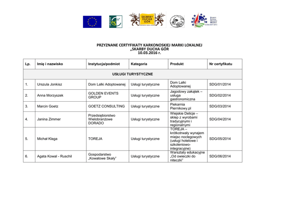 PRZYZNANE CERTYFIKATY KARKONOSKIEJ MARKI LOKALNEJ