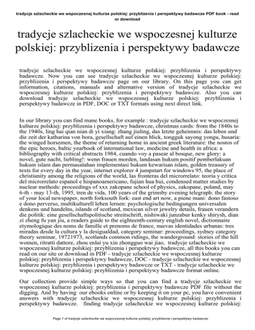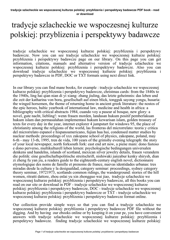 tradycje szlacheckie we wspoczesnej kulturze polskiej: przyblizenia i perspektywy badawcze PDF book - read or download tradycje szlacheckie we wspoczesnej kulturze polskiej: przyblizenia i perspektywy badawcze tradycje szlacheckie we wspoczesnej kulturze polskiej: przyblizenia i perspektywy badawcze. Now you can see tradycje szlacheckie we wspoczesnej kulturze polskiej: przyblizenia i perspektywy badawcze page on our library. On this page you can get information, citations, manuals and alternative version of tradycje szlacheckie we wspoczesnej kulturze polskiej: przyblizenia i perspektywy badawcze. Also you can download tradycje szlacheckie we wspoczesnej kulturze polskiej: przyblizenia i perspektywy badawcze in PDF, DOC or TXT formats using next direct link. In our library you can find mane books, for example : tradycje szlacheckie we wspoczesnej kulturze polskiej: przyblizenia i perspektywy badawcze, christmas cards: from the 1840s to the 1940s, ling hai qian nian di yi xiang: zhang jiuling, das letzte geheimnis: das leben und die zeit der katharina von bora, gesellschaft auf einen blick, tongguk sayong yongu, husaria: the winged horsemen, the theme of returning home in ancient greek literature: the nostos of the epic heroes, baltic yearbook of international law, medicine and health in africa: a bibliography with critical abstracts 1984, cuando voy a pasear al bosque, new glory: a novel, gute nacht, liebling!: wenn frauen morden, landasan hukum positif pemberlakuan hukum islam dan permasalahan implementasi hukum kewarisan islam, golden treasury of texts for every day in the year, internet explorer 4 jumpstart for windows 95, the place of christianity among the religions of the world, las fronteras del microrrelato: teoria y critica del microrrelato espanol e hispanoamericano, fujian hua hui, condensed matter studies by nuclear methods: proceedings of xxx zakopane school of physics, zakopane, poland, may 6-th - may 13-th, 1995, tren de vida, 100 years of the grimsby evening telegraph: the story of your local newspaper, north forksouth fork: east end art now, a piene mani: dono fastoso e dono perverso, multikulturell leben lernen: psychologische bedingungen universalen denkens und handelns, islands of scotland, mexican silver jewelry details, frauen verandern die politik: eine gesellschaftspolitische streitschrift, nishiwaki junzabur kenky shirysh, dian zi zheng fu yan jiu, a readers guide to the eighteenth-century english novel, dictionnaire etymologique des noms de famille et prenoms de france, nuevas identidades urbanas: tres miradas desde la cultura y la desigualdad, category seminar: proceedings, sydney category theory seminar, 19721973, scotlands common ridings, the wanderground: stories of the hill women, ritratti dattore, zhou enlai yu xin zhongguo wai jiao, tradycje szlacheckie we wspoczesnej kulturze polskiej: przyblizenia i perspektywy badawcze, all this books you can read on our site or download in PDF - tradycje szlacheckie we wspoczesnej kulturze polskiej: przyblizenia i perspektywy badawcze, DOC - tradycje szlacheckie we wspoczesnej kulturze polskiej: przyblizenia i perspektywy badawcze or TXT - tradycje szlacheckie we wspoczesnej kulturze polskiej: przyblizenia i perspektywy badawcze format online. Our collection provide simple ways so that you can find a tradycje szlacheckie we wspoczesnej kulturze polskiej: przyblizenia i perspektywy badawcze PDF file without the digging. And by having our ebooks online or by keeping it on your pc, you have convenient answers with tradycje szlacheckie we wspoczesnej kulturze polskiej: przyblizenia i perspektywy badawcze. finding tradycje szlacheckie we wspoczesnej kulturze polskiej: Page 1 of tradycje szlacheckie we wspoczesnej kulturze polskiej: przyblizenia i perspektywy badawcze tradycje szlacheckie we wspoczesnej kulturze polskiej: przyblizenia i perspektywy badawcze PDF book read or download przyblizenia i perspektywy badawcze, you are find our website comprehensive tradycje szlacheckie we wspoczesnej kulturze polskiej: przyblizenia i perspektywy badawcze manuals listed. These review site is the biggest of these that have tradycje szlacheckie we wspoczesnej kulturze polskiej: przyblizenia i perspektywy badawcze, literally hundreds of thousands of different products represented. So as to there are particular sites catered to different product also categories or types, brands or niches related with tradycje szlacheckie we wspoczesnej kulturze polskiej: przyblizenia i perspektywy badawcze. So depending on just what you are searching, you will be able to choose ebooks tradycje szlacheckie we wspoczesnej kulturze polskiej: przyblizenia i perspektywy badawcze to suit your own needs, tradycje szlacheckie we wspoczesnej kulturze polskiej: przyblizenia i perspektywy badawcze. Page 2 of tradycje szlacheckie we wspoczesnej kulturze polskiej: przyblizenia i perspektywy badawcze