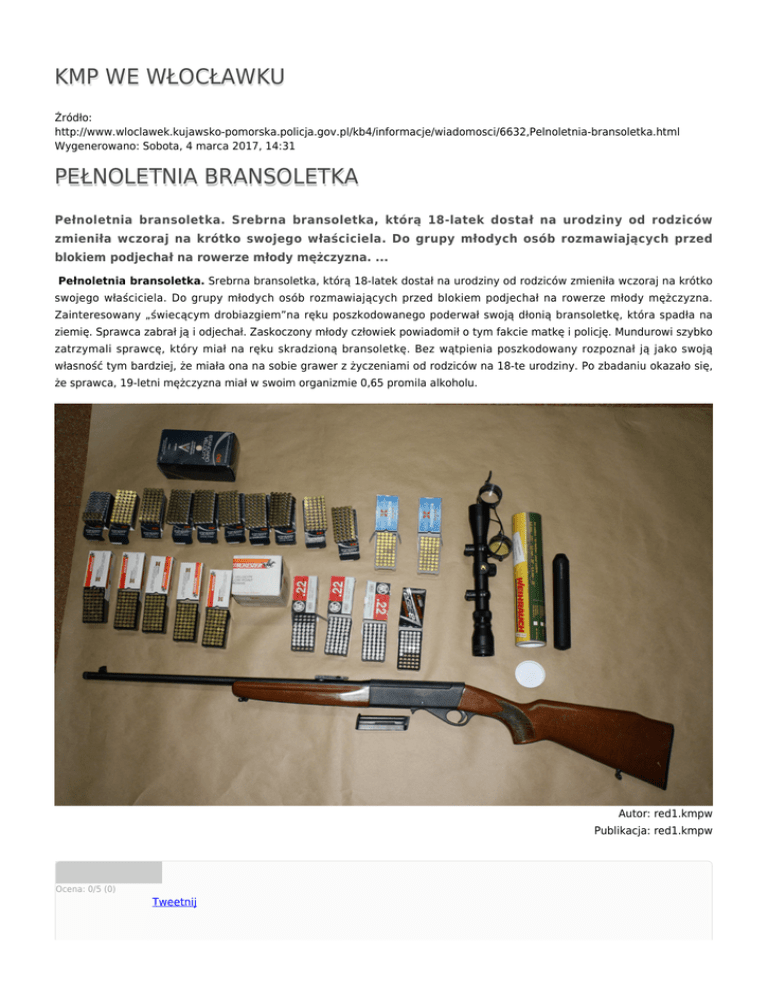 KMP WE WŁOCŁAWKU Źródło: http://www.wloclawek.kujawsko-pomorska.policja.gov.pl/kb4/informacje/wiadomosci/6632,Pelnoletnia-bransoletka.html Wygenerowano: Sobota, 4 marca 2017, 14:31 PEŁNOLETNIA BRANSOLETKA Pełnoletnia bransoletka. Srebrna bransoletka, którą 18-latek dostał na urodziny od rodziców zmieniła wczoraj na krótko swojego właściciela. Do grupy młodych osób rozmawiających przed blokiem podjechał na rowerze młody mężczyzna. ... Pełnoletnia bransoletka. Srebrna bransoletka, którą 18-latek dostał na urodziny od rodziców zmieniła wczoraj na krótko swojego właściciela. Do grupy młodych osób rozmawiających przed blokiem podjechał na rowerze młody mężczyzna. Zainteresowany „świecącym drobiazgiem”na ręku poszkodowanego poderwał swoją dłonią bransoletkę, która spadła na ziemię. Sprawca zabrał ją i odjechał. Zaskoczony młody człowiek powiadomił o tym fakcie matkę i policję. Mundurowi szybko zatrzymali sprawcę, który miał na ręku skradzioną bransoletkę. Bez wątpienia poszkodowany rozpoznał ją jako swoją własność tym bardziej, że miała ona na sobie grawer z życzeniami od rodziców na 18-te urodziny. Po zbadaniu okazało się, że sprawca, 19-letni mężczyzna miał w swoim organizmie 0,65 promila alkoholu. Autor: red1.kmpw Publikacja: red1.kmpw Ocena: 0/5 (0) Tweetnij