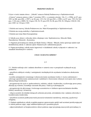 PRZEPISY OGÓLNE Użyte w treści statutu słowa : „Szkoła" oznacza Szkołę Podstawową w Sędzimirowicach „Ustawa" oznacza ustawę z dnia 7 września 1991 r. o systemie oświaty / Dz. U. z 1996r. nr 67, poz. 329 i nr l06. poz.496. z 1997 r. nr 28, poz. 153 i Nr 141 poz.943, z 1998 r. nr ll7. poz. 759 i Nr 162, poz. l 126 oraz z 2000 r Nr 12,poz.136, Nr 19, poz.239, Nr 48, poz.550, Nr 104,poz.1104,Nr 120, poz.1268 i nr 122,poz.1320/. §1 1.Szkoła nosi nazwę; Szkoła Podstawowa im. Marii Konopnickiej w Sędzimirowicach. 2.Szkoła ma swoją siedzibę w Sędzimirowicach. 3.Szkoła nosi imię Marii Konopnickiej 4. Szkoła uczy dzieci z obwodu, który obejmuje wsie: Sędzimirowice, Mroczki Małe, Nacesławice, Morawki , Korzenica. 5. Organem prowadzącym szkołę jest Rada Gminy i Miasta - Błaszki, która sprawuje nadzór nad działalnością szkoły w zakresie spraw finansowych i administracyjnych. 6. Organ prowadzący szkołę może ingerować w działalność szkoły wyłącznie w zakresie i na zasadach określonych w ustawie. CELE I ZADANIA SZKOŁY §2 2.1. Szkoła realizuje cele i zadania określone w ustawie oraz w przepisach wydanych na jej podstawie . - umożliwia zdobycie wiedzy i umiejętności niezbędnych do uzyskania świadectwa ukończenia szkoły. -wyrabia umiejętności rozumnego wykorzystywania uzyskanej wiedzy w życiu codziennym i celowego spożytkowania zainteresowań i uzdolnień w kierowaniu własnym rozwojem oraz wyboru dalszej drogi kształcenia. - przygotowuje do życia w społeczeństwie, rodzinie, szkole i środowisku; wychowując przez pracę ukazuje jej wartości, kształtuje szacunek dla pracy i ludzi ją wykonujących. - przygotowuje do aktywnego i twórczego uczestnictwa w kulturze upowszechnianiu dorobku kultury narodowej i światowej. - włącza uczniów do działań służących ochronie przyrody, uświadamia rolę i zadania człowieka w kształtowaniu środowiska. - umożliwia uczniom podtrzymywania poczucia tożsamości narodowej, etnicznej, językowej i religijnej. 2. Zadania opiekuńcze szkoła wypełnia poprzez sprawowanie opieki nad uczniami przebywającymi w szkole podczas zajęć, zajęć nadobowiązkowych i pozalekcyjnych. - odpowiedzialność za bezpieczeństwo dzieci podczas zajęć przyjmują nauczyciele prowadzący te zajęcia. • odpowiedzialność za bezpieczeństwo dzieci podczas przerw przyjmują nauczyciele dyżurni. - dyżury w szkole nauczyciele pełnią: * na pierwszej zmianie od 7.40-1 1.55. * na drugiej zmianie od 12.00-16.50 po jednym nauczycielu na każdym korytarzu • odpowiedzialność za bezpieczeństwo dzieci podczas wycieczek organizowanych poza teren szkoły przyjmują nauczyciele organizujący te wycieczki, przy czym: a/ nauczyciel wychodzący poza teren szkoły każdorazowo zgłasza swoje wyjście dyrektorowi szkoły b/ na wycieczki poza teren szkoły n-1 zabiera 15 uczniów. Jeżeli liczba uczniów w klasie jest większa, dyrektor wyznacza na opiekuna drugiego nauczyciela lub wyraża zgodę aby funkcję pełnił rodzic. Dziećmi z oddziału przedszkolnego opiekuje się n-l oddziału. Dyrektor szkoły powierza każdy oddział szczególnej opiece wychowawczej jednemu z nauczycieli uczących w tym oddziale. Nauczyciel pełni wychowawstwo od klasy I do III ,a w klasach starszych od klasy IV do VI. Rodzice uczniów danej klasy mogą wyrażać opinie o pracy wychowawcy . / patrz § 12 ust 4 /. 4. Uczniom z rodzin wielodzietnych i żyjących w bardzo trudnych warunkach Rada Rodziców może udzielić pomocy materialnej w formie: • bezpłatnych paczek na choinkę • bezpłatnego dożywiania w okresie zimy • bezpłatnych biletów wstępu na imprezy organizowane przez szkołę • zwolnienia z opłat na Radę Rodziców Szkoła współpracuje z Miejsko- Gminnym Ośrodkiem Pomocy Społecznej w Błaszkach. Uczniowie, którym potrzebna jest pomoc i wsparcie korzystają: • z darmowego posiłku , • ze szkolnych podręczników , • z pomocy materialnej w formie zakupu odzieży. 5.Szkoła we współpracy z Poradnią Psychologiczno-Pedagogiczną w Sieradzu udziela pomocy psychologicznej i pedagogicznej. Celem pomocy udzielanej uczniom jest wspomaganie rozwoju psychicznego i efektywności uczenia się, w szczególności przez wyrównywanie i korygowanie braków w opanowaniu programu nauczania. Pomoc psychologiczna i pedagogiczna udzielana jest na wniosek nauczyciela, rodziców /opiekunów prawnych/. Pomoc psychologiczna i pedagogiczna w szkole jest organizowana w formie zajęć dydaktyczno-wyrównawczych. Zajęcia te prowadzone są przez nauczyciela właściwego przedmiotu obowiązkowego. Liczba uczestników wynosi od 3 do 6 . Kwalifikacji uczniów na zajęcia dydaktyczno-wyrównawcze dokonuje nauczyciel danego przedmiotu. 6.Rodzice i nauczyciele współdziałają ze sobą w sprawach wychowania i kształcenia dzieci. Rodzice są głównymi partnerami szkoły w realizacji procesu wychowawczego i ponoszą współodpowiedzialność za postawy własnych dzieci. Rodzice mają prawo do: a/ znajomości zadań i zamierzeń dydaktycznych i wychowawczych w danej klasie i szkole b/ znajomości przepisów dotyczących oceniania , klasyfikowania i promowania uczniów oraz przeprowadzania egzaminów, c/ uzyskiwania w każdym czasie rzetelnej informacji na temat swojego dziecka, jego zachowania, postępów i przyczyn trudności w nauce , d/ uzyskiwania informacji i porad w sprawach wychowawczych i dalszego kształcenia swoich dzieci , e/ wyrażania i przekazywania organowi prowadzącemu i nadzorującemu opinii na temat pracy szkoły W celu realizacji punktów dyrektor szkoły organizuje nie mniej niż raz na kwartał spotkania z rodzicami. Wychowawcy klas organizują takie spotkania nie mniej niż raz na dwa miesiące. 2. Program wychowawczy szkoły i program profilaktyki . Uczeń powinien w szkole znaleźć środowisko wszechstronnego rozwoju osobowego , rozwijać w sobie dociekliwość poznawczą ( poszukiwać prawdy, dobra i piękna w 
