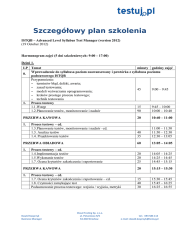 Szczegółowy plan szkolenia ISTQB – Advanced Level Syllabus Test Manager (version 2012) (19 October 2012) Harmonogram zajęć (5 dni szkoleniowych: 9:00 – 17:00) Dzień 1. LP Temat minuty godziny zajęć Wprowadzenie do syllabusa poziom zaawansowany i powtórka z syllabusa poziomu 0. podstawowego ISTQB Przypomnienie: – terminów błąd, defekt, awaria; – zasad testowania; 45 9:00 – 9:45 – modeli wytwarzania oprogramowania; – kroków prostego procesu testowego; – technik testowania 1. Proces testowy 1.1.Wstęp 15 9:45 – 10:00 1.2.Planowanie testów, monitorowanie i nadzór 90 10:00 – 10:40 PRZERWA KAWOWA 1. Proces testowy – cd. 1.3.Planowanie testów, monitorowanie i nadzór –cd. 1.3. Analiza testów 1.4. Projektowanie testów PRZERWA OBIADOWA 1. Proces testowy – cd. 1.4.Implementacja testów 1.5.Wykonanie testów 1.7. Ocena kryteriów zakończenia i raportowanie PRZERWA KAWOWA 1. Proces testowy – cd. 1.7. Ocena kryteriów zakończenia i raportowanie – cd. 1.8. Czynności zamykające test Podsumowanie procesu testowego: wejścia / wyjścia, metryki Dawid Kasprzyk Business Manager Cloud Testing Sp. z o.o. ul. Petuniowa 9/5 53-238 Wrocław 20 10:40 – 11:00 40 35 11:00 – 11:50 11:50 – 12:30 12:30 – 13:05 60 13:05 – 14:05 20 20 25 14:05 – 14:25 14:25 – 14:45 14:45 – 15:15 20 15:15 – 15:30 15 40 30 15:30 – 15:45 15:45 – 16:25 16:25 – 16:55 tel.: 693 586 112 e-mail: [email protected] Dzień 2. LP Temat 2. Zarządzanie testami 2.1. Wstęp 2.2. Zarządzanie testami w kontekście 2.2.1. Zrozumienie interesariuszy testowania 2.2.2. Dodatkowe działania cyklu życia wytwarzania oprogramowania i produkty pracy 2.2.3. Zestrojenie czynności testowych i innych czynności cyklu życia 2.2.4. Zarządzanie testowaniem niefunkcjonalnym minuty godziny zajęć PRZERWA KAWOWA 2. Zarządzanie testami – cd. 2.2. Zarządzanie testami w kontekście – cd. 2.2.5. Zarządzanie testowaniem opartym na doświadczeniu 2.3. Testowanie w oparciu o analizę ryzyka i inne podejścia do priorytetyzacji i przydzielania prac związanych z testowaniem 2.3.1. Testowanie oparte na ryzyku 2.3.2. Techniki testowana opartego na ryzyku PRZERWA OBIADOWA 2. Zarządzanie testami – Test Management cd. 2.3. Testowanie w oparciu o analizę ryzyka i inne podejścia do priorytetyzacji i przydzielania prac związanych z testowaniem – cd. 2.3.2. Techniki testowana opartego na ryzyku – cd. 2.3.3. Inne techniki wyboru testów 2.3.4. Priorytetyzacja testów i przydzielanie prac w procesie testowym 2.4. Dokumentacja testowa i inne produkty pracy PRZERWA KAWOWA 2. Zarządzanie testami – cd. 2.4. Dokumentacja testowa i inne produkty pracy – cd. 2.4.1. Polityka testów 2.4.2. Strategia testowa 2.4.3. Główny plan testów 2.4.4. Plan testów jednego poziomu 2.4.5. Zarządzanie ryzykiem projektowym 2.4.6. Inne produkty testowania 2.5. Szacowanie testów Dawid Kasprzyk Business Manager Cloud Testing Sp. z o.o. ul. Petuniowa 9/5 53-238 Wrocław 5 9:00 – 9:05 15 9:05 – 9:20 30 9:20 – 9:50 30 9:50 – 10:20 20 10:20 – 10:40 20 10:40 – 11:00 20 11:00 – 11:20 65 25 11:20 – 12:25 12:25 – 12:50 60 12:50 – 13:50 20 30 13:50 – 14:10 14:10 – 14:40 10 14:40 – 14:50 10 14:50 – 15:00 20 15:00 – 15:20 20 10 15 25 10 5 15 15:20 – 15:40 15:40 – 15:50 15:50 – 16:05 16:05 – 16:30 16:30 – 16:40 16:40 – 16:45 16:45 – 17:00 tel.: 693 586 112 e-mail: [email protected] Dzień 3. LP Temat 2. Zarządzanie testami – cd. 2.5. Szacowanie testów – cd. 2.6. Definiowanie i wykorzystywanie metryk testowych 2.7. Wartość biznesowa testowania 2.8. Testowanie rozproszone, zlecone na zewnątrz, zlecone wewnątrz minuty godziny zajęć 30 35 40 10 9:00 – 9:30 9:30 – 10:05 10:05 – 10:45 10:45 – 10:55 PRZERWA KAWOWA 20 10:55 – 11:15 20 11:15 – 11:35 10 20 30 15 11:35 – 11:45 11:45 – 12:05 12:05 – 12:35 12:35 – 12:50 60 12:50 – 13:50 45 13:50 – 14:35 25 14:35 – 15:00 20 15:00 – 15:20 50 15:20 – 16:10 25 16:10 – 16:35 20 16:35 – 16:55 2. 3. Zarządzanie testami – cd. 2.9. Zarządzanie z zastosowaniem norm branżowych Przeglądy 3.1. Wprowadzenie 3.2. Przegląd kierowniczy a audyty 3.3. Zarządzanie przeglądem 3.4. Metryki przeglądów PRZERWA OBIADOWA 3. 4. Przeglądy – cd. 3.5. Zarządzanie przeglądem formalnym Zarządzanie defektami 4.1. Wprowadzenie PRZERWA KAWOWA 4. Zarządzanie defektami – cd. 4.2. Cykl życia defektu i cykl procesu wytwórczego 4.2.1. Cykl Życia i Stany Defektu 4.2.2. Zarządzanie błędnymi i zduplikowanymi raportami defektów 4.2.3. Międzyfunkcjonalne zarządzanie defektami Dawid Kasprzyk Business Manager Cloud Testing Sp. z o.o. ul. Petuniowa 9/5 53-238 Wrocław tel.: 693 586 112 e-mail: [email protected] Dzień 4. LP Temat 4. Zarządzanie defektami – cd. 4.3. Atrybuty defektów 4.4. Ocena zdolności procesu przy użyciu atrybutów defektów 5. Doskonalenie procesu testowania 5.1. Wprowadzenie 5.2. Proces doskonalenia testowania 5.2.1. Wprowadzenie do doskonalenia procesu minuty godziny zajęć PRZERWA KAWOWA 5. Doskonalenie procesu testowania – cd. 5.2.2. Typy doskonalenia procesu 5.3. Doskonalenie procesu testowania 5.4. Doskonalenie procesu testowego z użyciem modelu TMMi 5.5. Doskonalenie procesu testowania z użyciem TPI Next PRZERWA OBIADOWA 5. Doskonalenie procesu testowania – cd. 5.6. Doskonalenie procesu testowania z użyciem CTP 5.7. Doskonalenie procesu testowania z użyciem STEP Podsumowanie udoskonalania procesu testowania – porównianie modeli TMMi, TPI Next, CTP i STEP PRZERWA KAWOWA 6. Narzędzia testowe i automatyzacja 6.1. Wprowadzenie 6.2. Wybór narzędzia 6.2.1. Narzędzia o otwartym kodzie 6.2.2. Narzędzia własne 6.2.3. Zwrot z inwestycji (ROI) 6.2.4. Proces wyboru Dawid Kasprzyk Business Manager Cloud Testing Sp. z o.o. ul. Petuniowa 9/5 53-238 Wrocław 45 30 9:00 – 9:45 9:45 – 10:15 15 10:15 – 10:30 10 10:30 – 10:40 20 10:40 – 11:00 20 30 40 35 11:00 – 11:20 11:2