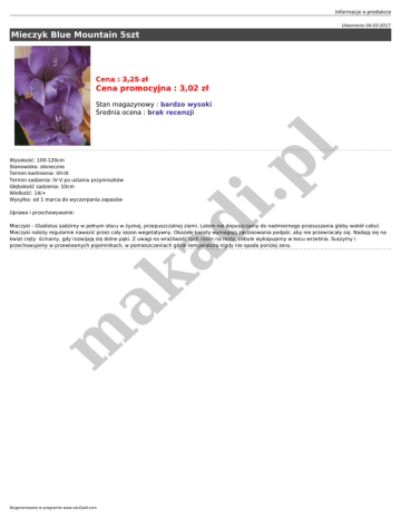 Informacje o produkcie Utworzono 04-03-2017 Mieczyk Blue Mountain 5szt Cena : 3,25 zł Cena promocyjna : 3,02 zł l Stan magazynowy : bardzo wysoki Średnia ocena : brak recenzji i.p Wysokość: 100-120cm Stanowisko: słoneczne Termin kwitnienia: VII-IX Termin sadzenia: IV-V po ustaniu przymrozków Głębokość sadzenia: 10cm Wielkość: 14/+ Wysyłka: od 1 marca do wyczerpania zapasów ad Uprawa i przechowywanie: m ak Mieczyki - Gladiolus sadzimy w pełnym słocu w żyznej, przepuszczalnej ziemi. Latem nie dopuszczamy do nadmiernego przesuszania gleby wokół cebul. Mieczyki należy regularnie nawozić przez cały sezon wegetatywny. Okazałe kwiaty wymagają zastosowania podpór, aby nie przewracały się. Nadają się na kwiat cięty ścinamy, gdy rozwijają się dolne pąki. Z uwagi na wrażliwość tych roślin na mróz, cebule wykopujemy w kocu września. Suszymy i przechowujemy w przewiewnych pojemnikach, w pomieszczeniach gdzie temperatura nigdy nie spada poniżej zera. Wygenerowano w programie www.oscGold.com