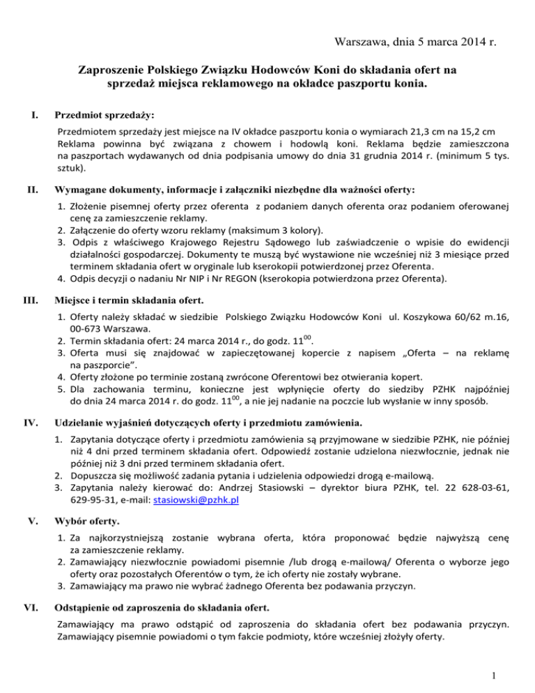 Warszawa, dnia 5 marca 2014 r. Zaproszenie Polskiego Związku Hodowców Koni do składania ofert na sprzedaż miejsca reklamowego na okładce paszportu konia. I. Przedmiot sprzedaży: Przedmiotem sprzedaży jest miejsce na IV okładce paszportu konia o wymiarach 21,3 cm na 15,2 cm Reklama powinna być związana z chowem i hodowlą koni. Reklama będzie zamieszczona na paszportach wydawanych od dnia podpisania umowy do dnia 31 grudnia 2014 r. (minimum 5 tys. sztuk). II. Wymagane dokumenty, informacje i załączniki niezbędne dla ważności oferty: 1. Złożenie pisemnej oferty przez oferenta z podaniem danych oferenta oraz podaniem oferowanej cenę za zamieszczenie reklamy. 2. Załączenie do oferty wzoru reklamy (maksimum 3 kolory). 3. Odpis z właściwego Krajowego Rejestru Sądowego lub zaświadczenie o wpisie do ewidencji działalności gospodarczej. Dokumenty te muszą być wystawione nie wcześniej niż 3 miesiące przed terminem składania ofert w oryginale lub kserokopii potwierdzonej przez Oferenta. 4. Odpis decyzji o nadaniu Nr NIP i Nr REGON (kserokopia potwierdzona przez Oferenta). III. Miejsce i termin składania ofert. 1. Oferty należy składać w siedzibie Polskiego Związku Hodowców Koni ul. Koszykowa 60/62 m.16, 00-673 Warszawa. 2. Termin składania ofert: 24 marca 2014 r., do godz. 1100. 3. Oferta musi się znajdować w zapieczętowanej kopercie z napisem „Oferta – na reklamę na paszporcie”. 4. Oferty złożone po terminie zostaną zwrócone Oferentowi bez otwierania kopert. 5. Dla zachowania terminu, konieczne jest wpłynięcie oferty do siedziby PZHK najpóźniej do dnia 24 marca 2014 r. do godz. 1100, a nie jej nadanie na poczcie lub wysłanie w inny sposób. IV. Udzielanie wyjaśnień dotyczących oferty i przedmiotu zamówienia. 1. Zapytania dotyczące oferty i przedmiotu zamówienia są przyjmowane w siedzibie PZHK, nie później niż 4 dni przed terminem składania ofert. Odpowiedź zostanie udzielona niezwłocznie, jednak nie później niż 3 dni przed terminem składania ofert. 2. Dopuszcza się możliwość zadania pytania i udzielenia odpowiedzi drogą e-mailową. 3. Zapytania należy kierować do: Andrzej Stasiowski – dyrektor biura PZHK, tel. 22 628-03-61, 629-95-31, e-mail: [email protected] V. Wybór oferty. 1. Za najkorzystniejszą zostanie wybrana oferta, która proponować będzie najwyższą cenę za zamieszczenie reklamy. 2. Zamawiający niezwłocznie powiadomi pisemnie /lub drogą e-mailową/ Oferenta o wyborze jego oferty oraz pozostałych Oferentów o tym, że ich oferty nie zostały wybrane. 3. Zamawiający ma prawo nie wybrać żadnego Oferenta bez podawania przyczyn. VI. Odstąpienie od zaproszenia do składania ofert. Zamawiający ma prawo odstąpić od zaproszenia do składania ofert bez podawania przyczyn. Zamawiający pisemnie powiadomi o tym fakcie podmioty, które wcześniej złożyły oferty. 1