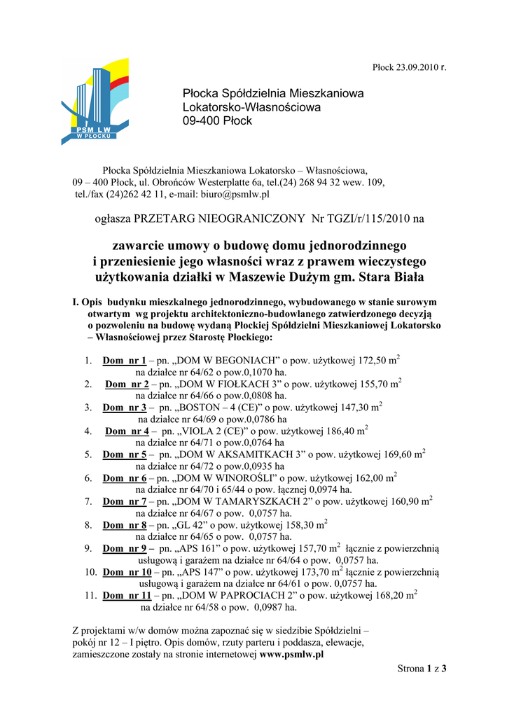 Płock 23.09.2010 r. Płocka Spółdzielnia Mieszkaniowa Lokatorsko-Własnościowa 09-400 Płock Płocka Spółdzielnia Mieszkaniowa Lokatorsko – Własnościowa, 09 – 400 Płock, ul. Obrońców Westerplatte 6a, tel.(24) 268 94 32 wew. 109, tel./fax (24)262 42 11, e-mail: [email protected] ogłasza PRZETARG NIEOGRANICZONY Nr TGZI/r/115/2010 na zawarcie umowy o budowę domu jednorodzinnego i przeniesienie jego własności wraz z prawem wieczystego użytkowania działki w Maszewie Dużym gm. Stara Biała I. Opis budynku mieszkalnego jednorodzinnego, wybudowanego w stanie surowym otwartym wg projektu architektoniczno-budowlanego zatwierdzonego decyzją o pozwoleniu na budowę wydaną Płockiej Spółdzielni Mieszkaniowej Lokatorsko – Własnościowej przez Starostę Płockiego: Dom nr 1 – pn. „DOM W BEGONIACH” o pow. użytkowej 172,50 m2 na działce nr 64/62 o pow.0,1070 ha. 2. Dom nr 2 – pn. „DOM W FIOŁKACH 3” o pow. użytkowej 155,70 m2 na działce nr 64/66 o pow.0,0808 ha. 3. Dom nr 3 – pn. „BOSTON – 4 (CE)” o pow. użytkowej 147,30 m2 na działce nr 64/69 o pow.0,0786 ha 4. Dom nr 4 – pn. „VIOLA 2 (CE)” o pow. użytkowej 186,40 m2 na działce nr 64/71 o pow.0,0764 ha 5. Dom nr 5 – pn. „DOM W AKSAMITKACH 3” o pow. użytkowej 169,60 m2 na działce nr 64/72 o pow.0,0935 ha 6. Dom nr 6 – pn. „DOM W WINOROŚLI” o pow. użytkowej 162,00 m2 na działce nr 64/70 i 65/44 o pow. łącznej 0,0974 ha. 7. Dom nr 7 – pn. „DOM W TAMARYSZKACH 2” o pow. użytkowej 160,90 m2 na działce nr 64/67 o pow. 0,0757 ha. 8. Dom nr 8 – pn. „GL 42” o pow. użytkowej 158,30 m2 na działce nr 64/65 o pow. 0,0757 ha. 9. Dom nr 9 – pn. „APS 161” o pow. użytkowej 157,70 m2 łącznie z powierzchnią usługową i garażem na działce nr 64/64 o pow. 0,0757 ha. 10. Dom nr 10 – pn. „APS 147” o pow. użytkowej 173,70 m2 łącznie z powierzchnią usługową i garażem na działce nr 64/61 o pow. 0,0757 ha. 11. Dom nr 11 – pn. „DOM W PAPROCIACH 2” o pow. użytkowej 168,20 m2 na działce nr 64/58 o pow. 0,0987 ha. 1. Z projektami w/w domów można zapoznać się w siedzibie Spółdzielni – pokój nr 12 – I piętro. Opis domów, rzuty parteru i poddasza, elewacje, zamieszczone zostały na stronie internetowej www.psmlw.pl Strona 1 z 3 II. Cena wywoławcza w zł netto. Do ceny wywoławczej zostanie doliczony podatek VAT obowiązujący w dniu wystawienia faktury Nr domu Cena wywoławcza 1 195.500,00 zł + podatek VAT 2 171.500,00 zł + podatek VAT 3 164.500,00 zł + podatek VAT 4 192.000,00 zł + podatek VAT 5 189.500,00 zł + podatek VAT 6 186.000,00 zł + podatek VAT 7 172.500,00 zł + podatek VAT 8 170.500,00 zł + podatek VAT 9 169.500,00 zł + podatek VAT 10 182.000,00 zł + podatek VAT 11 191.500,00 zł + podatek VAT III. Wadium 1. Wadium w kwocie 10.000,00 zł na każdy dom należy wpłacić w formie pieniądza na konto Bank PEKAO S.A. I o/Płock 67 1240 3174 1111 0000 2890 6261 Wadium nie podlega oprocentowaniu. 2. Wadium osoby wygrywającej przetarg podlega zaliczeniu w cenę za nabywaną nieruchomość, a pozostałym osobom, które przetargu nie wygrały, zostaje zwrócone w terminie 7dni od dnia rozstrzygnięcia przetargu. 3. Wadium osoby której oferta została wybrana przepada w przypadku uchylenia się od zawarcia umowy o budowę domu. IV. Termin do którego można składać oferty oraz miejsce złożenia Oferty należy składać w siedzibie Spółdzielni – sekretariat, I piętro – w terminie do dnia 20.10.2010r. do godziny 10OO V. Warunki zawarcia umowy 1. Zawarcie umowy o budowę domu uzależnione jest od zapłaty połowy oferowanej ceny, a przeniesienie własności domu wraz z prawem wieczystego użytkowania działki uzależnione jest od zapłaty całości ceny powiększonej o podatek VAT w wysokości obowiązującej w dniu wystawienia faktury. 2. Wybrany oferent pokrywa koszty i opłaty związane z nabyciem w formie aktu notarialnego. Strona 2 z 3 VI. Warunki udziału w przetargu 1. W przetargu może wziąć udział osoba fizyczna posiadająca pełną zdolność do czynności prawnych, osoba prawna oraz jednostka organizacyjna nie będąca osobą prawną, którym ustawa przyznaje zdolność prawną. W przetargu mogą wziąć udział również osoby fizyczna nie posiadające pełnej zdolności do czynności prawnych i wówczas to działają one poprzez przedstawicieli ustawowych legitymujących się wymaganą zgodą na zawarcie umowy na rzecz tej osoby. 2. Złożona zostanie w wyznaczonym terminie oferta w zamkniętej kopercie w siedzibie Spółdzielni (sekretariat I piętro) oznaczona „Przetarg nieograniczony Nr TGZI/r/ 115 /2010– domy w Maszewie Dużym”. 3. W ofercie należy wskazać jeden dom, jego nazwę i nr działki oraz załączyć: a) Odpis z właściwego rejestru w przypadku osób prawnych lub jednostek organizacyjnych nie będących osobami prawnymi, którym ustawa przyznaje zdolność prawną b) Dowód wpłaty wadium c) Oświadczenie o: zapoznaniu się z pozwoleniem na budowę wraz z zatwierdzonym planem zagospodarowania działki i z projektem budowlanym domu wymienionego w ofercie nabycia, zakresem jego wykonania oraz terenem osiedla, zapoznaniu się z „Regulaminem naboru inwestorów i zawierania umowy o budowę domu jednorodzinnego w osiedlu Maszewo Duże gm. Stara Biała oraz warunków przeniesienia własności budynku wraz z prawem wieczystego użytkowania działki”, akceptacji umowy o budowę wybranego domu jednorodzinnego i warunków przeniesienia własności budynku wraz z prawem wieczystego użytkowania działki, oraz zobowiązanie w przypadku wyboru oferty nabycia. 4. Formularze: oferty nabycia i oświadczenia oraz wzór umowy – do pobrania w siedzibie Spółdzielni – pokój nr 12 na I piętrze. VII. Inne informacje 1. „Regulamin naboru inwestorów i zawierania umowy o budowę domu jednorodzinnego w osiedlu Maszewo Duże gm. Stara Biała oraz warunków przeniesienia własności budynku wraz z praw