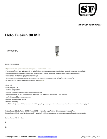 SF Piotr Jankowski Helo Fusion 80 MD 5 950.00 zÅ‚ DANE TECHNICZNE Najnowszy model ogrzewacza z automatycznÄ… wytwornicÄ… pary. Piec wyposażony jest w 4L zbiornik ze wskaźnikiem poziomu wody oraz zbiorniczkiem na olejki eteryczne lub zioÅ‚a. Posiada regulacjÄ™ kierunku wylotu pary, umieszczony z przodu w celu uÅ‚atwienia czyszczenia i serwisowania. Sterowanie z elektronicznego panelu kontrolnego. Obudowa wykonana jest ze stali chromowanej oraz aluminium, co gwarantuje dÅ‚ugÄ… żywotność. Do pieca dołączony jest sterownik zewnÄ™trzny PA20 - timer 12h - czas pracy do 12h - kontrola temperatury - kontrola wilgotnoÅ›ci za pomocÄ… osobnego czujnika - funkcja s.c.smart sauna - automatycznie dobierajÄ…ca optymalne warunki kÄ…pieli w saunie - wyÅ›wietlacz LCD z mikroprocesorem - kontrola oÅ›wietlenia w saunie - kontrola wentylacji - możliwość zapamiÄ™tania czterech ulubionych, indywidualnych ustawieÅ„ sauny pod osobnymi przyciskami funkcyjnymi Modele Fusion 60MD, Fusion 80MD, Fusion 90MD - manualne napeÅ‚nianie zbiornika parownika wodÄ…. Zestaw Fusion AD-kit umożliwia zamianÄ™ wersji MD w AD (z manualnego na automatyczny pobór wody do parownika) Zestaw Fusion AD-kit 150zÅ‚   Copyright ©2017 - SF Piotr Jankowski - http://xsine.nazwa.pl/sklep _PN_PAGE 1 _PN_OF 2 Informacja o sprzedawcy Copyright ©2017 - SF Piotr Jankowski - http://xsine.nazwa.pl/sklep _PN_PAGE 2 _PN_OF 2