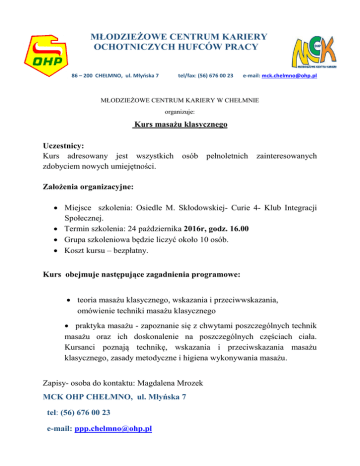 MŁODZIEŻOWE CENTRUM KARIERY OCHOTNICZYCH HUFCÓW PRACY 86 – 200 CHEŁMNO, ul. Młyńska 7 tel/fax: (56) 676 00 23 e-mail: [email protected] MŁODZIEŻOWE CENTRUM KARIERY W CHEŁMNIE organizuje: Kurs masażu klasycznego Uczestnicy: Kurs adresowany jest wszystkich osób pełnoletnich zainteresowanych zdobyciem nowych umiejętności. Założenia organizacyjne: Miejsce szkolenia: Osiedle M. Skłodowskiej- Curie 4- Klub Integracji Społecznej. Termin szkolenia: 24 października 2016r, godz. 16.00 Grupa szkoleniowa będzie liczyć około 10 osób. Koszt kursu – bezpłatny. Kurs obejmuje następujące zagadnienia programowe: teoria masażu klasycznego, wskazania i przeciwwskazania, omówienie techniki masażu klasycznego praktyka masażu - zapoznanie się z chwytami poszczególnych technik masażu oraz ich doskonalenie na poszczególnych częściach ciała. Kursanci poznają technikę, wskazania i przeciwskazania masażu klasycznego, zasady metodyczne i higiena wykonywania masażu. Zapisy- osoba do kontaktu: Magdalena Mrozek MCK OHP CHEŁMNO, ul. Młyńska 7 tel: (56) 676 00 23 e-mail: [email protected]