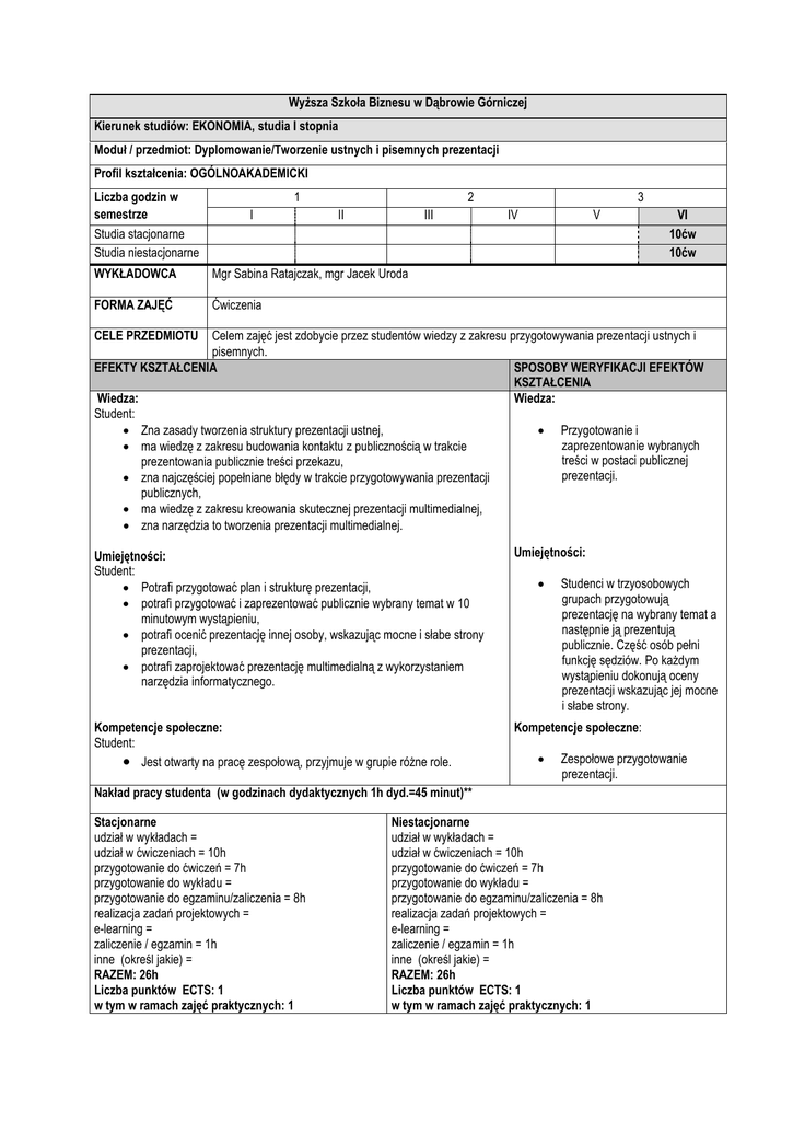 Wyższa Szkoła Biznesu w Dąbrowie Górniczej Kierunek studiów: EKONOMIA, studia I stopnia Moduł / przedmiot: Dyplomowanie/Tworzenie ustnych i pisemnych prezentacji Profil kształcenia: OGÓLNOAKADEMICKI Liczba godzin w semestrze Studia stacjonarne Studia niestacjonarne I 1 II III WYKŁADOWCA Mgr Sabina Ratajczak, mgr Jacek Uroda FORMA ZAJĘĆ Ćwiczenia 2 IV V 3 VI 10ćw 10ćw CELE PRZEDMIOTU Celem zajęć jest zdobycie przez studentów wiedzy z zakresu przygotowywania prezentacji ustnych i pisemnych. EFEKTY KSZTAŁCENIA SPOSOBY WERYFIKACJI EFEKTÓW KSZTAŁCENIA Wiedza: Wiedza: Student: • Zna zasady tworzenia struktury prezentacji ustnej, • Przygotowanie i zaprezentowanie wybranych • ma wiedzę z zakresu budowania kontaktu z publicznością w trakcie treści w postaci publicznej prezentowania publicznie treści przekazu, prezentacji. • zna najczęściej popełniane błędy w trakcie przygotowywania prezentacji publicznych, • ma wiedzę z zakresu kreowania skutecznej prezentacji multimedialnej, • zna narzędzia to tworzenia prezentacji multimedialnej. Umiejętności: Student: • Potrafi przygotować plan i strukturę prezentacji, • potrafi przygotować i zaprezentować publicznie wybrany temat w 10 minutowym wystąpieniu, • potrafi ocenić prezentację innej osoby, wskazując mocne i słabe strony prezentacji, • potrafi zaprojektować prezentację multimedialną z wykorzystaniem narzędzia informatycznego. Umiejętności: Kompetencje społeczne: Student: • Jest otwarty na pracę zespołową, przyjmuje w grupie różne role. Kompetencje społeczne: • • Studenci w trzyosobowych grupach przygotowują prezentację na wybrany temat a następnie ją prezentują publicznie. Część osób pełni funkcję sędziów. Po każdym wystąpieniu dokonują oceny prezentacji wskazując jej mocne i słabe strony. Zespołowe przygotowanie prezentacji. Nakład pracy studenta (w godzinach dydaktycznych 1h dyd.=45 minut)** Stacjonarne udział w wykładach = udział w ćwiczeniach = 10h przygotowanie do ćwiczeń = 7h przygotowanie do wykładu = przygotowanie do egzaminu/zaliczenia = 8h realizacja zadań projektowych = e-learning = zaliczenie / egzamin = 1h inne (określ jakie) = RAZEM: 26h Liczba punktów ECTS: 1 w tym w ramach zajęć praktycznych: 1 Niestacjonarne udział w wykładach = udział w ćwiczeniach = 10h przygotowanie do ćwiczeń = 7h przygotowanie do wykładu = przygotowanie do egzaminu/zaliczenia = 8h realizacja zadań projektowych = e-learning = zaliczenie / egzamin = 1h inne (określ jakie) = RAZEM: 26h Liczba punktów ECTS: 1 w tym w ramach zajęć praktycznych: 1 WARUNKI WSTĘPNE TREŚCI PRZEDMIOTU brak • • • • • • LITERATURA OBOWIĄZKOWA • • • • Struktura prezentacji publicznej Narzędzia budowania właściwego kontaktu z grupą (kontakt wzrokowy, komunikaty niewerbalne, komunikaty perswazyjne,) Najczęściej popełniane błędy w trakcie prezentacji publicznych Omówienie profesjonalnych prezentacji na przykładzie materiałów filmowych Zasady tworzenia prezentacji multimedialnych Narzędzia informatyczne wspomagające tworzenie efektownych prezentacji Wystąpienia Publiczne : Zostań mistrzem retoryki / [aut.: Nick Morgan, Michael Hattersley, John Daly et al.; przekł. Rafał Schmidtke; redakcja Radosław Madejski]. - Warszawa : Wydawnictwo Studio Emka, 2006. Prezentacje i wystąpienia : w public relations / Anna Murdoch. - Warszawa : Poltext, 2004. Prezentacja, która robi wrażenie. Projekty z klasą / Robin Williams – Gliwice : Wydawnictwo Helion 2011 Profesjonalna prezentacja multimedialna. Jak uniknąć 27 najczęściej popełnianych błędów / Paweł Lenar - Gliwice : Wydawnictwo Helion 2010 LITERATURA UZUPEŁNIAJĄCA METODY NAUCZANIA • WWW.ted.com.pl (przykłady profesjonalnych prezentacji) • WWW.prezi.com (internetowe narzędzie do kreowania prezentacji multimedialnych) Zajęcia warsztatowe, praca indywidualna i grupowa, wykonywanie publicznych prezentacji na wybrany temat. POMOCE NAUKOWE PROJEKT (o ile jest realizowany w ramach modułu zajęć) SPOSÓB ZALICZENIA Rzutmik mulimedialny, flipchart FORMA ZALICZENIA Nie dotyczy Zaliczenie na ocenę • • Ocena wystąpień publicznych przygotowanych przez studentów, warunkiem uzyskania zaliczenia jest zdobycie pozytywnej oceny ze wszystkich form zaliczenia przewidzianych w programie zajęć z uwzględnieniem kryteriów ilościowych oceniania określonych w Ramowym Systemie Ocen Studentów w Wyższej Szkole Biznesu w Dąbrowie Górniczej.