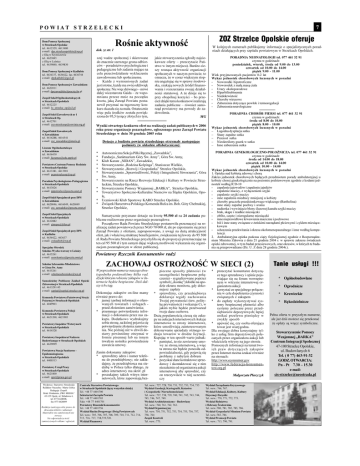 P O W I A T 7 S T R Z E L E C K I ZOZ Strzelce Opolskie oferuje Ronie aktywnoæ Dom Pomocy Spo³ecznej w Strzelcach Opolskie tel. 4612329, 4613480 e-mail: [email protected] z fili¹ w Szymiszowie niach dzia³aj¹cych przy szpitalu powiatowym w Strzelcach Opolskich. dok. ze str. 1 tel. 4623845 szej wadze spo³ecznej i skierowane z fili¹ w Lenicy do znacznie szerszego grona odbior- Dom Pomocy Spo³ecznej w Kad³ubie tel. 4636337, 4636422, fax 4636744 e-mail: [email protected] Dom Pomocy Spo³ecznej w Zawadzkiem tel. 4622011 e-mail: [email protected] Zespó³ Szkó³ Ogólnokszta³c¹cych w Strzelcach Opolskich spo³ecznych w naszym powiecie; to oznacza, ¿e w coraz wiêkszym stop- Ka¿de z wymienionych zadañ niu anga¿uj¹c siê w sprawy rodowi- jest istotne, ka¿de ma swój oddwiêk ska, szukaj¹ nowych róde³ finanso- spo³eczny. Nic wiêc dziwnego mówi dalej wicestarosta Gaida ¿e wspomniana przeze mnie na pocz¹tku kurs okaza³a siê za ma³a. Ostatecznie Zespó³ Szkó³ Zawodowych nr 1 - Noworodki hipotroficzne - Noworodek z ma³¹ mas¹ cia³a Urazy oko³oporodowe noci statutowej. A ¿e dzieje siê to - Hiperbilirubinemia - Niedokrwistoæ cie¿ dziêki temu konkursowi realizuj¹ - Choroby wirusowe - Zaburzenia dotycz¹ce pow³ok i termoregulacji - Zaburzenia neurologiczne rz¹d powiatowy ma powody do zadowolenia. szona do 95,5 tysiêcy z³otych (o tym, w Strzelcach Op. Wykaz jednostek chorobowych leczonych w poradni - zadania publiczne równie¿ samo- wiêc pula rodków zosta³a powiêk- pi¹tek 9.00 - 11.00 Wiek przyjmowanych pacjentów 0-2 lat wania i rozszerzania swojej dzia³al- przy obopólnej korzyci bo prze- kwota, jak¹ Zarz¹d Powiatu postanowi³ przyznaæ na tegoroczny kon- czwartek od 10.00 do 14.00 szy rosn¹ca aktywnoæ organizacji zawodowemu lub spo³ecznemu. e-mail: [email protected] poniedzia³ek, wtorek, roda od 9.00 do 13.00 stwo w innym miejscu). Bardzo cie- celu przeciwdzia³anie wykluczeniu tel. 4612225 czynna w godzinach: kawsze oferty przeczytacie Pañ- pedagogiczne lub zadania maj¹ce na - PORADNIA NEONATOLOGII tel. 077 461 32 91 jakie stowarzyszenia zg³osi³y najcie- ców poradnictwo psychologiczne i tel. 4639840, 4639830 W kolejnych numerach publikujemy informacje o specjalistycznych porad- PORADNIA CHORÓB PIERSI tel. 077 461 32 91 MG czynna w godzinach: roda od 8.00 do 10.00 tel. 4612701 e-mail: [email protected] Wyniki otwartego konkursu ofert na realizacjê zadañ publicznych w 2006 roku przez organizacje pozarz¹dowe, og³oszonego przez Zarz¹d Powiatu Zespó³ Szkó³ Zawodowych Strzeleckiego w dniu 30 grudnia 2005 roku w Zawadzkiem tel. 4616288, 4616541 e-mail: [email protected] * tel. 4616430 * e-mail: [email protected] * Powiatowe Centrum Pomocy Rodzinie w Strzelcach Opolskie e-mail: [email protected] Poradnia Psychologiczno-Pedagogiczna tel. 4613026 e-mail: [email protected] Zespó³ Szkó³ Specjalnych przy DPS w Zawadzkiem * * * tel. 4620046, 4616049, 4620049 e-mail: [email protected] Zespó³ Szkó³ Specjalnych e-mail: [email protected] w Kad³ubie w. Anny, Stowarzyszenie na Rzecz Rozwoju Edukacji i Kultury w Powiecie Strzeleckim, Strzelce Opolskie, Stowarzyszenie Pomocy Wzajemnej BARKA, le, Uczniowski Klub Sportowy KARO Strzelce Opolskie. Zwi¹zek Harcerstwa Polskiego Komenda Hufca im. Boh. Góry Che³mskiej, Strzelce Opolskie, e-mail: [email protected] Zdrowotnej w Strzelcach Opolskich tel. 4613291-95 e-mail: [email protected] Komenda Powiatowa Pañstwowej Stra¿y Po¿arnej w Strzelcach Opolskich Komenda Powiatowa Policji równie¿ prawo do: * potwierdzenie z³o¿enia zamówie- nia. Nie póniej ni¿ w chwili do- Powiatowy Inspektorat Nadzoru formie pisemnej lub na innym stawy powinnimy otrzymaæ w Budowlanego w Strzelcach Opolskich trwa³ym noniku potwierdzenie zawarcia umowy. kowym tencji. 2. Ambulatoryjna opieka podczas ci¹¿y fizjologicznej zgodnie z Rozporz¹dze- niem Ministra Zdrowia z dnia 21 grudnia 2004 r. w sprawie zakresu wiadczeñ opieki zdrowotnej, w tym badañ przesiewowych, oraz okresów, w których te bada- nu do przedsiêbiorcy; nie zak³a- dzibê w Polsce tylko dlatego, ¿e dajmy, ¿e przedsiêbiorca ma sie- w Strzelcach Opolskich * * * * twoje dane osobowe. które umo¿liwiaj¹ zainteresowanym dokonywanie sprzeda¿y ró¿nego ro- dzaju towarów w drodze licytacji. Kupuj¹c w ten sposób warto jednak: * pamiêtaæ, ¿e nie zawieramy umowy ze stron¹ internetow¹, a wiêc powiedzialnoci, gdy pojawi¹ siê * adres internetowy ma skrót .pl poszukajmy takich witryn inter- netowych, które zapewniaj¹ bez- problemy z nabytym dobrem pozyskaæ dane kontaktowe sprze- dawcy i skontaktowaæ siê z nim niezale¿nie od organizatora aukcji internetowej aby sprawdziæ, czy ce tego sprzedawcy i opinie poja- wiaj¹ce siê na forum wewnêtrz- * ganizatora aukcji * Ogrodnicze nia w celu dope³nienia czynnoci * Krawieckie * Rêkodzielnicze korzystaæ ze specjalnego po³¹czezwi¹zanych z zakupem do zap³aty wykorzystywaæ sys- temy bezpiecznej p³atnoci albo siêbiorców depozytowych; lepiej unikaæ przelewu pieniêdzy w * zwyk³y sposób upewniæ siê, czy osoba oferuj¹ca towar jest wiarygodna. Dla swojego dobra korzystajmy tylko z us³ug firm depozytowych polecanych przez organizatora aukcji lub w³aciciela witryny na jego stronie. Pomocnych informacji na temat twoich praw dotycz¹cych na stronach: http://www.econsumer.gov h t t p : / / w w w. f e d e r a c j a - k o n s u m e n tow.org.pl czy Tel. wew.: 727, 728, 730, 731, 732, 733, 734, 735 zakupów przez Internet mo¿na szukaæ równie¿ on rzeczywicie w niej uczestni- Centrala Starostwa Powiatowego Ogólnobudowlane systemy polecane przez przed- py na aukcjach internetowych Aukcje internetowe to strony internetowe, Tanie us³ugi !!! przeczytaæ komentarze dotycz¹- nym w witrynie internetowej or- Du¿¹ popularnoci¹ ciesz¹ siê zaku- sprawdmy adres i numer telefo- Powiatowy Urz¹d Pracy zwraca. inne nieprawid³owe krwawienia maciczne i pochwowe deklaruje regu³y zachowania ta st