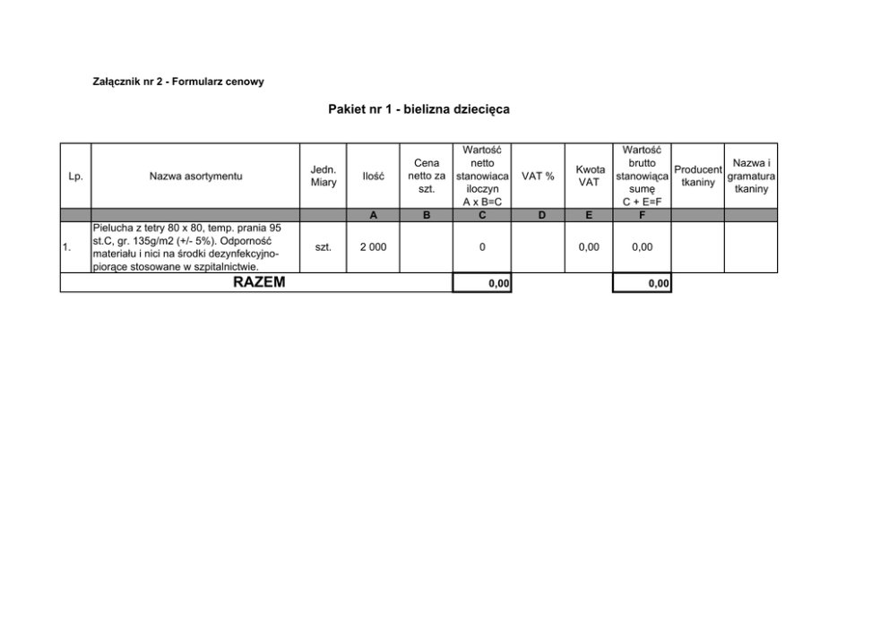 Załącznik nr 2 - Formularz cenowy Pakiet nr 1 - bielizna dziecięca Lp. 1. Nazwa asortymentu Pielucha z tetry 80 x 80, temp. prania 95 st.C, gr. 135g/m2 (+/- 5%). Odporność materiału i nici na środki dezynfekcyjnopiorące stosowane w szpitalnictwie. RAZEM Jedn. Miary szt. Ilość Cena netto za szt. A B 2 000 Wartość netto stanowiaca iloczyn A x B=C C 0 VAT % Kwota VAT DD E 0,00 0,00 Wartość brutto Nazwa i Producent stanowiąca gramatura tkaniny sumę tkaniny C + E=F F 0,00 0,00 Załącznik nr 2 - Formularz cenowy Pakiet nr 2 - bielizna dziecięca Lp. 1. Nazwa asortymentu Kaftanik bawełniany kolorowy, rozmiar 62, zap. z przodu, temp. prania 60 st.C. Odporność materiału i nici na środki dezynfekcyjno-piorące stosowane w szpitalnictwie. Jedn. Miary szt. Ilość Cena netto za szt. A B 350 RAZEM Wymogi: *wykurcz tkaniny do 5 % po 5 praniach, *guziki odporne na maglowanie przy temp. 200°C, Wymagane dokumenty należy dołączyć do oferty: 1.Karta parametrów technicznych tkaniny wystawiona przez producenta. Wartość netto stanowiąca iloczyn A x B=C C 0,00 0,00 VAT % Kwota VAT D E 0,00 Wartość brutto Nazwa i Producent stanowiąca gramatura tkaniny sumę tkaniny C + E =F F 0,00 0,00 Załącznik nr 2 - Formularz cenowy Pakiet nr 3 - bielizna pościelowa Lp. Nazwa asortymentu Jedn. Miary Ilość Cena netto za szt. A B Wartość netto stanowiąca iloczyn A x B=C C VAT % D Wartość brutto Nazwa i stanowiąca Producent Kwota VAT gramatura sumę tkaniny tkaniny C + E=F E F Prześcieradło kolorowe 0,90m x 1,50m, wzór dziecięcy, gr. 150g/m2 (+/- 5 %), temp. 1. prania 60 st.C. Odporność materiału i nici na środki dezynfekcyjno-piorące stosowane w szpitalnictwie. szt. 100 0,00 0,00 0,00 Prześcieradło kolorowe 1,60m x 2,00m, wzór dziecięcy, gr. 150/m2 (+/- 5 %), temp. prania 2. 60 st.C. Odporność materiału i nici na środki dezynfekcyjno-piorące stosowane w szpitalnictwie. szt. 20 0,00 0,00 0,00 Prześcieradło białe 1,40m x 2,30m, gr.175g/m2 (+/- 5 %), temp. prania 95 st.C, 3. odporność materiału i nici na środki dezynfekcyjno-piorące stosowane w szpitalnictwie szt. 300 0,00 0,00 0,00 Powłoka biała 1,60m x 2,10m, gr. 175g/m2 (+/- 5%), temp. prania 95 st.C, bez zapięć, 4. na zakładkę 25 cm. Odporność materiału i nici na środki dezynfekcyjno-piorące stosowane w szpitalnictwie. szt. 700 0,00 0,00 0,00 Powłoka kolorowa 1,60mx2,00m, wzór dziecięcy, gr. 150g/m2 (+/- 5 %), temp. prania 60 st.C, bez zapięć, na zakładkę 25 5. cm. Odporność materiału i nici na środki dezynfekcyjno-piorące stosowane w szpitalnictwie. szt. 20 0,00 0,00 0,00 Powłoczka kolorowa 0,80mx0,80m, wzór dziecięcy, gr. 150g/m2 (+/- 5 % ), temp. prania 60 st.C, bez zapięć, na zakładkę 25 6. cm. Odporność materiału i nici na środki dezynfekcyjno-piorące stosowane w szpitalnictwie. szt. 20 0,00 0,00 0,00 Powłoczka biała 0,80mx0,80m, gr. 175g/m2 (+/- 5 %), temp. prania 95 st.C, bez zapięć, 7. na zakładkę 25 cm. Odporność materiału i nici na środki dezyfekcyjno-piorące stosowane w szpitalnictwie. szt. 50 0,00 0,00 0,00 Powłoczka kolorowa 0,92mx0,78m, wzór dziecięcy, gr. 150g/m2 (+/- 5%), temp. prania 60 st.C, bez zapięć, na zakładkę 25 8. cm. Odporność materiału i nici na środki dezynfekcyjno-piorące stosowane w szpitalnictwie. szt. 100 0,00 0,00 0,00 Podkład biały 1,00mx1,50m, gr. 175g/m2 (+/- 5%), temp. prania 95 st.C. Odporność 9. materiału i nici na środki dezynfekcyjnopiorące stosowane w szpitalnictwie. szt. 400 0,00 0,00 0,00 RAZEM Wymogi: - wykurcz tkaniny do 5 % po 5 praniach, Wymagane dokumenty należy dołączyć do oferty: 1.Karta parametrów technicznych tkaniny wystawiona przez producenta. 0,00 0,00 Załącznik nr 2 - Formularz cenowy Pakiet nr 4 - odzież szpitalna Lp. Nazwa asortymentu Jedn. Miary Ilość Cena netto za szt. A B Wartość netto stanowiąca iloczyn A x B=C C VAT % Kwota VAT D E Wartość brutto Nazwa i Producent stanowiąca gramatura tkaniny sumę tkaniny C + E=F F 1 Koszula nocna damska, bawełna :100%, temp. prania 95 st.C . Odporność materiału i nici na środki dezynfekcyjno-piorące stosowane w szpitalnictwie. szt. 20 0,00 0,00 0,00 2 Piżama dziecięca,bawełna:100%,rozmiar 160-170 cm, bluza zapinana na guziki,temp. prania 60 st.C. Odporność materiału i nici na środki dezynfekcyjno-piorące stosowane w szpitalnictwie. szt. 10 0,00 0,00 0,00 3 Piżama damska, bawełna:100%, bluza zapinana na guziki, temp. prania 60 st.C. Odporność materiału i nici na środki dezynfekcyjno-piorące stosowane w szpitalnictwie. szt. 30 0,00 0,00 0,00 4 Piżama męska, bawełna:100%, bluza zapinana na guziki, temp. prania 60 st.C. Odporność materiału i nici na środki dezynfekcyjno-piorące stosowane w szpitalnictwie. szt. 30 0,00 0,00 0,00 RAZEM Wymogi: *wykurcz tkaniny do 5 % po 5 praniach, *guziki odporne na maglowanie przy temp. 200°C, *rozmiar według wyboru Zamawiającego, Wymagane dokumenty należy dołączyć do oferty: 1.Karta parametrów technicznych tkaniny wystawiona przez producenta. 0,00 0,00 Załącznik nr 2 - Formularz cenowy Pakiet nr 5 - serwety operacyjne Lp. Nazwa asortymentu Jedn. Miary Ilość Cena netto za szt. Wartość netto stanowiąca iloczyn A x B=C VAT % Kwota VAT A B C D E F Wartość brutto Nazwa i stanowiąca Producent gramatura sumę C tkaniny tkaniny + E =F 1. Serweta operacyjna zielona o wymiarach 0,40m x 0,40m, z otworem okrągłym o średnicy 15 cm. szt. 150 0,00 0,00 0,00 2. Serweta operacyjna zielona o wymiarach 0,40m x 0,40m. szt. 200 0,00 0,00 0,00 3. Serweta operacyjna zielona o wymiarach 0,60m x 0,60m. szt. 200 0,00 0,00 0,00 4. Serweta operacyjna zielona o wymiarach 0,80m x 0,80m. szt. 240 0,00 0,00 0,00 5. Serweta operacyjna zielona o wymiarach 0,80m x 0,80m, z otworem okrągłym o średnicy 12 cm. szt. 20 0,00 0,00 0,00 6. Serweta operacyjna zielona o wymiarach 1,00m x 1,00m. szt. 300 0,00 0,00 0,00 7. Serweta operacyjna zielona o wymiarach 0,85m x 1,50m. szt. 200 0,00 0