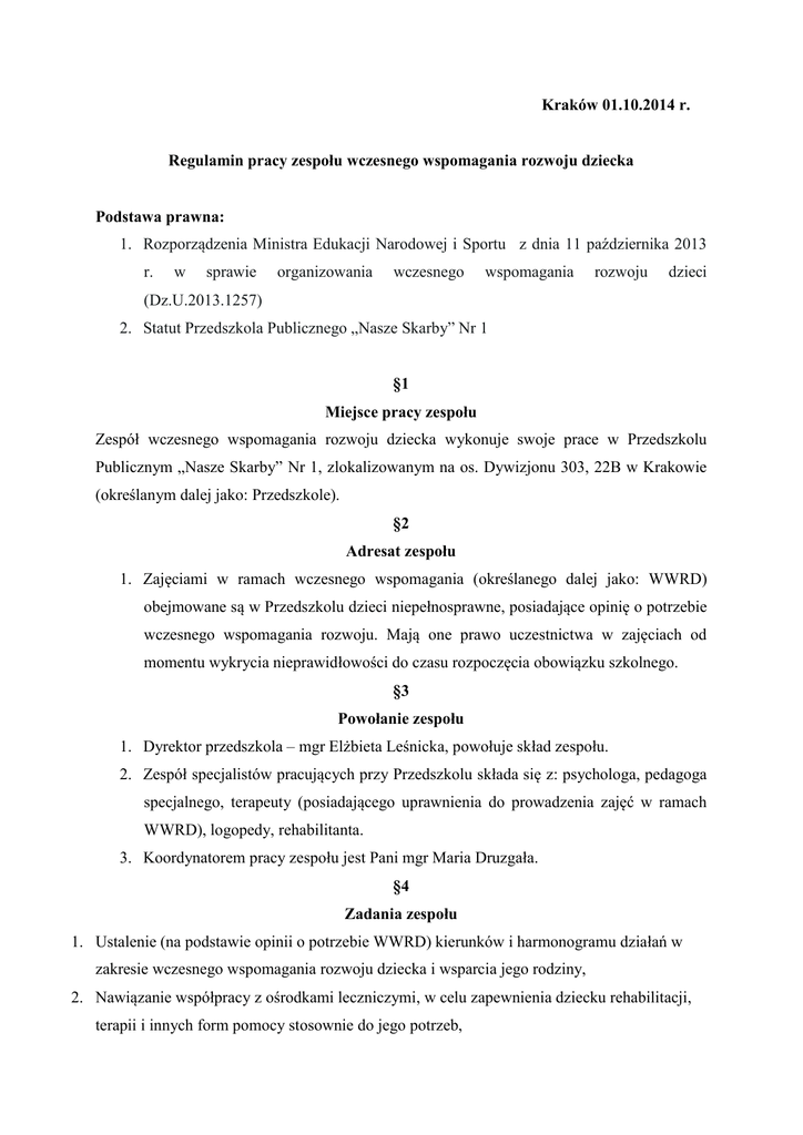 Kraków 01.10.2014 r. Regulamin pracy zespołu wczesnego wspomagania rozwoju dziecka Podstawa prawna: 1. Rozporządzenia Ministra Edukacji Narodowej i Sportu z dnia 11 października 2013 r. w sprawie organizowania wczesnego wspomagania rozwoju dzieci (Dz.U.2013.1257) 2. Statut Przedszkola Publicznego „Nasze Skarby” Nr 1 §1 Miejsce pracy zespołu Zespół wczesnego wspomagania rozwoju dziecka wykonuje swoje prace w Przedszkolu Publicznym „Nasze Skarby” Nr 1, zlokalizowanym na os. Dywizjonu 303, 22B w Krakowie (określanym dalej jako: Przedszkole). §2 Adresat zespołu 1. Zajęciami w ramach wczesnego wspomagania (określanego dalej jako: WWRD) obejmowane są w Przedszkolu dzieci niepełnosprawne, posiadające opinię o potrzebie wczesnego wspomagania rozwoju. Mają one prawo uczestnictwa w zajęciach od momentu wykrycia nieprawidłowości do czasu rozpoczęcia obowiązku szkolnego. §3 Powołanie zespołu 1. Dyrektor przedszkola – mgr Elżbieta Leśnicka, powołuje skład zespołu. 2. Zespół specjalistów pracujących przy Przedszkolu składa się z: psychologa, pedagoga specjalnego, terapeuty (posiadającego uprawnienia do prowadzenia zajęć w ramach WWRD), logopedy, rehabilitanta. 3. Koordynatorem pracy zespołu jest Pani mgr Maria Druzgała. §4 Zadania zespołu 1. Ustalenie (na podstawie opinii o potrzebie WWRD) kierunków i harmonogramu działań w zakresie wczesnego wspomagania rozwoju dziecka i wsparcia jego rodziny, 2. Nawiązanie współpracy z ośrodkami leczniczymi, w celu zapewnienia dziecku rehabilitacji, terapii i innych form pomocy stosownie do jego potrzeb, 3. Opracowanie i realizowanie z dzieckiem i jego rodziną indywidualnego programu wczesnego wspomagania (bądź: indywidualnego programu edukacyjno-terapeutycznego tzw. IPETu), z uwzględnieniem działań wspomagających rodzinę dziecka w zakresie realizacji programu, 4. Regularne analizowanie skuteczności działań terapeutycznych, wprowadzanie zmian w indywidualnym programie wczesnego wspomagania (bądź: w ramach IPETu) oraz planowanie dalszych działań w zakresie WWRD. §5 Dokumentacja 1. Prowadzenie dziennika do zajęć WWRD 2. Indywidualny program wczesnego wspomagania (bądź: IPET) 3. Obserwacji wstępnych i końcowych pedagoga specjalnego przy współpracy z logopedą i psychologiem 4. Opracowanie specjalistycznych opinii dziecka 5. Plan przebiegu poszczególnych zajęć, 6. Archiwizację wytworów dziecka (karty pracy, wytwory plastyczne itp.), §6 Zasady organizacji zajęć 1. Zajęcia w ramach wczesnego wspomagania organizowane są w Przedszkolu w wymiarze od 4 do 8 godzin w miesiącu, w zależności od możliwości psychofizycznych i potrzeb dziecka. 2. Zajęcia z dzieckiem mają charakter indywidualny: „jeden na jeden” (dziecko-terapeuta), opcjonalnie: w dwu-trzy osobowej grupie. §7 Miejsce przeprowadzania zajęć 1. Dyrektor Przedszkola – mgr Elżbieta Leśnicka, ustala z rodzicami (opiekunami prawnymi) dziecka miejsce przeprowadzania zajęć w ramach WWRD. Odbywają się one na terenie placówki (gabinet terapeutyczny, sale przedszkolne, sala gimnastyczna) bądź na zewnątrz – na terenie należącym do Przedszkola. §8 Zasady współpracy z rodzicami Zespół specjalistów współpracuje z rodziną dziecka w szczególności przez: 1. Udzielanie sugestii w zakresie kształtowania zachowań pożądanych w kontaktach z dzieckiem, pomoc w interpretacji jego zachowań i utrwalanie właściwych reakcji na nie, 2. Udzielanie instruktażu i porad, co do wykorzystania w pracy z dzieckiem (w warunkach domowych) odpowiednich środków dydaktycznych i niezbędnego sprzętu. 3. Zespół działający przy Przedszkolu informuje rodziców telefonicznie o terminie i przyczynach odwołania zajęć. 4. Zespół pozostaje w stałym kontakcie z rodzicami odnośnie przebiegu terapii, postępów dziecka i ewentualnych trudności. §9 Postanowienia końcowe Regulamin obowiązuje od dnia: 01.09.2015r. Dyrektor Przedszkola, w porozumieniu z zespołem specjalistów, rości sobie prawo do zmian w Regulaminie.
