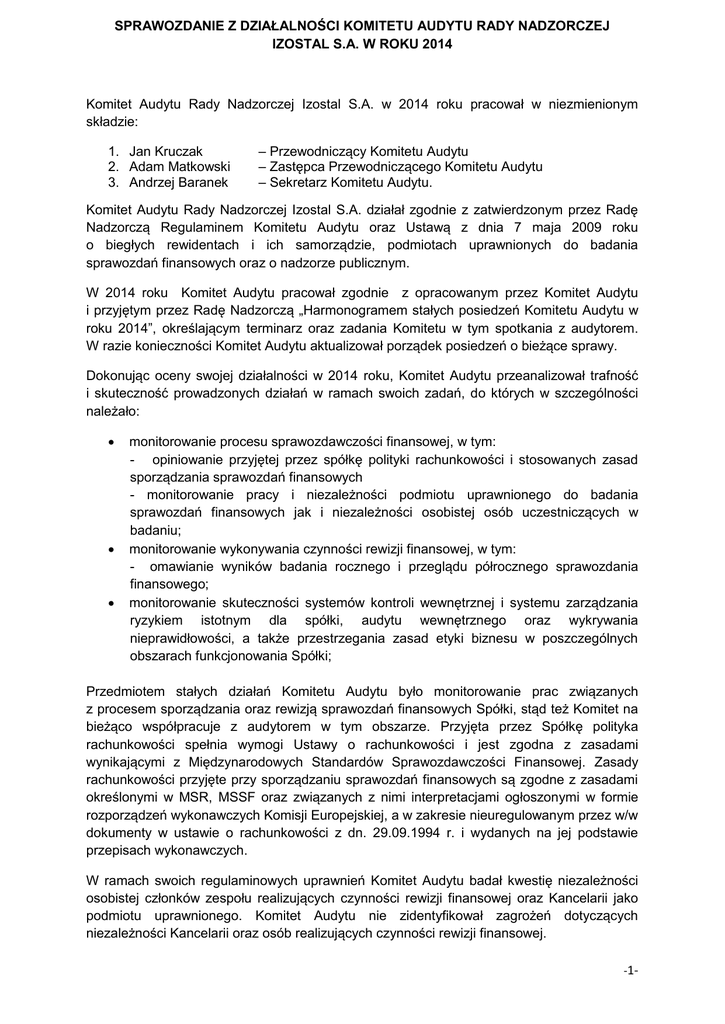 SPRAWOZDANIE Z DZIAŁALNOŚCI KOMITETU AUDYTU RADY NADZORCZEJ IZOSTAL S.A. W ROKU 2014 Komitet Audytu Rady Nadzorczej Izostal S.A. w 2014 roku pracował w niezmienionym składzie: 1. Jan Kruczak 2. Adam Matkowski 3. Andrzej Baranek – Przewodniczący Komitetu Audytu – Zastępca Przewodniczącego Komitetu Audytu – Sekretarz Komitetu Audytu. Komitet Audytu Rady Nadzorczej Izostal S.A. działał zgodnie z zatwierdzonym przez Radę Nadzorczą Regulaminem Komitetu Audytu oraz Ustawą z dnia 7 maja 2009 roku o biegłych rewidentach i ich samorządzie, podmiotach uprawnionych do badania sprawozdań finansowych oraz o nadzorze publicznym. W 2014 roku Komitet Audytu pracował zgodnie z opracowanym przez Komitet Audytu i przyjętym przez Radę Nadzorczą „Harmonogramem stałych posiedzeń Komitetu Audytu w roku 2014”, określającym terminarz oraz zadania Komitetu w tym spotkania z audytorem. W razie konieczności Komitet Audytu aktualizował porządek posiedzeń o bieżące sprawy. Dokonując oceny swojej działalności w 2014 roku, Komitet Audytu przeanalizował trafność i skuteczność prowadzonych działań w ramach swoich zadań, do których w szczególności należało: monitorowanie procesu sprawozdawczości finansowej, w tym: - opiniowanie przyjętej przez spółkę polityki rachunkowości i stosowanych zasad sporządzania sprawozdań finansowych - monitorowanie pracy i niezależności podmiotu uprawnionego do badania sprawozdań finansowych jak i niezależności osobistej osób uczestniczących w badaniu; monitorowanie wykonywania czynności rewizji finansowej, w tym: - omawianie wyników badania rocznego i przeglądu półrocznego sprawozdania finansowego; monitorowanie skuteczności systemów kontroli wewnętrznej i systemu zarządzania ryzykiem istotnym dla spółki, audytu wewnętrznego oraz wykrywania nieprawidłowości, a także przestrzegania zasad etyki biznesu w poszczególnych obszarach funkcjonowania Spółki; Przedmiotem stałych działań Komitetu Audytu było monitorowanie prac związanych z procesem sporządzania oraz rewizją sprawozdań finansowych Spółki, stąd też Komitet na bieżąco współpracuje z audytorem w tym obszarze. Przyjęta przez Spółkę polityka rachunkowości spełnia wymogi Ustawy o rachunkowości i jest zgodna z zasadami wynikającymi z Międzynarodowych Standardów Sprawozdawczości Finansowej. Zasady rachunkowości przyjęte przy sporządzaniu sprawozdań finansowych są zgodne z zasadami określonymi w MSR, MSSF oraz związanych z nimi interpretacjami ogłoszonymi w formie rozporządzeń wykonawczych Komisji Europejskiej, a w zakresie nieuregulowanym przez w/w dokumenty w ustawie o rachunkowości z dn. 29.09.1994 r. i wydanych na jej podstawie przepisach wykonawczych. W ramach swoich regulaminowych uprawnień Komitet Audytu badał kwestię niezależności osobistej członków zespołu realizujących czynności rewizji finansowej oraz Kancelarii jako podmiotu uprawnionego. Komitet Audytu nie zidentyfikował zagrożeń dotyczących niezależności Kancelarii oraz osób realizujących czynności rewizji finansowej. -1- Komitet monitorował prawidłowość sporządzania przez Spółkę jednostkowych sprawozdań finansowych: za rok obrotowy 2013 i półrocznego za okres 01.01.2014 do 30.06.2014 ściśle współpracując w tym zakresie z biegłym rewidentem badającym sprawozdania. Podział zadań związanych ze sporządzaniem sprawozdań finansowych w Spółce, kontrola sporządzonych sprawozdań przez audytora, a także monitorowanie procesu sporządzania i weryfikacji sprawozdań przez Komitet Audytu oraz ocena sprawozdań przez Radę Nadzorczą, zapewniają rzetelność oraz prawidłowość informacji prezentowanych w sprawozdaniach finansowych. W ocenie Komitetu Audytu współpraca audytorów z Zarządem Spółki jest prawidłowa i nie budzi zastrzeżeń. Komitet Audytu na bieżąco monitorował proces sprawozdawczości finansowej, a przedmiotowe sprawozdania finansowe we wszystkich istotnych aspektach zostały sporządzone zgodnie z zasadami rachunkowości oraz na podstawie prawidłowo prowadzonych ksiąg rachunkowych i rzetelnie odzwierciedlają wyniki działalności gospodarczej oraz sytuację majątkową i finansową Spółki. Komitet Audytu dokonał również przeglądu Sprawozdania Zarządu z działalności Spółki uznając, że przedstawione dane liczbowe i fakty obrazują prawdziwy i rzetelny stan rzeczy. Nie stwierdzono nieprawidłowości w zakresie funkcjonowania kontroli wewnętrznej oraz organizacji rachunkowości spółki w odniesieniu do procesu sprawozdawczości Spółki. Monitorowanie skuteczności systemów kontroli wewnętrznej, audytu wewnętrznego oraz zarządzania ryzkiem istotnym dla Spółki, które w Izostal S.A. realizowane jest przez Zarząd, kierownictwo oraz pozostałych pracowników w zakresie powierzonych im obowiązków w ocenie Komitetu Audytu Rady Nadzorczej Izostal S.A wypełniane jest prawidłowo. Zarząd jest organem zarządzającym ryzykiem w Spółce w ramach swojej operacyjnej działalności, a kluczowy personel kierowniczy uczestniczy w procesie identyfikacji ryzyka i zapobieganiu jego skutkom. Obszary ryzyka istotne dla Spółki są właściwie identyfikowane i dla zapewnienia realizacji celów strategicznych zakładanych przez Izostal S.A. Zarząd wspólnie z kierownictwem na bieżąco dokonuje przeglądu i aktualizacji czynników ryzyka towarzyszących działalności firmy, które mogą mieć wpływ na sytuację finansową oraz rynkową Spółki. Zidentyfikowane główne czynniki ryzyka dotyczące Spółki są stale monitorowane w celu ustalenia czy ich identyfikacja i podjęte środki w celu minimalizacji poszczególnych obszarów zagrożenia przebiega prawidłowo oraz czy stasowane są właściwe środki i rozwiązania. Prowadzona jest okresowa kontrola zasad zarządzania ryzykiem i zgodności tego procesu z przyjętymi standardami, a także stała analiza zarządzania ryzkiem pod kątem mo