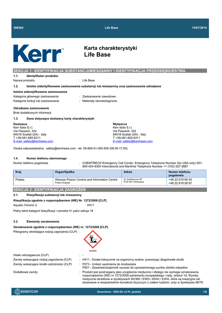 300384 Life Base 15/07/2015 Karta charakterystyki Life Base SEKCJA 1: IDENTYFIKACJA SUBSTANCJI/MIESZANINY I IDENTYFIKACJA PRZEDSIĘBIORSTWA 1.1. Identyfikator produktu Nazwa produktu 1.2. : Life Base Istotne zidentyfikowane zastosowania substancji lub mieszaniny oraz zastosowania odradzane Istotne zidentyfikowane zastosowania Kategoria głównego zastosowania : Zastosowanie zawodowe Kategoria funkcji lub zastosowania : Materiały stomatologiczne. Odradzane zastosowanie Brak dodatkowych informacji 1.3. Dane dotyczące dostawcy karty charakterystyki Dostawca Kerr Italia S.r.l. Via Passanti, 332 84018 Scafati (SA) - Italy T +39-081-850-8311 E-mail: [email protected] Wytwórca Kerr Italia S.r.l. Via Passanti, 332 84018 Scafati (SA) - Italy T +39-081-850-8311 E-mail: [email protected] Osoba odpowiedzialna : [email protected] - tel. 00-800-41-050-505 (08.00-17.00) 1.4. Numer telefonu alarmowego Numer telefonu pogotowia : CHEMTREC® Emergency Call Center. Emergency Telephone Number (for USA only) 001800-424-9300 International and Maritime Telephone Number +1 (703) 527-3887 Kraj Organ/Spółka Adres Polska Warsaw Poison Control and Information Centre Al. Solidarnosci 67 P-03 401 Warszawa Praski Hospital Numer telefonu pogotowia +48 22 619 66 54 +48 22 619 08 97 SEKCJA 2: IDENTYFIKACJA ZAGROŻEŃ 2.1. Klasyfikacja substancji lub mieszaniny Klasyfikacja zgodnie z rozporządzeniem (WE) Nr. 1272/2008 [CLP] Aquatic Chronic 2 H411 Pełny tekst kategorii klasyfikacji i zwrotów H: patrz sekcja 16 2.2. Elementy oznakowania Oznakowanie zgodnie z rozporządzeniem (WE) nr. 1272/2008 [CLP] Piktogramy określające rodzaj zagrożenia (CLP) : GHS09 Hasło ostrzegawcze (CLP) : - Zwroty wskazujące rodzaj zagrożenia (CLP) : H411 - Działa toksycznie na organizmy wodne, powodując długotrwałe skutki Zwroty wskazujące środki ostrożności (CLP) : P273 - Unikać uwolnienia do środowiska P501 - Zawartość/pojemnik usuwać do upoważnionego punktu zbiórki odpadów Dodatkowe zwroty : Produkt jest postrzegany jako urządzenie medyczne i dlatego nie wymaga oznakowania, rozporządzenie (WE) nr 1272/2008 parlamentu europejskiego i rady, artykuł 1d; Wyroby medyczne określone w dyrektywach 90/385 / EWG i 93/42 / EWG, które są inwazyjne lub stosowane w bezpośrednim kontakcie fizycznym z ciałem ludzkim, oraz w dyrektywie 98/79 Essenticon - SDS EU v2 PL (polski) 1/8 300384 Life Base 15/07/2015 / WE. 2.3. Inne zagrożenia Inne zagrożenia mające wpływ na klasyfikację : W normalnych warunkach nieobecne. Substancja/mieszanina ta nie spełnia kryteriów PBT rozporządzenia REACH, aneks XIII Substancja/mieszanina ta nie spełnia kryteriów vPvB rozporządzenia REACH, aneks XIII SEKCJA 3: SKŁAD/INFORMACJA O SKŁADNIKACH 3.1. Substancja Nie dotyczy 3.2. Mieszanina Nazwa Identyfikator produktu % Klasyfikacja zgodnie z rozporządzeniem (WE) Nr. 1272/2008 [CLP] tlenek cynku (Numer CAS) 1314-13-2 (Numer WE) 215-222-5 (Numer indeksowy) 030-013-00-7 (REACH-nr) 01-2119463881-32 >=12 - <=17 Aquatic Acute 1, H400 Aquatic Chronic 1, H410 calcium hydroxide (Numer CAS) 1305-62-0 (Numer WE) 215-137-3 (REACH-nr) 01-2119475151-45 >=3 - <=6 Skin Irrit. 2, H315 Eye Irrit. 2, H319 Brzmienie sformułowań H: patrz sekcja 16. SEKCJA 4: ŚRODKI PIERWSZEJ POMOCY 4.1. Opis środków pierwszej pomocy Pierwsza pomoc - środki ogólnie : W przypadku złego samopoczucia skontaktować się z ośrodkiem zatruć lub z lekarzem. Pierwsza pomoc - środki po zainhalowaniu : Wypłukać nos i usta wodą. Jeśli dyskomfort utrzymuje się, zwrócić się po pomoc medyczną. Pierwsza pomoc - środki po kontakcie ze skórą : Delikatnie umyć dużą ilością wody z mydłem. W przypadku wystąpienia podrażnienia skóry lub wysypki: Zasięgnąć porady/zgłosić się pod opiekę lekarza. Pierwsza pomoc - środki po kontakcie z oczami : Niezwłocznie rozpocząć obfite płukanie wodą, które należy kontynuować do 15 minut. Zdjąć soczewki kontaktowe i szeroko otworzyć oczy. W przypadku utrzymywania się działania drażniącego na oczy: Zasięgnąć porady/zgłosić się pod opiekę lekarza. Pierwsza pomoc - środki po połknięciu : Wypłukać nos, usta i gardło wodą. Jeśli dyskomfort utrzymuje się, zwrócić się po pomoc medyczną. 4.2. Najważniejsze ostre i opóźnione objawy oraz skutki narażenia Symptomy/urazy 4.3. : W przypadku złego samopoczucia, należy zasięgnąć porady lekarza. Wskazania dotyczące wszelkiej natychmiastowej pomocy lekarskiej i szczególnego postępowania z poszkodowanym Brak dodatkowych informacji SEKCJA 5: POSTĘPOWANIE W PRZYPADKU POŻARU 5.1. Środki gaśnicze Odpowiednie środki gaśnicze : Woda rozpylana. Ditlenek węgla. Suchy proszek. Nieodpowiednie środki gaśnicze : Nie używać silnego strumienia wody. 5.2. Szczególne zagrożenia związane z substancją lub mieszaniną Zagrożenie pożarowe : Produkt nie jest łatwopalny, zgodnie z krajowymi regulacjami dotyczącymi substancji łatwopalnych. Zagrożenie wybuchem : Produkt nie jest wybuchowy. Niebezpieczne produkty rozkładu w przypadku pożaru : Nie określono swoistych niebezpiecznych produktów rozkładu. 5.3. Informacje dla straży pożarnej Instrukcja gaśnicza : Usunąć pojemniki z dala od miejsca pożaru, jeżeli można to zrobić bez zagrożenia. Wyeliminować wszystkie źródła zapłonu, jeżeli jest to bezpieczne. Ochrona w przypadku gaszenia pożaru : Nie wchodzić do strefy ogarniętej pożarem bez sprzętu ochronnego i aparatu do oddychania. SEKCJA 6: POSTĘPOWANIE W PRZYPADKU NIEZAMIERZONEGO UWOLNIENIA DO ŚRODOWISKA 6.1. Indywidualne środki ostrożności, wyposażenie ochronne i procedury w sytuacjach awaryjnych Ogólne środki zaradcze : Niewymagany w normalnych warunkach użytkowania. Dla osób nienależących do personelu udzielającego pomocy Wyposażenie ochronne : Należy nosić odpowiednie wyposażenie ochrony osobistej – patrz Część 8. Essenticon - SDS EU v2 PL (polski) 2/8 300384 Procedury działania na wypadek zagrożen