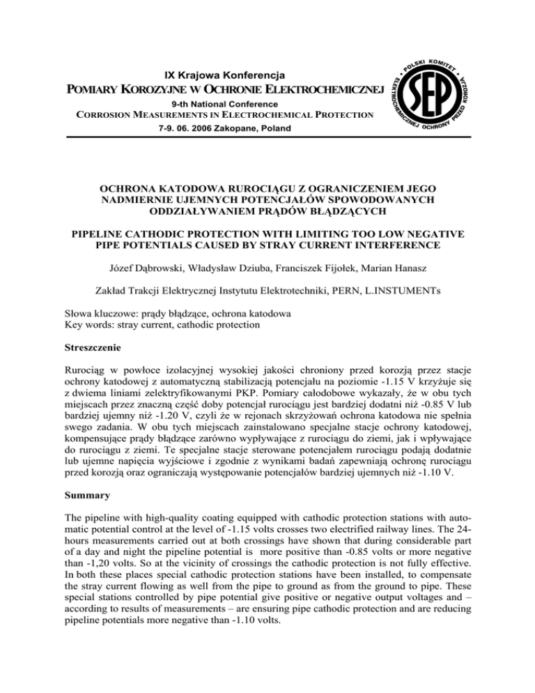 IX Krajowa Konferencja POMIARY KOROZYJNE W OCHRONIE ELEKTROCHEMICZNEJ 9-th National Conference CORROSION MEASUREMENTS IN ELECTROCHEMICAL PROTECTION 7-9. 06. 2006 Zakopane, Poland OCHRONA KATODOWA RUROCIĄGU Z OGRANICZENIEM JEGO NADMIERNIE UJEMNYCH POTENCJAŁÓW SPOWODOWANYCH ODDZIAŁYWANIEM PRĄDÓW BŁĄDZĄCYCH PIPELINE CATHODIC PROTECTION WITH LIMITING TOO LOW NEGATIVE PIPE POTENTIALS CAUSED BY STRAY CURRENT INTERFERENCE Józef Dąbrowski, Władysław Dziuba, Franciszek Fijołek, Marian Hanasz Zakład Trakcji Elektrycznej Instytutu Elektrotechniki, PERN, L.INSTUMENTs Słowa kluczowe: prądy błądzące, ochrona katodowa Key words: stray current, cathodic protection Streszczenie Rurociąg w powłoce izolacyjnej wysokiej jakości chroniony przed korozją przez stacje ochrony katodowej z automatyczną stabilizacją potencjału na poziomie -1.15 V krzyżuje się z dwiema liniami zelektryfikowanymi PKP. Pomiary całodobowe wykazały, że w obu tych miejscach przez znaczną część doby potencjał rurociągu jest bardziej dodatni niż -0.85 V lub bardziej ujemny niż -1.20 V, czyli że w rejonach skrzyżowań ochrona katodowa nie spełnia swego zadania. W obu tych miejscach zainstalowano specjalne stacje ochrony katodowej, kompensujące prądy błądzące zarówno wypływające z rurociągu do ziemi, jak i wpływające do rurociągu z ziemi. Te specjalne stacje sterowane potencjałem rurociągu podają dodatnie lub ujemne napięcia wyjściowe i zgodnie z wynikami badań zapewniają ochronę rurociągu przed korozją oraz ograniczają występowanie potencjałów bardziej ujemnych niż -1.10 V. Summary The pipeline with high-quality coating equipped with cathodic protection stations with automatic potential control at the level of -1.15 volts crosses two electrified railway lines. The 24hours measurements carried out at both crossings have shown that during considerable part of a day and night the pipeline potential is more positive than -0.85 volts or more negative than -1,20 volts. So at the vicinity of crossings the cathodic protection is not fully effective. In both these places special cathodic protection stations have been installed, to compensate the stray current flowing as well from the pipe to ground as from the ground to pipe. These special stations controlled by pipe potential give positive or negative output voltages and – according to results of measurements – are ensuring pipe cathodic protection and are reducing pipeline potentials more negative than -1.10 volts. 1. Wstęp Zgodnie z pkt.4.2 normy [1], aby było spełnione podstawowe kryterium ochrony katodowej, potencjał ochrony Ep podziemnej konstrukcji stalowej mierzony względem siarczano-miedziowej elektrody odniesienia powinien wynosić: Ep ≤ -0.85 V (1) W uwadze do tego punktu normy podano: „W przypadku cienkich powłok ochronnych bez uszkodzeń, o jednostkowej rezystancji powłoki (rco) niższej niż 108 Ωm2, potencjały o wartościach bardzo ujemnych mogą mieć szkodliwy wpływ na powłoki, np. może dojść do pęcherzenia powłoki. Aby zminimalizować wszelki szkodliwy wpływ, potencjały bez składowej IR, zmierzone względem elektrody siarczano-miedziowej, nie powinny być bardziej ujemne niż potencjał krytyczny El = -1.1 V, chyba że producent powłoki poda inną, należycie udokumentowaną wartość. Bardzo ujemne potencjały mogą powodować także stopniowe odspajanie katodowe w defektach zarówno cienkiej, jak i grubej powłoki.” Zatem potencjał Ep chronionej konstrukcji powinien zawierać się w granicach: -1.10 V ≤ Ep ≤ -0.85 V (2) Przed szkodliwością zbyt niskich potencjałów polaryzacji Ep ostrzega także norma ISO [2], w której w punkcie 5.3.2.1 podano:.”...W celu uniknięcia uszkodzenia powłoki, graniczny potencjał krytyczny nie powinien być bardziej ujemny niż -1200 mV względem Cu/CuSO4, aby zapobiec szkodliwym skutkom wytwarzania wodoru i/lub wysokim wartościom pH na powierzchni metalu”. W tym przypadku podana wartość graniczna Ep jest niższa o 100 mV w porównaniu z podanym w normie [1] potencjałem krytycznym El. Kwestia szkodliwych oddziaływań zbyt ujemnych potencjałów polaryzacji podziemnych rurociągów jest omawiana także w innych publikacjach, np. [3, 4, 5]. Stwierdzenie występowania, a następnie ograniczenie zbyt ujemnych potencjałów ochrony jest stosunkowo proste w przypadku tych rurociągów, których trasy przebiegają poza strefami oddziaływania trakcyjnych prądów błądzących. Można wówczas względnie łatwo, np. metodą wyłączeniową zmierzyć, a następnie odpowiednio wyregulować wartość EIR free, oraz dbać o jej utrzymywanie w czasie eksploatacji. Natomiast sytuacja jest znacznie trudniejsza, jeżeli na rurociąg działają prądy błądzące odgałęziane z torów trakcji elektrycznej, wskutek czego wartości potencjałów takiego rurociągu ulegają często silnym wahaniom. Wyznaczenie wartości EIR free, a tym bardziej odpowiednia regulacja i stabilizacja tej wartości stają się wtedy znacznie bardziej skomplikowane i kosztowne. Problematyka ta wystąpiła podczas badań stalowego rurociągu o średnicy 406 mm, w izolacji 3LPE, chronionego przed korozją przez stacje ochrony katodowej (SOK) z automatyczną stabilizacją potencjału ochrony na wybranym poziomie -1.15 V. Na odcinku między dwiema sąsiednimi SOK odległymi od siebie o ok. 68 km trasę rurociągu przecinają dwie zelektryfikowane linie PKP (rys.1). Odległość pierwszego skrzyżowania od SOK1 wynosi ok. 26 km, odległość drugiego skrzyżowania od SOK2 ok. 33 km, a długość odcinka rurociągu między skrzyżowaniami jest równa ok. 8.9 km. 2 8.22 km 3 8.87 km 4 10.04 km 5 23.20 km 6 SOK 2 17.77 km SOK 1 1 rurociąg zelektryfikowane linie PKP Rys. 1. Skrzyżowania linii zelektryfikowanych PKP z trasą rurociągu, lokalizacja SOK i niektórych punktów pomiarowych 2. Badania potencjałów rurociągu w rejonie skrzyżowań z torami PKP W tabl.1 podano wyniki 