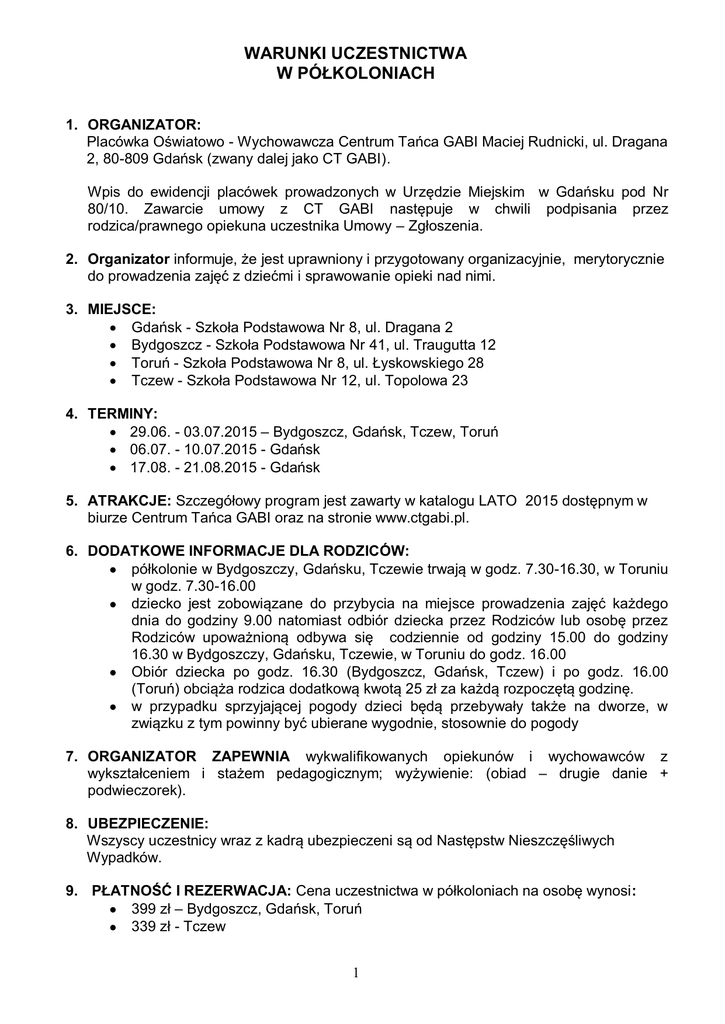 WARUNKI UCZESTNICTWA W PÓŁKOLONIACH 1. ORGANIZATOR: Placówka Oświatowo - Wychowawcza Centrum Tańca GABI Maciej Rudnicki, ul. Dragana 2, 80-809 Gdańsk (zwany dalej jako CT GABI). Wpis do ewidencji placówek prowadzonych w Urzędzie Miejskim w Gdańsku pod Nr 80/10. Zawarcie umowy z CT GABI następuje w chwili podpisania przez rodzica/prawnego opiekuna uczestnika Umowy – Zgłoszenia. 2. Organizator informuje, że jest uprawniony i przygotowany organizacyjnie, merytorycznie do prowadzenia zajęć z dziećmi i sprawowanie opieki nad nimi. 3. MIEJSCE: Gdańsk - Szkoła Podstawowa Nr 8, ul. Dragana 2 Bydgoszcz - Szkoła Podstawowa Nr 41, ul. Traugutta 12 Toruń - Szkoła Podstawowa Nr 8, ul. Łyskowskiego 28 Tczew - Szkoła Podstawowa Nr 12, ul. Topolowa 23 4. TERMINY: 29.06. - 03.07.2015 – Bydgoszcz, Gdańsk, Tczew, Toruń 06.07. - 10.07.2015 - Gdańsk 17.08. - 21.08.2015 - Gdańsk 5. ATRAKCJE: Szczegółowy program jest zawarty w katalogu LATO 2015 dostępnym w biurze Centrum Tańca GABI oraz na stronie www.ctgabi.pl. 6. DODATKOWE INFORMACJE DLA RODZICÓW: półkolonie w Bydgoszczy, Gdańsku, Tczewie trwają w godz. 7.30-16.30, w Toruniu w godz. 7.30-16.00 dziecko jest zobowiązane do przybycia na miejsce prowadzenia zajęć każdego dnia do godziny 9.00 natomiast odbiór dziecka przez Rodziców lub osobę przez Rodziców upoważnioną odbywa się codziennie od godziny 15.00 do godziny 16.30 w Bydgoszczy, Gdańsku, Tczewie, w Toruniu do godz. 16.00 Obiór dziecka po godz. 16.30 (Bydgoszcz, Gdańsk, Tczew) i po godz. 16.00 (Toruń) obciąża rodzica dodatkową kwotą 25 zł za każdą rozpoczętą godzinę. w przypadku sprzyjającej pogody dzieci będą przebywały także na dworze, w związku z tym powinny być ubierane wygodnie, stosownie do pogody 7. ORGANIZATOR ZAPEWNIA wykwalifikowanych opiekunów i wychowawców z wykształceniem i stażem pedagogicznym; wyżywienie: (obiad – drugie danie + podwieczorek). 8. UBEZPIECZENIE: Wszyscy uczestnicy wraz z kadrą ubezpieczeni są od Następstw Nieszczęśliwych Wypadków. 9. PŁATNOŚĆ I REZERWACJA: Cena uczestnictwa w półkoloniach na osobę wynosi: 399 zł – Bydgoszcz, Gdańsk, Toruń 339 zł - Tczew 1 Rezerwacji dokonujemy na kilka możliwych sposobów: 1. Nauczycielowi tańca w szkole, do której dziecko uczęszcza - należy oddać uzupełnioną Deklarację Wstępną, podając podstawowe dane dziecka oraz wpłacić na konto CT GABI kwotę 100 zł zadatku (koszt rezerwacji - zadatek) 2. Wypełnić deklarację wstępną i wysyłać ją pocztą elektroniczną do biura CT GABI. Kwotę 100 zł (koszt rezerwacji - zadatek) wpłacić na konto CT GABI. 3. Osobiście w biurze CT GABI dokonać rezerwacji miejsca i wpłacić na konto CT GABI kwotę 100 zł zadatku (koszt rezerwacji - zadatek) 4. Poprzez wypełnienie formularza na stronie www.ctgabi.pl i wpłacie 100 zł (koszt rezerwacji - zadatek) na konto CT GABI. UWAGA! We wszystkich przypadkach koszt rezerwacji w wysokości 100zł będzie zaliczony na poczet ceny za półkolonie, a w razie rezygnacji nie podlega zwrotowi. Wpłat dokonujemy wyłącznie na konto CT GABI: Centrum Tańca GABI, ul. Dragana 2, 80-809 Gdańsk Nr r-ku 10 2490 0005 0000 4600 2702 0469 (prosimy o podanie szczegółowych danych: imię i nazwisko dziecka, szkoła, klasa, adres zamieszkania i termin wybranych półkolonii). Organizator zapewnia, iż w/w ceny nie podlegają zmianie. 10. Organizator zastrzega sobie prawo odwołania imprezy przed jej rozpoczęciem w przypadkach: zgłoszenia się mniej niż 15 uczestników, w tym wypadku odwołanie półkolonii może nastąpić do 7 dni przed jej rozpoczęciem działania siły wyższej (np. decyzji władz państwowych, powodzi, itp.) 11. Uczestnik może zrezygnować z udziału w półkoloniach bez podania przyczyn, składając oświadczenie w formie pisemnej. Za datę rezygnacji przyjmuje się datę wpływu oświadczenia do biura CT GABI, w którym zawarto umowę lub dzień następujący po dniu, w którym Rodzic nie dokona uzupełnienia wpłaty do pełnej ceny imprezy lub usługi. Brak zapłaty w terminie na jeden dzień przed rozpoczęcie imprezy będzie traktowany jako rezygnację dorozumianą. 12. Koszty ponoszone przez Rodzica w razie jego rezygnacji z półkolonii. Rezygnacja z udziału w półkoloniach może nastąpić jedynie na drodze pisemnego oświadczenia rodziców przekazanego organizatorom. W przypadku rezygnacji z imprezy Rodzic może być zobowiązany do zrefundowania kosztów poniesionych przez CT GABI na przygotowanie jego uczestnictwa w półkoloniach, które zostały poniesione i nie mogą być zwrócone. Koszty te CT GABI przedstawi i udokumentuje Uczestnikowi w wezwaniu do zapłaty. W uzasadnionych przypadkach CT GABI może odstąpić od potrącenia kosztów rezygnacji. Zadatek 100zł nie podlega zwrotowi. 13. Odstępując od umowy Rodzic może w terminie do 3 dni od złożenia rezygnacji, wskazać na swoje miejsce inną osobę i przekazać jej swoje uprawnienia. Osoba ta przejmie obowiązki wynikające z umowy, rozliczenie dokonanych wpłaty na poczet imprezy odbywa się pomiędzy zbywającym a nabywającym prawa z umowy. 2