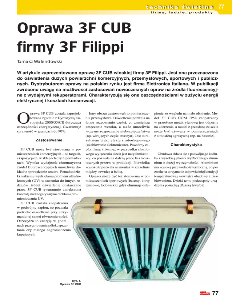 77 f i r m y, l u d z i e , p r o d u k t y Oprawa 3F CUB firmy 3F Filippi Tomasz Walendowski W artykule zaprezentowano oprawÍ 3F CUB w≥oskiej firmy 3F Filippi. Jest ona przeznaczona do oúwietlenia duøych powierzchni komercyjnych, przemys≥owych, sportowych i publicznych. Dystrybutorem oprawy na polskim rynku jest firma Elettronica Italiana. W publikacji zwrÛcono uwagÍ na moøliwoúci zastosowaÒ nowoczesnych opraw na ürÛd≥a fluorescencyjne z wydajnymi rekuperatorami. Charakteryzujπ siÍ one oszczÍdnoúciami w zuøyciu energii elektrycznej i kosztach konserwacji. prawa 3F CUB zosta≥a zaprojektowana zgodnie z Dyrektywπ Europejskπ 2000/55/CE dotyczπcπ oszczÍdnoúci energetycznej. Gwarantuje sprawnoúÊ w granicach do 90%. O Zastosowanie 3F CUB moøe byÊ stosowana w pomieszczeniach komercyjnych ñ na targach, ekspozycjach, w sklepach czy hipermarketach. Wysoka wydajnoúÊ chromatyczna ürÛde≥ fluorescencyjnych umoøliwia dok≥adne sprawdzenie towaru. Ponadto dziÍki niskiemu wydzielaniu promieni ultrafioletowych (UV) w stosunku do innych rodzajÛw ürÛde≥ oúwietlenie dostarczane przez 3F CUB gwarantuje zwiÍkszonπ kontrolÍ nad negatywnymi efektami promieniowania UV. 3F CUB zosta≥a zaopatrzona w podwÛjny zap≥on, co pozwala podzieliÊ oúwietlenie przy utrzymaniu tej samej rÛwnomiernoúci. OszczÍdza to energiÍ w godzinach przygotowania pÛ≥ek, sprzπtania czy ma≥ego nagromadzenia kupujπcych. Inny obszar zastosowaÒ to pomieszczenia przemys≥owe. Oúwietlenie pozwala na ≥atwe rozpoznanie czÍúci, co zmniejsza zmÍczenie wzroku, a takøe umoøliwia wczesne rozpoznanie niebezpieczeÒstwa (np. wirujπcych czÍúci maszyn). Jest to rezultatem braku efektu stroboskopowego (okablowanie elektroniczne). PowtÛrny zap≥on lamp (rÛwnieø w przypadku chwilowego wy≥πczenia sieci) jest natychmiastowy, co pozwala na dalszπ pracÍ bez kosztownych przerw w produkcji. Niewielka wysokoúÊ pozwala na montaø w szczelinie miÍdzy suwnicπ a belkπ. Oprawa moøe byÊ teø stosowana w pomieszczeniach sportowych (baseny, korty tenisowe, lodowiska), gdyø eliminuje oúle- pienie ze wzglÍdu na ma≥e olúnienie. Model 3F CUB COM IP54 zaopatrzony w przes≥onÍ metakrylenowπ jest odporny na uderzenia, a model z przes≥onπ ze szk≥a moøe byÊ uøywany w pomieszczeniach z atmosferπ agresywnπ (np. na basenie). Charakterystyka Obudowa sk≥ada siÍ z podwÛjnego kad≥uba z wysokiej jakoúci wyt≥aczanego aluminium o duøej wytrzyma≥oúci. Aluminium ma wysokπ przewodnoúÊ termicznπ, co pozwala na utrzymanie odpowiedniej kondycji temperaturowej wewnπtrz obudowy z okablowaniem. DziÍki temu podzespo≥y urzπdzenia posiadajπ d≥uøszπ trwa≥oúÊ. Rys. 1. Oprawa 3F CUB 77 78 f i r m y, l u d z i e , p r o d u k t y w czasie niø lampy jodkowe. Po 6000h dzia≥ania zmniejszenie strumienia úwietlnego lamp 55 W wynosi oko≥o 12%, zaú lamp jodkowych oko≥o 20% Rys. 2. Oprawy 3F CUB charakteryzujπ siÍ rozsy≥em prostokπtnym. Lampy wy≥adowcze sπ ürÛd≥ami punktowymi i charakteryzujπ siÍ rozsy≥em okrÍønym. Rekuperator strumienia wykonany zosta≥ z lustrzanego aluminium o wysokiej wydajnoúci i charakteryzuje siÍ brakiem opalizacji. ObrÛbka powierzchni tytanem i magnezem zmniejsza poch≥anianie úwiat≥a (do 5%), sprzyja ograniczeniu temperatury w czÍúci optycznej na korzyúÊ d≥uøszej trwa≥oúci i prawid≥owego dzia≥ania zasilaczy elektronicznych. Ulepszone ogniskowanie uzyskano dziÍki ürÛd≥om umieszczonym w oddzielonych wnÍkach optycznych w celu odzyskania strumienia úwietlnego. Os≥ona wersji VT zrobiona jest z przezroczystego szk≥a niepalnego, hartowanego o gruboúci 4 mm, unieruchomionego przy ramie obudowy. WersjÍ SP wykonano z trwa≥ego przeüroczystego metakrylanu. Na øπdanie dostÍpne jest warstwowe przezroczyste szk≥o dla pomieszczeÒ wymagajπcych ca≥kowitego wch≥aniania promieni UV. ZamkniÍcie sk≥ada siÍ z czterech zatrzaskÛw ze stali inox. Wykorzystywane w oprawach ürÛd≥a úwiat≥a: zwarte fluorescencyjne 55 W, 4800 lm, trzonek 2G11. StopieÒ ochrony IP54. Przewaga opraw 3F CUBE nad oprawami ze ürÛd≥ami metalhologenkowymi zmiany napiÍcia zasilania i na zmniejszone temperatury otoczenia. DziÍki wysokiej czÍstotliwoúci zasilania strumieÒ úwietlny wydaje siÍ niezmienny dla oka ludzkiego. Automatyczne wy≥πczenia wyczerpanych lamp (stand-by) zapewnia odpowiednie bezpieczeÒstwo. Zap≥on elektroniczny i powtÛrny zap≥on jest zawsze natychmiastowy. Nie wystÍpuje brzÍczenie. årednia øywotnoúÊ lampy èrÛd≥a fluorescencyjne 55 W posiadajπ úredniπ øywotnoúÊ prawie dwukrotnie wyøszπ w stosunku do lamp jodkowych (10000-12000h). Niska moc zainstalowana W/m2 Z punktu widzenia projektu jednym z waøniejszych parametrÛw jest watt/m2, poniewaø okreúla wielkoúÊ mocy zainstalowanej na jednostkÍ powierzchni dla danego pomieszczenia. Wysoka wydajnoúÊ úwietlna razem z okablowaniem elektronicznym pozwala na zuøycie tylko 18,8 W/m2 w handlu i 5,8 W/m2 w przemyúle. Mniejszy spadek wartoúci strumienia úwietlnego Zastosowane ürÛd≥a wykazujπ mniejszy spadek wartoúci strumienia úwietlnego WydajnoúÊ úwietlna lamp èrÛd≥a fluorescencyjne 55W majπ bardzo wysokπ skutecznoúÊ úwietlnπ w porÛwnaniu do lamp jodkowych. Przy takim samym oúwietleniu wymagajπ mniej mocy. WydajnoúÊ úwietlna lamp: Fluorescencyjne 4800lm/55W WydajnoúÊ 87 lm/W Jodkowe 32500lm/400W WydajnoúÊ 81 lm/W WydajnoúÊ úwietlna systemu: Fluorescencyjne 4800lm/60W WydajnoúÊ 80 lm/W Jodkowe 32500lm/430W WydajnoúÊ 75 lm/W PodwÛjny zap≥on 3F CUB jest okablowany seryjnie z podwÛjnym zap≥onem. Pozwala to na rozdzielenie zap≥onu przy utrzymaniu tej samej rÛwnomiernoúci. W urzπdzeniach na lampy jodkowe podwÛjny zap≥on nie jest moøliwy. Spowodowa≥by nierÛwnomiernoúÊ ca≥ego oúwietlenia. Regulacja strumienia úwietlnego Na øπdanie dostÍpne jest okablowanie z 