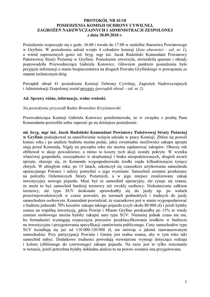PROTOKÓŁ NR 41/10 POSIEDZENIA KOMISJI OCHRONY CYWILNEJ, ZAGROśEŃ NADZWYCZAJNYCH I ADMINISTRACJI ZESPOLONEJ z dnia 30.09.2010 r. Posiedzenie rozpoczęło się o godz. 16.00 i trwało do 17.00 w siedzibie Starostwa Powiatowego w Gryfinie. W posiedzeniu udział wzięło 4 członków komisji (lista obecności - zał. nr 1), a wśród zaproszonych gości mł. bryg. mgr inŜ. Jacek Rudziński Komendant Powiatowy Państwowej StraŜy PoŜarnej w Gryfinie. Posiedzenie otworzyła, stwierdziła quorum i obrady poprowadziła Przewodnicząca Gabriela Kotowicz. Głównym punktem posiedzenia było przyjęcie informacji o stanie bezpieczeństwa na drogach Powiatu Gryfińskiego w powiązaniu ze stanem technicznym dróg. Porządek obrad 41 posiedzenia Komisji Ochrony Cywilnej, ZagroŜeń Nadzwyczajnych i Administracji Zespolonej został przyjęty (porządek obrad – zał. nr 2). Ad. Sprawy róŜne, informacje, wolne wnioski. Na posiedzenie przyszedł Radny Bronisław KrzyŜanowski. Przewodnicząca Komisji Gabriela Kotowicz poinformowała, Ŝe w związku z prośbą Pana Komendanta pozwoliła sobie zaprosić go na dzisiejsze posiedzenie. mł. bryg. mgr inŜ. Jacek Rudziński Komendant Powiatowy Państwowej StraŜy PoŜarnej w Gryfinie podziękował za umoŜliwienie wzięcia udziału w pracy Komisji. ZbliŜa się powoli koniec roku i po analizie budŜetu moŜna podać, jakie ewentualne moŜliwości zakupu sprzętu stają przed Komendą. Nigdy na początku roku nie moŜna zaplanować zakupów. Obecny rok obfitował w akcje powodziowe, a mimo to koszty tych akcji zostały pokryte. W wyniku właściwej gospodarki, oszczędności w eksploatacji i braku niespodziewanych, drogich awarii sprzętu, okazuje się, Ŝe Komenda wygospodarowała środki rzędu kilkudziesięciu tysięcy złotych. W ubiegłym roku, po 15 latach, zakończył się czasookres uŜytkowania samochodu operacyjnego Polonez i naleŜy pomyśleć o jego wymianie. Samochód zostanie przekazany na potrzeby Ochotniczych StraŜy PoŜarnych, a w jego miejsce zrealizowany zakup inwestycyjny nowego pojazdu. Musi być to samochód operacyjny, ale rysuje się szansa, Ŝe moŜe to być samochód bardziej terenowy niŜ zwykły osobowy. Niekoniecznie całkiem terenowy, ale typu SUV doskonale sprawdzałby się do jazdy np. po wałach przeciwpowodziowych w czasie powodzi, po terenach podmokłych i trudnych do jazdy samochodem osobowym. Komendant powiedział, Ŝe szacunkowo jest w stanie wygospodarować z budŜetu jednostki 70% kosztów zakupu takiego pojazdu (czyli około 80 000 zł) i jeŜeli byłaby szansa na wspólną inwestycję, gdzie Powiat i Miasto Gryfino przekazałby po 15% to wtedy zamiast osobowego moŜna byłoby zakupić auto typu SUV. Niemniej jednak czasu nie ma, bo formalności wymagają rozpoczęcia procesów przeklasyfikowania środków w budŜecie na inwestycyjne i przygotowania specyfikacji zamówienia publicznego. Ceny samochodów typu SUV kształtują się juŜ od 110 000-120 000 zł, nie mówiąc o jakimś zaawansowanym samochodzie. Przy partycypacji Powiatu i Gminy jest realna szansa, aby w tym roku taki samochód nabyć. Dodatkowe trudności powodują wewnętrzne wymogi dotyczące rodzaju i koloru (zbliŜonego do czerwonego) zakupu pojazdu. Na razie jest to tylko rozeznanie w temacie, jeŜeli potrzebna byłaby dokładna analiza to na pewno zostanie ona przygotowana. 1 Wniosek Komisji Ochrony Cywilnej, ZagroŜeń Cywilnych i Administracji Zespolonej Nr BRZ.0053-6/2010 z dnia 30 września 2010 r. Na prośbę Komendanta Powiatowego Państwowej StraŜy PoŜarnej w Gryfinie, Komisja zwraca się z prośbą do Zarządu Powiatu w Gryfinie o rozpatrzenia moŜliwości dofinansowania (w wysokości 15%) w bieŜącym roku zakupu samochodu operacyjnego typu SUV na potrzeby jednostki. Szacunkowa wartość pojazdu wynosi 120 000 zł. W wyniku wyeksploatowania jednego z samochodów osobowych istnieje potrzeba takiego zakupu. Prośba o partycypację w wysokości 15% została równieŜ skierowana do Burmistrza Miasta i Gminy Gryfino. Komisja przyjęła jednogłośnie wniosek (5za, 0 wstrz., 0 przeciw). Protokół z 40 posiedzenia Komisji Ochrony Cywilnej, ZagroŜeń Nadzwyczajnych i Administracji Zespolonej został przyjęty jednogłośnie (5 za, 0 wstrz., 0 przeciw). Ad. Przyjęcie informacji o stanie bezpieczeństwa na drogach Powiatu Gryfińskiego w powiązaniu ze stanem technicznym dróg. Komisja zapoznała się i przeanalizowała „Informację o stanie bezpieczeństwa na drogach Powiatu Gryfińskiego w powiązaniu ze stanem technicznym dróg, stan na wrzesień 2010 r.” przygotowaną przez Naczelnika Wydziału Zarządzanie Drogami Arkadiusza Durmę (materiał stanowi załącznik nr 3 do niniejszego protokołu). Wniosek Przewodniczącej Komisji Ochrony Cywilnej, ZagroŜeń Cywilnych i Administracji Zespolonej Gabrieli Kotowicz Nr BRZ.0053-7/2010 z dnia 30 września 2010 r. Prośba o dokonanie naprawy nawierzchni drogi powiatowej 1430Z w Gminie Cedynia, biegnącej od drogi wojewódzkiej do przysiółka Niesułów. Jest to odcinek około 3 km, którego stan techniczny jest bardzo zły, zarośnięte pobocze, a po którym porusza się autobus przewoŜący dzieci do szkoły. Wniosek Przewodniczącej Komisji Ochrony Cywilnej, ZagroŜeń Cywilnych i Administracji Zespolonej Gabrieli Kotowicz Nr BRZ.0053-8/2010 z dnia 30 września 2010 r. Prośba o sprawdzenie problemów z odwodnieniem na drodze powiatowej, jedynej drodze łączącej przysiółek Niesułów, w Gminie Cedynia od strony Czachowa. Stojąca woda na drodze, jak równieŜ na pobliskich polach uniemoŜliwia poruszanie się maszynami rolniczymi i innymi pojazdami na tym odcinku. Wniosek Przewodniczącej Komisji Ochrony Cywilnej, ZagroŜeń Cywilnych i Administracji Zespolonej Gabrieli Kotowicz Nr BRZ.0053-9/2010 z dnia 30 września 2010 r. Prośba o podcięcie krzaków na poboczu drogi powiatowej Orzechów-śelichów, na odcinku za krzyŜówką, obecnie remontowanej na podstawie porozumienia zawa