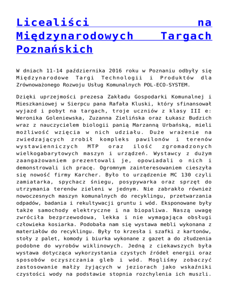 Licealiści Międzynarodowych Poznańskich na Targach W dniach 11-14 października 2016 roku w Poznaniu odbyły się Międzynarodowe Targi Technologii i Produktów Zrównoważonego Rozwoju Usług Komunalnych POL-ECO-SYSTEM. dla Dzięki uprzejmości prezesa Zakładu Gospodarki Komunalnej i Mieszkaniowej w Sierpcu pana Rafała Kluski, który sfinansował wyjazd i pobyt na targach, troje uczniów z klasy III e: Weronika Goleniewska, Zuzanna Zielińska oraz Łukasz Budzich wraz z nauczycielem biologii panią Marzanną Urbańską, mieli możliwość wzięcia w nich udziału. Duże wrażenie na zwiedzających zrobił kompleks pawilonów i terenów wystawienniczych MTP oraz ilość zgromadzonych wielkogabarytowych maszyn i urządzeń. Wystawcy z dużym zaangażowaniem prezentowali je, opowiadali o nich i demonstrowali ich pracę. Ogromnym zainteresowaniem cieszyła się nowość firmy Karcher. Było to urządzenie MC 130 czyli zamiatarka, spychacz śniegu, posypywarka oraz sprzęt do utrzymania terenów zieleni w jednym. Nie zabrakło również nowoczesnych maszyn komunalnych do recyklingu, przetwarzania odpadów, badania i rekultywacji gruntu i wód. Eksponowane były także samochody elektryczne i na biopaliwa. Naszą uwagę zwróciła bezprzewodowa, lekka i nie wymagająca obsługi człowieka kosiarka. Podobała nam się wystawa mebli wykonana z materiałów do recyklingu. Były to krzesła i szafki z kartonów, stoły z palet, komody i biurka wykonane z gazet a do złudzenia podobne do wyrobów wiklinowych. Jedną z ciekawszych była wystawa dotycząca wykorzystania czystych źródeł energii oraz sposobów oczyszczania gleb i wód. Mogliśmy zobaczyć zastosowanie małży żyjących w jeziorach jako wskaźniki czystości wody na podstawie stopnia rozchylenia ich muszli. Odbywały się również tematyczne konferencje. Udział w targach był wyjątkowym przeżyciem i niezwykłą lekcją. LO Sierpc