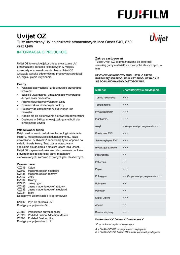 Uvijet OZ Tusz utwardzany UV do drukarek atramentowych Inca Onset S40i, S50i oraz Q40i INFORMACJA O PRODUKCIE Zakres zastosowań Uvijet OZ to wysokiej jakości tusz utwardzany UV, przeznaczony do tablic reklamowych w miejscu sprzedaży oraz oznakowania. Tusze Uvijet OZ wykazują wysoką odporność na procesy postprodukcji, np. cięcie, gięcie i wycinanie. Tusze Uvijet OZ są przeznaczone do dekoracji szerokiej gamy materiałów sztywnych i elastycznych, w tym: UŻYTKOWNIK KOŃCOWY MUSI USTALIĆ PRZED ROZPOCZĘCIEM PRODUKCJI, CZY PRODUKT NADAJE SIĘ DO PLANOWANEGO ZASTOSOWANIA. Cechy • • • • • • • Większa elastyczność i zredukowanie przycinanie krawędzi Szybkie utwardzanie, umożliwiające wytwarzanie dużych ilości produktów Prawie niewyczuwalny zapach tuszu Szeroki zakres dostępnych podłoży Polecany do zastosowań w budynkach i na zewnątrz Nadaje się do dekorowania nierównych powierzchni Dostępne w 5-kilogramowej, zakręcanej butli dla łatwiejszego użytku Materiał Charakterystyka przylegania* Tablica reklamowa Tektura falista Płyta z rdzeniem piankowym Pianka PVC Akryl (A) poprawi przyleganie do Elastyczne PVC Samoprzylepne PVC Błyszczące sztywne PVC Polipropylen żłobkowany Polietylen Papier Poliwęglan (B) poprawi przyleganie do Polistyren Poliester Digital Dibond Arkusz samoprzylepny Banner winylowy Właściwości tuszu Dzięki zastosowaniu unikatowej technologii nakładania Micro-V, maksymalizującej ładunek pigmentu, tusze utwardzane UV Uvijet OZ zapewniają żywe, odporne na światło i trwałe kolory. Tusz został opracowany specjalnie dla drukarek z płaskim łożem Inca Onset. Uvijet OZ zapewnia doskonałe odwzorowanie punktów i przyczepność do szerokiej gamy materiałów niepowlekanych, zarówno sztywnych jak i elastycznych. Zakres barw OZ215 Cyjan OZ867 Magenta odcień niebieski OZ135 Magenta odcień różowy OZ052 Żółty OZ004 Czarny OZ255 Jasny cyjan OZ185 Jasna magenta odcień różowy OZ335 Jasna magenta odcień niebieski OZ021 Biały Dostępny w zbiornikach 5-kilogramowych QV017 Płyn do płukania UV Dostępny w pojemniku 5 l ZE680 Polepszacz przyczepności ZE720 Podkład Fusion Adhesion Master ZE700 Podkład Fusion Ultra Dostępny w pojemnikach 1 l Doskonałe Dobre Dostateczne *Przy druku na papierze satynowym A = Podkład ZE680 może poprawić przyleganie B = Podkład ZE700 Fusion Ultra może poprawić przyleganie Zastosowanie z innymi tuszami Tusz Uvijet OZ można drukować na lub zadrukowywać tuszami Omniplus UL, Uviplast 2000 UP oraz Multiflash UZ. Przed rozpoczęciem druku produkcyjnego należy sprawdzić kompatybilność poszczególnych tuszów w warunkach produkcyjnych. Uwaga: pełne przyleganie warstw może nastąpić po upływie 24 godzin od wydruku. Utwardzanie Doskonałe utwardzenie i przyleganie jest osiągane natychmiast po wydruku i utrwaleniu UV. Niemniej jednak maksymalną przyczepność, odporność chemiczną i odporność na ścieranie i zadrapania można osiągnąć dopiero 24 godziny po początkowym utwardzeniu. Rzeczywisty poziom utwardzania zależy od grubości warstwy tuszu, podłoża oraz lamp UV. Najwyższą jakość utwardzenia można osiągnąć poprzez zmianę trybu drukowania, zwiększając całkowitą dawkę promieniowania UV. aby uniknąć doboru niewłaściwego materiału, który może negatywnie wpłynąć na trwałość tuszu Uvijet. Magazynowanie Nie należy wystawiać tuszu Uvijet OZ na bezpośrednie działanie promieni słonecznych. Nie przechowywać w pobliżu źródeł ciepła, nie dopuszczać do kontaktu z nadtlenkami. W celu maksymalnego przedłużenia żywotności temperatura przechowywania powinna wahać się między 5° a 30°C. Jeżeli tusze Uvijet OZ przechowuje się w niskiej temperaturze, ich oczekiwana żywotność wynosi 12 miesięcy od daty produkcji. Fujifilm Speciality Ink Systems Limited: • • Testy przed produkcją Skład chemiczny tuszu Uvijet OZ zapewnia przyleganie do większości typów materiałów plastikowych, polipropylenowych, polietylenowych i polistyrenowych o energii powierzchniowej 42 dyny/cm lub wyższej. Tusze OZ są wytrzymałe na procesy wykończeniowe druku, takie jak cięcie, wiercenie lub wycinanie. Prace wykończeniowe należy przeprowadzić w ciągu 24 godzin od wydruku. Zdecydowanie zaleca się jednak przetestowanie podłoża przed realizacją wydruku. Tworzywa sztuczne Niektóre tworzywa sztuczne mogą być impregnowane środkami smarnymi, które podobnie jak środki zmiękczające przenikają, pogarszając przyczepność i hamując odporność nawet przez dłuższy okres po wydrukowaniu. Te trudności można wyeliminować, przecierając powierzchnię alkoholem izopropylowym (IPA) przed rozpoczęciem druku. • • • Zasady bezpiecznego stosowania Tusze Uvijet OZ: • Odporność na chemikalia i ścieranie Tusze Uvijet OZ charakteryzują się dobrą odpornością na chemikalia i ścieranie. Dla uzyskania optymalnej wytrzymałości, zaleca się jednak nałożenie na wydruk powłoki lakieru utwardzanego UV, np. Uvibond UV383. Stosowanie w warunkach zewnętrznych Przeprowadzono badania przyspieszonego starzenia za pomocą lampy ksenonowej łukowej zgodnej z normą SAEJ 1960. W tych warunkach przyspieszone starzenie się tuszu Uvijet OZ odpowiada około 24 miesiącom ekspozycji zewnętrznej w klimacie umiarkowanym, takim jak w Wielkiej Brytanii. W przypadku materiałów polietylenowych zaleca się nałożenie przed wydrukiem podkładu Uvijet Adhesion Master ZE720 dla uzyskania maksymalnej przyczepności tuszu do podłoża. Jeżeli planowane jest długotrwałe zastosowanie w warunkach zewnętrznych, zdecydowanie zaleca się zweryfikowanie rzeczywistej wytrzymałości materiału u producenta lub dostawcy podłoża przed użyciem, tak Posiada certyfikat międzynarodowego systemu zarządzania środowiskowego ISO 14001. Dokłada starań, by minimalizować ryzyko ponoszone przez użytkowników produktów, a także zmniejszać wpływ swojej działalności