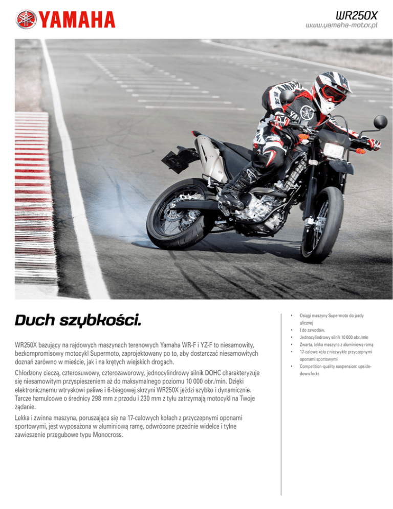 WR250X www.yamaha-motor.pl Duch szybkości. WR250X bazujący na rajdowych maszynach terenowych Yamaha WR-F i YZ-F to niesamowity, bezkompromisowy motocykl Supermoto, zaprojektowany po to, aby dostarczać niesamowitych doznań zarówno w mieście, jak i na krętych wiejskich drogach. Chłodzony cieczą, czterosuwowy, czterozaworowy, jednocylindrowy silnik DOHC charakteryzuje się niesamowitym przyspieszeniem aż do maksymalnego poziomu 10 000 obr./min. Dzięki elektronicznemu wtryskowi paliwa i 6-biegowej skrzyni WR250X jeździ szybko i dynamicznie. Tarcze hamulcowe o średnicy 298 mm z przodu i 230 mm z tyłu zatrzymają motocykl na Twoje żądanie. Lekka i zwinna maszyna, poruszająca się na 17-calowych kołach z przyczepnymi oponami sportowymi, jest wyposażona w aluminiową ramę, odwrócone przednie widelce i tylne zawieszenie przegubowe typu Monocross. • • • • • • Osiągi maszyny Supermoto do jazdy ulicznej I do zawodów. Jednocylindrowy silnik 10 000 obr./min Zwarta, lekka maszyna z aluminiową ramą 17-calowe koła z niezwykle przyczepnymi oponami sportowymi Competition-quality suspension: upsidedown forks Podbij miejską dżunglę. Yamaha jest znana z tego, że pokonuje wszelkie przeszkody i projektuje ekstremalne maszyny. Motocykle Yamaha sprawdziły się, zwyciężając niezliczone mistrzostwa. Teraz i Ty możesz czerpać z bogatego doświadczenia Yamaha i ducha zaawansowanych technologicznie maszyn, które królują również na szosach. Trudne warunki dużego miasta wymagają niezawodnego motocykla. Żadna inna maszyna nie sprawdzi się w mieście tak doskonale jak jeden z motocykli szosowych Yamaha – arcydzieł inżynierii wykorzystujących zaawansowane technologie i zapewniających doskonałe osiągi i zręczność na zatłoczonych ulicach. W mgnieniu oka zawiozą Cię tam, gdzie tylko zechcesz… I zrobią to w niesamowitym stylu. WR250X www.yamaha-motor.pl Rajdowe nastawienie Niesamowity silnik Niezwykle czułe podwozie Motocykl przystosowany do jazdy po bruku jest bezkompromisową maszyną Supermoto bazującą na modelach rajdowych WR-F i YZ-F, które wygrywają wszystkie ważniejsze zawody off-roadowe. It features a full-on, advanced competition spec: 10 000 rpm engine, aluminium main frame and race suspension. The 4-valve, 4-stroke DOHC single-cylinder engine is the real deal: large diameter titanium intake valves and high-lift cams for high rpm levels, and it features ceramic-plated cylinder, forged piston and 6-speed gearbox. Chłodzenie cieczą zapewnia szczytowe osiągi, a wtrysk paliwa daje natychmiastową reakcję silnika na przepustnicę. Aluminiowa rama wzorowana na modelach rajdowych WR-F i YZ-F zapewnia zwartemu, lekkiemu motocyklowi niewiarygodną sterowność i stabilność. Rajdowe zawieszenie wykorzystuje w pełni regulowany widelec upside-down o średnicy 46 mm i tylne zawieszenie Monocross. Wyjedź na drogę Płynna, niezawodna praca Układ wydechowy EXUP 17-calowe koła z przyczepnymi oponami sportowymi zapewniają niebywałą sterowność, a potężne tarcze hamulcowe o średnicy 298 mm z przodu i 230 mm z tyłu na każdej drodze natychmiast zatrzymują motocykl. Elektroniczny system wtrysku paliwa został tak zaprojektowany, aby dostarczać dużą, niezakłóconą moc w pełnym zakresie obrotów oraz zapewniać natychmiastową reakcję silnika na obrót manetki gazu. Płynnie pracujące sprzęgło w połączeniu z 6-biegową skrzynią umożliwia sprawną zmianę biegów podczas jazdy w dowolnym terenie i warunkach. Aby zapewnić płynny wzrost momentu obrotowego, układ EXUP (exhaust ultimate power valve) nieustannie reguluje ciśnienie wewnątrz kolektora układu wydechowego, co daje doskonałe osiągi w niskim i średnim zakresie obrotów. WR250X www.yamaha-motor.pl Silnik Typ silnika chłodzony cieczą, 4-suwowy, DOHC, 4-zworowy, Nachylony do przodu, jednocylindrowy Pojemność 250 cm3 Średnica x skok tłoka 77,0 mm x 53,6 mm Stopień sprężania 11,8 : 1 Moc maksymalna 22,6 kW (30,7PS) @ 10 000 obr./min Maksymalny moment obrotowy 23,7 Nm (2,42 kg-m) @ 8 000 obr./min Układ smarowania Mokra miska olejowa Gaźnik Układ elektronicznego wtrysku paliwa Typ sprzęgła Mokre, wielotarczowe, ze sprężyną śrubową Układ zapłonu TCI Układ rozrusznika Elektryczny Skrzynia biegów Z kołami w stałym zazębieniu, 6-biegowa Napęd końcowy Łańcuch Podwozie Rama Pół-podwójna kołyska Układ przedniego zawieszenia Upside-down telescopic fork Skok przedniego zawieszenia 270 mm Kąt wyprzedzania sworznia zwrotnicy 25º Tor 76 mm Układ tylnego zawieszenia Wahacz, (wahaczowe) Skok tylnego zawieszenia 265 mm Hamulec przedni Jednotarczowe, Ø 298 mm Hamulec tylny Jednotarczowe, Ø 230 mm Opona przednia 110/70R17M/C 54H Opona tylna 130/90R17M/C 54H Wymiary Długość całkowita 2 115 mm Szerokość całkowita 810 mm Wysokość całkowita 1 190 mm Wysokość siodełka 895 mm Rozstaw kół 1 425 mm Minimalny prześwit 265 mm Masa z obciążeniem (wliczając wypełnione zbiorniki oleju i paliwa) 136 kg Pojemność zbiornika paliwa 7,6 litrów Pojemność zbiornika oleju 1,5 litrów Yamaha Black Jakość w stylu Yamaha Technicy Yamaha są przeszkoleni i w pełni wyposażeni, aby służyć klientom najlepszymi usługami i poradami na temat produktów Yamaha. Dlatego Yamaha zaleca, aby wszelkie prace serwisowe były wykonywane przez oficjalnych przedstawicieli Yamaha. Yamaha zdecydowanie zaleca stosowanie oryginalnych części zamiennych i akcesoriów. Yamaha also recommends the use of Yamalube®, our own range of high-tech lubricants, the lifeblood of Yamaha engines. Opracowane z myślą o niezawodnej pracy praktycznie w każdych warunkach stanowią o prawdziwej mocy silników Yamaha. Oprócz akcesoriów użytkowych i ozdobnych oferujemy również szeroką gamę najwyższej jakości odzieży dla motocyklistów, która zapewnia komfort i bezpieczeństwo. Dostępna jest także bogata kolekcja odzieży. Aby dowiedzieć się więcej, odwiedź: www.