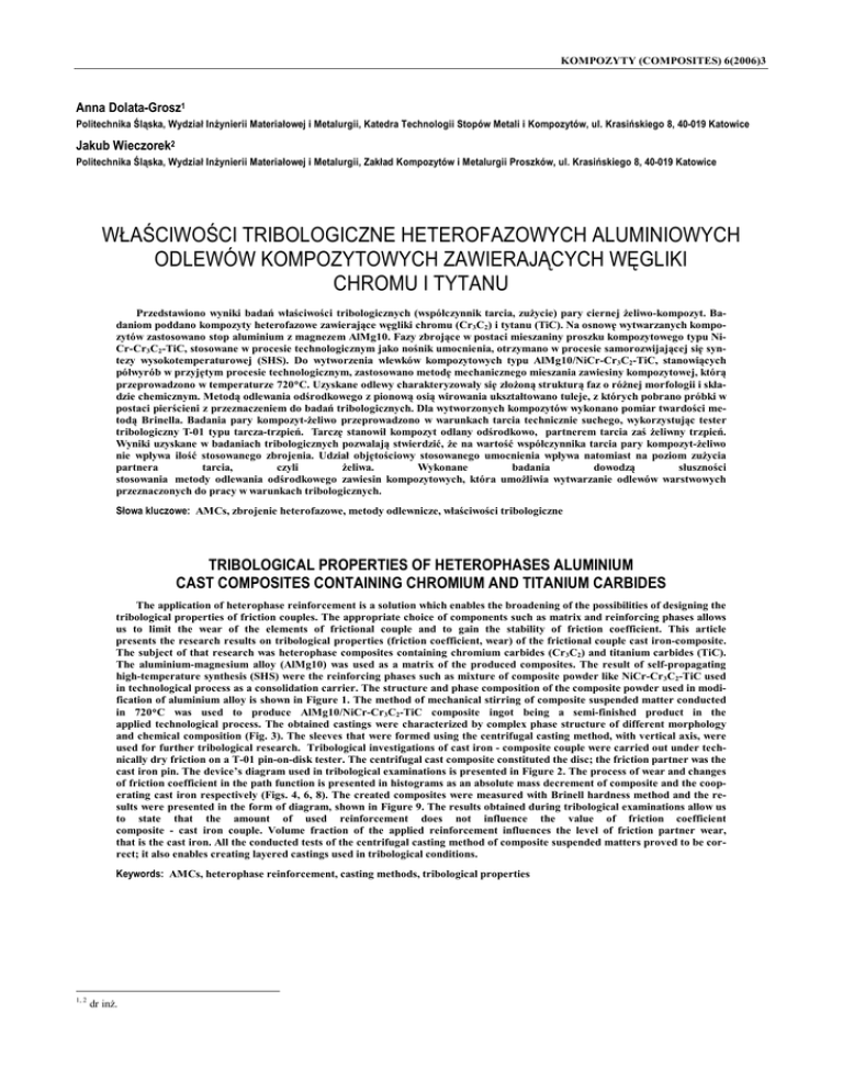 KOMPOZYTY (COMPOSITES) 6(2006)3 Anna Dolata-Grosz1 Politechnika Śląska, Wydział Inżynierii Materiałowej i Metalurgii, Katedra Technologii Stopów Metali i Kompozytów, ul. Krasińskiego 8, 40-019 Katowice Jakub Wieczorek2 Politechnika Śląska, Wydział Inżynierii Materiałowej i Metalurgii, Zakład Kompozytów i Metalurgii Proszków, ul. Krasińskiego 8, 40-019 Katowice WŁAŚCIWOŚCI TRIBOLOGICZNE HETEROFAZOWYCH ALUMINIOWYCH ODLEWÓW KOMPOZYTOWYCH ZAWIERAJĄCYCH WĘGLIKI CHROMU I TYTANU Przedstawiono wyniki badań właściwości tribologicznych (współczynnik tarcia, zużycie) pary ciernej żeliwo-kompozyt. Badaniom poddano kompozyty heterofazowe zawierające węgliki chromu (Cr3C2) i tytanu (TiC). Na osnowę wytwarzanych kompozytów zastosowano stop aluminium z magnezem AlMg10. Fazy zbrojące w postaci mieszaniny proszku kompozytowego typu NiCr-Cr3C2-TiC, stosowane w procesie technologicznym jako nośnik umocnienia, otrzymano w procesie samorozwijającej się syntezy wysokotemperaturowej (SHS). Do wytworzenia wlewków kompozytowych typu AlMg10/NiCr-Cr3C2-TiC, stanowiących półwyrób w przyjętym procesie technologicznym, zastosowano metodę mechanicznego mieszania zawiesiny kompozytowej, którą przeprowadzono w temperaturze 720°C. Uzyskane odlewy charakteryzowały się złożoną strukturą faz o różnej morfologii i składzie chemicznym. Metodą odlewania odśrodkowego z pionową osią wirowania ukształtowano tuleje, z których pobrano próbki w postaci pierścieni z przeznaczeniem do badań tribologicznych. Dla wytworzonych kompozytów wykonano pomiar twardości metodą Brinella. Badania pary kompozyt-żeliwo przeprowadzono w warunkach tarcia technicznie suchego, wykorzystując tester tribologiczny T-01 typu tarcza-trzpień. Tarczę stanowił kompozyt odlany odśrodkowo, partnerem tarcia zaś żeliwny trzpień. Wyniki uzyskane w badaniach tribologicznych pozwalają stwierdzić, że na wartość współczynnika tarcia pary kompozyt-żeliwo nie wpływa ilość stosowanego zbrojenia. Udział objętościowy stosowanego umocnienia wpływa natomiast na poziom zużycia partnera tarcia, czyli żeliwa. Wykonane badania dowodzą słuszności stosowania metody odlewania odśrodkowego zawiesin kompozytowych, która umożliwia wytwarzanie odlewów warstwowych przeznaczonych do pracy w warunkach tribologicznych. Słowa kluczowe: AMCs, zbrojenie heterofazowe, metody odlewnicze, właściwości tribologiczne TRIBOLOGICAL PROPERTIES OF HETEROPHASES ALUMINIUM CAST COMPOSITES CONTAINING CHROMIUM AND TITANIUM CARBIDES The application of heterophase reinforcement is a solution which enables the broadening of the possibilities of designing the tribological properties of friction couples. The appropriate choice of components such as matrix and reinforcing phases allows us to limit the wear of the elements of frictional couple and to gain the stability of friction coefficient. This article presents the research results on tribological properties (friction coefficient, wear) of the frictional couple cast iron-composite. The subject of that research was heterophase composites containing chromium carbides (Cr3C2) and titanium carbides (TiC). The aluminium-magnesium alloy (AlMg10) was used as a matrix of the produced composites. The result of self-propagating high-temperature synthesis (SHS) were the reinforcing phases such as mixture of composite powder like NiCr-Cr3C2-TiC used in technological process as a consolidation carrier. The structure and phase composition of the composite powder used in modification of aluminium alloy is shown in Figure 1. The method of mechanical stirring of composite suspended matter conducted in 720°C was used to produce AlMg10/NiCr-Cr3C2-TiC composite ingot being a semi-finished product in the applied technological process. The obtained castings were characterized by complex phase structure of different morphology and chemical composition (Fig. 3). The sleeves that were formed using the centrifugal casting method, with vertical axis, were used for further tribological research. Tribological investigations of cast iron - composite couple were carried out under technically dry friction on a T-01 pin-on-disk tester. The centrifugal cast composite constituted the disc; the friction partner was the cast iron pin. The device’s diagram used in tribological examinations is presented in Figure 2. The process of wear and changes of friction coefficient in the path function is presented in histograms as an absolute mass decrement of composite and the cooperating cast iron respectively (Figs. 4, 6, 8). The created composites were measured with Brinell hardness method and the results were presented in the form of diagram, shown in Figure 9. The results obtained during tribological examinations allow us to state that the amount of used reinforcement does not influence the value of friction coefficient composite - cast iron couple. Volume fraction of the applied reinforcement influences the level of friction partner wear, that is the cast iron. All the conducted tests of the centrifugal casting method of composite suspended matters proved to be correct; it also enables creating layered castings used in tribological conditions. Keywords: AMCs, heterophase reinforcement, casting methods, tribological properties 1, 2 dr inż. Właściwości tribologiczne heterofazowych aluminiowych odlewów kompozytowych zawierających węgliki chromu i tytanu WPROWADZENIE stosowanych faz węglikowych będzie można wytworzyć odlewy ze strukturą warstwową i hybrydowym umocnieniem. Roztwór stały NiCr 80/20 zawarty w proszku kompozytowym ulega rozpuszczeniu w aluminiowej osnowie z wytworzeniem dodatkowego dyspersyjnego umocnienia z faz międzymetalicznych z układu Ni-Al oraz Ni-Cr-Al [15-18]. Na końcową strukturę, a zatem i właściwości wytworzonych kompozytów wpływa także stabilność faz węglikowych w roztopionym stopie AlMg10 [16-18]. W procesie projektowania składu i budowy materi