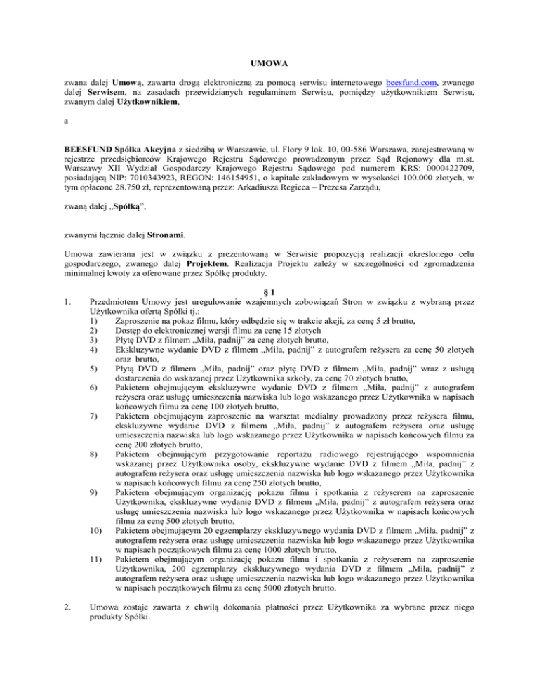 UMOWA zwana dalej Umową, zawarta drogą elektroniczną za pomocą serwisu internetowego beesfund.com, zwanego dalej Serwisem, na zasadach przewidzianych regulaminem Serwisu, pomiędzy użytkownikiem Serwisu, zwanym dalej Użytkownikiem, a BEESFUND Spółka Akcyjna z siedzibą w Warszawie, ul. Flory 9 lok. 10, 00-586 Warszawa, zarejestrowaną w rejestrze przedsiębiorców Krajowego Rejestru Sądowego prowadzonym przez Sąd Rejonowy dla m.st. Warszawy XII Wydział Gospodarczy Krajowego Rejestru Sądowego pod numerem KRS: 0000422709, posiadającą NIP: 7010343923, REGON: 146154951, o kapitale zakładowym w wysokości 100.000 złotych, w tym opłacone 28.750 zł, reprezentowaną przez: Arkadiusza Regieca – Prezesa Zarządu, zwaną dalej „Spółką”, zwanymi łącznie dalej Stronami. Umowa zawierana jest w związku z prezentowaną w Serwisie propozycją realizacji określonego celu gospodarczego, zwanego dalej Projektem. Realizacja Projektu zależy w szczególności od zgromadzenia minimalnej kwoty za oferowane przez Spółkę produkty. 1. 2. §1 Przedmiotem Umowy jest uregulowanie wzajemnych zobowiązań Stron w związku z wybraną przez Użytkownika ofertą Spółki tj.: 1) Zaproszenie na pokaz filmu, który odbędzie się w trakcie akcji, za cenę 5 zł brutto, 2) Dostęp do elektronicznej wersji filmu za cenę 15 złotych 3) Płytę DVD z filmem „Miła, padnij” za cenę złotych brutto, 4) Ekskluzywne wydanie DVD z filmem „Miła, padnij” z autografem reżysera za cenę 50 złotych oraz brutto, 5) Płytą DVD z filmem „Miła, padnij” oraz płytę DVD z filmem „Miła, padnij” wraz z usługą dostarczenia do wskazanej przez Użytkownika szkoły, za cenę 70 złotych brutto, 6) Pakietem obejmującym ekskluzywne wydanie DVD z filmem „Miła, padnij” z autografem reżysera oraz usługę umieszczenia nazwiska lub logo wskazanego przez Użytkownika w napisach końcowych filmu za cenę 100 złotych brutto, 7) Pakietem obejmującym zaproszenie na warsztat medialny prowadzony przez reżysera filmu, ekskluzywne wydanie DVD z filmem „Miła, padnij” z autografem reżysera oraz usługę umieszczenia nazwiska lub logo wskazanego przez Użytkownika w napisach końcowych filmu za cenę 200 złotych brutto, 8) Pakietem obejmującym przygotowanie reportażu radiowego rejestrującego wspomnienia wskazanej przez Użytkownika osoby, ekskluzywne wydanie DVD z filmem „Miła, padnij” z autografem reżysera oraz usługę umieszczenia nazwiska lub logo wskazanego przez Użytkownika w napisach końcowych filmu za cenę 250 złotych brutto, 9) Pakietem obejmującym organizację pokazu filmu i spotkania z reżyserem na zaproszenie Użytkownika, ekskluzywne wydanie DVD z filmem „Miła, padnij” z autografem reżysera oraz usługę umieszczenia nazwiska lub logo wskazanego przez Użytkownika w napisach końcowych filmu za cenę 500 złotych brutto, 10) Pakietem obejmującym 20 egzemplarzy ekskluzywnego wydania DVD z filmem „Miła, padnij” z autografem reżysera oraz usługę umieszczenia nazwiska lub logo wskazanego przez Użytkownika w napisach początkowych filmu za cenę 1000 złotych brutto, 11) Pakietem obejmującym organizację pokazu filmu i spotkania z reżyserem na zaproszenie Użytkownika, 200 egzemplarzy ekskluzywnego wydania DVD z filmem „Miła, padnij” z autografem reżysera oraz usługę umieszczenia nazwiska lub logo wskazanego przez Użytkownika w napisach początkowych filmu za cenę 5000 złotych brutto. Umowa zostaje zawarta z chwilą dokonania płatności przez Użytkownika za wybrane przez niego produkty Spółki. 3. 4. 5. 6. 7. 1. 2. Umowa wejdzie w życie pod warunkiem, że łączna kwota wpłat dokonanych przez użytkowników Serwisu za oferowane przez Spółkę produkty, przekroczy kwotę 6 000 zł (słownie: sześć tysięcy złotych), o czym Użytkownik zostanie niezwłocznie powiadomiony przez Spółkę. W razie niespełnienia się warunku, o którym mowa w ust. 3 powyżej, Umowa rozwiązuje się z chwilą zakończenia gromadzenia środków na realizację Projektu w Serwisie. Kwota wpłacona przez Użytkownika stanowi zaliczkę na poczet ceny za wybrane z oferty Spółki produkty. Kwota wpłacona przez Użytkownika obejmuje koszty dostarczenia towaru (jeśli dotyczy). Spółka nie może uzależniać spełnienia zaoferowanych przez siebie świadczeń wybranych w Serwisie przez Użytkownika od dokonania jakichkolwiek dodatkowych wpłat, niezależnie od tytułu płatności chyba, że Umowa stanowi inaczej. §2 Wejście w życie Umowy oznacza zobowiązanie Spółki do dostarczenia wybranego przez Użytkownika produktu, w terminie 90 od daty zakończenia Projektu. Przed wysyłką produktu do Użytkownika, Spółka zawiadomi Użytkownika o zamiarze wysłania produktu na znany Spółce adres zamieszkania Użytkownika lub adres poczty elektronicznej Użytkownika, przesyłając stosowną wiadomość pocztą elektroniczną. Użytkownik uprawniony jest do podania Spółce innego adresu dostawy produktu, przesyłając stosowną informację pocztą elektroniczną, w terminie 2 dni od daty zawiadomienia przez Spółkę. 6. §3 Użytkownikowi przysługuje prawo do odstąpienia od Umowy w terminie 10 dni od dnia dostarczenia zamówionych przez niego produktów poprzez przesłanie oświadczenia o odstąpieniu od Umowy na adres Spółki. Prawo odstąpienia nie przysługuje w przypadku usunięcia oryginalnego opakowania produktu dostarczonego w formie płyty DVD. W przypadku odstąpienia od Umowy Użytkownik jest zobowiązany do odesłania otrzymanych produktów na adres Spółki, z wykorzystaniem usług Poczty Polskiej lub firmy kurierskiej uzgodnionej ze Spółką, w terminie 14 dni od dnia otrzymania przez Spółkę oświadczenia o odstąpieniu od Umowy, zaś odnośnie produktów dostarczonych droga elektroniczną, do zniszczenia/usunięcia wszelkich posiadanych egzemplarzy/kopii produktu oraz usunięcia produktu Spółki z nośników informatycznych (takich jak np