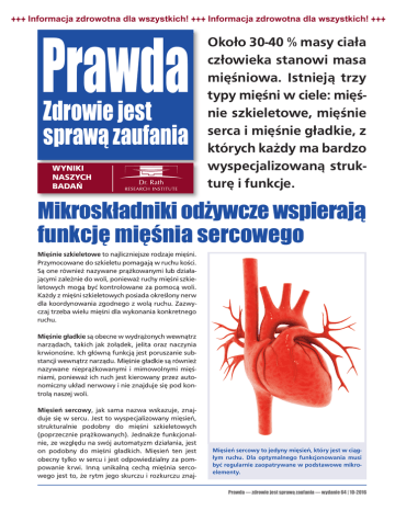 +++ Informacja zdrowotna dla wszystkich! +++ Informacja zdrowotna dla wszystkich! +++ Prawda Zdrowie jest sprawą zaufania WYNIKI NASZYCH BADAŃ Około 30-40 % masy ciała człowieka stanowi masa mięśniowa. Istnieją trzy typy mięśni w ciele: mięśnie szkieletowe, mięśnie serca i mięśnie gładkie, z których każdy ma bardzo wyspecjalizowaną strukturę i funkcje. Mikroskładniki odżywcze wspierają funkcję mięśnia sercowego Mięśnie szkieletowe to najliczniejsze rodzaje mięśni. Przymocowane do szkieletu pomagają w ruchu kości. Są one również nazywane prążkowanymi lub działającymi zależnie do woli, ponieważ ruchy mięśni szkieletowych mogą być kontrolowane za pomocą woli. Każdy z mięśni szkieletowych posiada określony nerw dla koordynowania zgodnego z wolą ruchu. Zazwyczaj trzeba wielu mięśni dla wykonania konkretnego ruchu. Mięśnie gładkie są obecne w wydrążonych wewnątrz narządach, takich jak żołądek, jelita oraz naczynia krwionośne. Ich główną funkcją jest poruszanie substancji wewnątrz narządu. Mięśnie gładkie są również nazywane nieprążkowanymi i mimowolnymi mięśniami, ponieważ ich ruch jest kierowany przez autonomiczny układ nerwowy i nie znajduje się pod kontrolą naszej woli. Mięsień sercowy, jak sama nazwa wskazuje, znajduje się w sercu. Jest to wyspecjalizowany mięsień, strukturalnie podobny do mięśni szkieletowych (poprzecznie prążkowanych). Jednakże funkcjonalnie, ze względu na swój automatyzm działania, jest on podobny do mięśni gładkich. Mięsień ten jest obecny tylko w sercu i jest odpowiedzialny za pompowanie krwi. Inną unikalną cechą mięśnia sercowego jest to, że rytm jego skurczu i rozkurczu znaj- Mięsień sercowy to jedyny mięsień, który jest w ciągłym ruchu. Dla optymalnego funkcjonowania musi być regularnie zaopatrywane w podstawowe mikroelementy. Prawda — zdrowie jest sprawą zaufania — wydanie 64 | 10-2016 Mikroskładniki odżywcze wspierają funkcję mięśnia sercowego duje się pod kontrolą "naturalnego stymulatora" znajdującego się w sercu (węzeł zatokowo-przedsionkowy), który jest również zbudowany z tkanki mięśnia sercowego. Z powodu tej właściwości mięsień sercowy jest traktowany jako autorytmiczny w układzie przewodzącym serca. W przeciwieństwie do mięśni szkieletowych i gładkich, mięsień sercowy jest jedynym, który musi stale pracować w tym samym miejscu w ciągu całego naszego życia. Serce ludzkie przepompowuje około 5 litrów krwi w całym organizmie w każdej minucie. Nie dziwi więc, że mięsień sercowy potrzebuje stałego dopływu składników odżywczych dla ciągłego i optymalnego funkcjonowania. Gdy ciało doświadcza przewlekłego niedoboru niezbędnych mikroskładników odżywczych, skutki są wyraźnie widoczne w funkcjonowaniu serca poniżej optymalnego poziomu, co przejawia się w postaci różnych chorób, takich jak choroba mięśnia sercowego, choroby zastawek serca, nieregularne bicie serca (arytmia) i niewydolność serca. Kardiomiopatia jest chorobą, w której mięsień sercowy staje się zapalony, powiększony i usztywniony, czyli zasadniczo traci swoją elastyczność. Powoduje to zmniejszenie dopływu krwi do wszystkich narządów w organizmie i wynikających stąd konsekwencji. Według naszych badań większość chorób układu sercowo-naczyniowego występuje w wyniku przewlekłego niedoboru pewnych substancji odżywczych i można im zapobiec przez odpowiednią suplementację. W szczególności witaminy grupy B, karnityna, tauryna i koenzym Q-10 są kluczowymi mikroskładnikami odżywczymi wspierającymi metabolizm i wytwarzają niezbędną bioenergię wymaganą dla optymalnej pracy serca. Jednak te mikroskładniki odżywcze muszą być także wspomagane przez inne mikroskładniki odżywcze, które działają w synergii ze sobą oraz nasilają działanie tych zasadniczych. Stwierdziliśmy, że takie współdziałanie może być osiągnięte poprzez połączenie powyższych składników odżywczych z witaminą C, kwasem alfa-liponowym, kwasem alfa-ketoglutaranowym i innymi składnikami. Nasze badania kliniczne prowadzą do wniosku, że specyficzna kombinacja mikroskładników odżywczych wspomaga zdrową funkcję komórek serca oraz daje optymalne wsparcie i produkcję bioenergii w mięśniu sercowym. Informacja zdrowotna dla wszystkich! Niniejsza informacja jest dostarczana dzięki uprzejmości Instytutu Badawczego dr Ratha. Kierowany przez dwóch byłych współpracowników dwukrotnego laureata Nagrody Nobla Linusa Paulinga (zm. w 1994 r.), Instytut ten stał się liderem przełomowych badań nad naturalnymi metodami ochrony zdrowia w zakresie raka, chorób układu krążenia i innych powszechnych chorób. Instytut jest jednostką w 100% zależną od niedochodowej Fundacji Dr. Ratha. • Możesz wydrukować kopie tych Aktualności ze strony: www4pl.dr-rath-foundation.org/ research_news/index.html, i podzielić się nimi ze swoimi przyjaciółmi i znajomymi. Przełomowy charakter tych badań stanowi zagrożenie dla liczonego w miliardach dolarów, farmaceutycznego "biznesu zarabiania na chorobie." Nie jest zaskoczeniem, że przez wiele lat lobby farmaceutyczne atakowało Dr Ratha i jego zespół badawczy, próbując wyciszyć ich przesłanie. Nadaremnie. Podczas tej bitwy dr Rath stał się znanym na całym świecie zwolennikiem medycyny naturalnej mówiąc: "Nigdy w historii medycyny naukowcy nie byli tak zaciekle atakowani za swoje odkrycia. To nam przypomina, że zdrowie nie jest nam dane dobrowolnie, ale musimy o nie walczyć." • © 2016 Dr. Rath Research Institute, Santa Clara, California, USA. Zachęcamy do rozpowszechniania tej ulotki pod warunkiem, że jej treść pozostaje bez zmian. Art.-Nr. 6564 Prawda — zdrowie jest sprawą zaufania — wydanie 64 | 10-2016 • Ta informacja jest oparta na wynikach badań naukowych. Nie ma ona jednak zastępować porady lekarskiej co do zabiegów, lec
