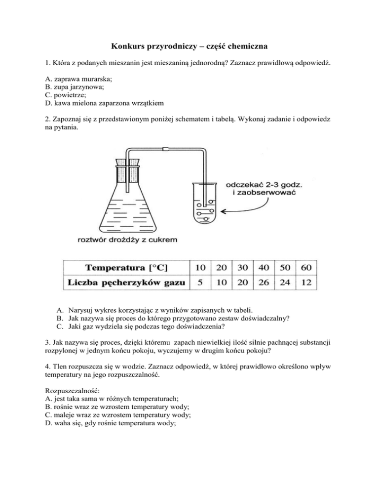 Konkurs przyrodniczy – część chemiczna 1. Która z podanych mieszanin jest mieszaniną jednorodną? Zaznacz prawidłową odpowiedź. A. zaprawa murarska; B. zupa jarzynowa; C. powietrze; D. kawa mielona zaparzona wrzątkiem 2. Zapoznaj się z przedstawionym poniżej schematem i tabelą. Wykonaj zadanie i odpowiedz na pytania. A. Narysuj wykres korzystając z wyników zapisanych w tabeli. B. Jak nazywa się proces do którego przygotowano zestaw doświadczalny? C. Jaki gaz wydziela się podczas tego doświadczenia? 3. Jak nazywa się proces, dzięki któremu zapach niewielkiej ilość silnie pachnącej substancji rozpylonej w jednym końcu pokoju, wyczujemy w drugim końcu pokoju? 4. Tlen rozpuszcza się w wodzie. Zaznacz odpowiedź, w której prawidłowo określono wpływ temperatury na jego rozpuszczalność. Rozpuszczalność: A. jest taka sama w różnych temperaturach; B. rośnie wraz ze wzrostem temperatury wody; C. maleje wraz ze wzrostem temperatury wody; D. waha się, gdy rośnie temperatura wody; 5. W radio podano wiadomość o zaczadzeniu pewnej rodziny. Napisz, jaki gaz spowodował tę tragedię. 6. Woda morska jest słona. Zasolenie jest spowodowane zawartością soli rozpuszczonej w wodzie. Jeśli zasolenie wynosi 7,8 ‰ (promili) oznacza to, że A. B. C. D. w 1 litrze wody rozpuszczone jest 7,8 g soli. w 1 litrze wody rozpuszczone jest 7,8 mg soli. w 100 g roztworu rozpuszczone jest 7,8 g soli. w 1 kg roztworu rozpuszczone jest 7,8 g soli. 7. Z poniższych piktogramów wybierz ten, który informuje o możliwości dalszego przetwarzania danego opakowania. 8. Lasy sosnowe są ważnym producentem ozonu, powstającego w procesie utleniania pinenu (składnika terpentyny w sosnach). Jaki wzór ma cząsteczka ozonu? Jaki znaczenie ma ozon dla środowiska i człowieka? 9. Który rysunek przedstawia model budowy dwutlenku węgla? 10.