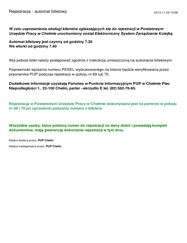 Rejestracja - automat biletowy 2013-11-24 13:58 W celu usprawnienia obsługi klientów zgłaszających się do rejestracji w Powiatowym Urzędzie Pracy w Chełmie uruchomiony został Elektroniczny System Zarządzania Kolejką. Automat biletowy jest czynny od godziny 7.30 We wtorki od godziny 7.40 Aby pobrać bilet należy postępować zgodnie z instrukcją umieszczoną na automacie biletowym. Poprawność wpisania numeru PESEL wydrukowanego na bilecie będzie weryfikowana przez pracownika PUP podczas rejestracji w pokoju nr 69 lub 70. Dodatkowe informacje uzyskają Państwo w Punkcie Informacyjnym PUP w Chełmie Plac Niepodległości 1, 22-100 Chełm, parter –skrzydło E tel. (82) 562-76-95. Rejestracja w Powiatowym Urzędzie Pracy w Chełmie dokonywana jest na parterze w pokoju nr 69 i 70 po uprzednim pobraniu numeru z biletera. Wszystkie osoby, które pobiorą numer do rejestracji na dany dzień i posiadają komplet dokumentów, mają gwarancję dokonania rejestracji w tym dniu. Artykuł dodany przez: PUP Chełm Artykuł zredagowany przez: PUP Chełm