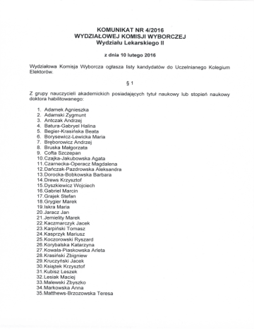 KOMUNIKATNR4/2016 WYDZIALOWEJ KOMISJI WYBORCZEJ Wydzialu Lekarskiego II zdnia 10 lutego 2016 Wydziatowa Komisja Wyborcza oglasza listy kandydatow do Uczelnianego Kolegium Elektorow. §1 Z grupy nauczycieli akademickich posiadaja^cych tytul naukowy lub stopieri naukowy doktora habilitowanego: 1. Adamek Agnieszka 2. Adamski Zygmunt 3. Antczak Andrzej 4. Batura-Gabryel Halina 5. Begier-Krasihska Beata 6. Borysewicz-Lewicka Maria 7. Br^borowicz Andrzej 8. Bruska Malgorzata 9. Cofta Szczepan lO.Czajka-Jakubowska Agata H.Czarnecka-Operacz Magdalena 12.Dahczak-Pazdrowska Aleksandra 13.Dorocka-Bobkowska Barbara 14. Drews Krzysztof 15. Dyszkiewicz Wojciech 16. Gabriel Marcin 17. Grajek Stefan 18.Grygier Marek 19.lskra Maria 20.Jaracz Jan 21.Jemielity Marek 22.Kaczmarczyk Jacek 23.Karpihski Tomasz 24.Kasprzyk Mariusz 25.Koczorowski Ryszard 26.Korybalska Katarzyna 27.Kowala-Piaskowska Arleta 28.Krasihski Zbigniew 29.Kruczyhski Jacek SO.Ksiazek Krzysztof SlKubisz Leszek 32.Lesiak Maciej SS.Malewski Zbyszko 34.Markowska Anna 35.Matthews-Brzozowska Teresa 36.Mazela Jan 37.Mozer-l_isewska Iwona 38.Mrowczyhski Wojciech 39.Mularek-Kubzdela Tatiana 40.Nowicki Michal 41.0smola-Mahkowska Agnieszka 42.Pawlaczyk-Gabriel Katarzyna 43.Perek Bartlomiej 44.Piorunek Tomasz 45.Piwkowski Cezary 46.Posadzy-Mataczyriska Anna 47.Pyda Malgorzata 48.Ruchata Marek 49.Rybakowski Janusz 50. Seremak-Mrozikiewicz Agnieszka 51.Simon Marek 52.Slowihski Krzysztof 53.Sokalski Jerzy 54.Twarowska-Hauser Joanna 55.Wojtalik Michal 56.Zabel Maciej 57.Zozuliriska-Zi6tkiewicz Dorota §2 Z grupy pozostatych nauczycieli akademickich: 1. Bryl Nadia 2. Buczkowski Piotr 3. Celczyriska-Bajew Liliana 4. Chtapowska Joanna 5. Dytfeld Joanna 6. Gerreth Karolina 7. Gromadziriska -Zaptata Ewa 8. Komosa Anna 9. Kornacka Alicja 10.Korzeniowska-Kromer Ewa 11. Kosicka Teresa 12.Maliriska Agnieszka 13.Marcinkowska Michalina 14.Misterski Marcin 15.Niklas Arkadiusz 16.Nosowicz Wojciech 17.Olasihska-Wisniewska Anna 18.Paszynska Elzbieta 19.Piescikowska Izabela 20.Porowski Leszek 21.Rutz-Danielczak Aleksandra 22.Sujka-Kordowska Patrycja 23.Szyszka-Mroz Jolanta 24.Uruska Aleksandra 25.Wawrzyniak Anna 26.Wroblewska-Seniuk Katarzyna §3 Z grupy pracownikow naukowo-technicznych i pracownikow inzynieryjno-technicznych: 1. 2. 3. 4. 5. Glinka Anna Kowalska Katarzyna Pakuta Martyna Podemska Zuzanna Uruski Pawef Przewodniczqca Wydziabwej Komisji Wyborczej Wydziatu Lekatskiego II J prof, dr hab. med. Olga Trojnarska