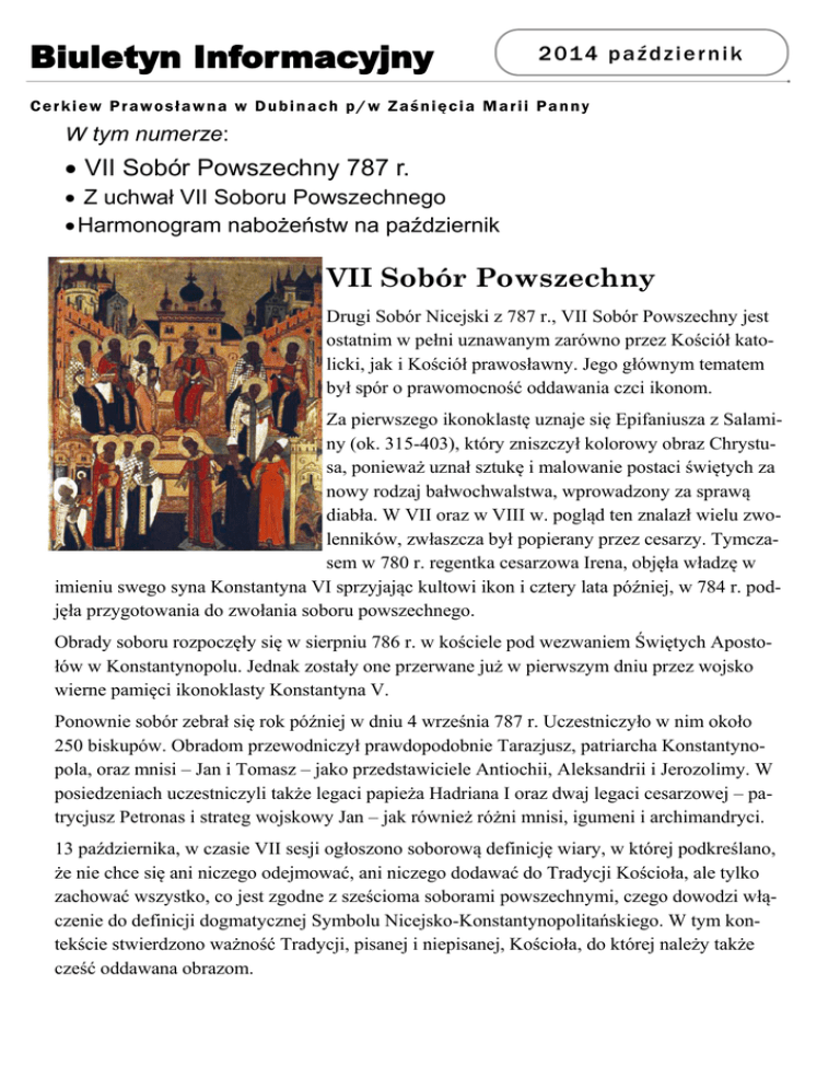 Biuletyn Informacyjny 2 01 4 p a ź d z i e r n i k Cerkiew Prawosławna w Dubinach p/w Zaśnięcia Marii Panny W tym numerze: VII Sobór Powszechny 787 r. Z uchwał VII Soboru Powszechnego Harmonogram nabożeństw na październik VII Sobór Powszechny Drugi Sobór Nicejski z 787 r., VII Sobór Powszechny jest ostatnim w pełni uznawanym zarówno przez Kościół katolicki, jak i Kościół prawosławny. Jego głównym tematem był spór o prawomocność oddawania czci ikonom. Za pierwszego ikonoklastę uznaje się Epifaniusza z Salaminy (ok. 315-403), który zniszczył kolorowy obraz Chrystusa, ponieważ uznał sztukę i malowanie postaci świętych za nowy rodzaj bałwochwalstwa, wprowadzony za sprawą diabła. W VII oraz w VIII w. pogląd ten znalazł wielu zwolenników, zwłaszcza był popierany przez cesarzy. Tymczasem w 780 r. regentka cesarzowa Irena, objęła władzę w imieniu swego syna Konstantyna VI sprzyjając kultowi ikon i cztery lata później, w 784 r. podjęła przygotowania do zwołania soboru powszechnego. Obrady soboru rozpoczęły się w sierpniu 786 r. w kościele pod wezwaniem Świętych Apostołów w Konstantynopolu. Jednak zostały one przerwane już w pierwszym dniu przez wojsko wierne pamięci ikonoklasty Konstantyna V. Ponownie sobór zebrał się rok później w dniu 4 września 787 r. Uczestniczyło w nim około 250 biskupów. Obradom przewodniczył prawdopodobnie Tarazjusz, patriarcha Konstantynopola, oraz mnisi – Jan i Tomasz – jako przedstawiciele Antiochii, Aleksandrii i Jerozolimy. W posiedzeniach uczestniczyli także legaci papieża Hadriana I oraz dwaj legaci cesarzowej – patrycjusz Petronas i strateg wojskowy Jan – jak również różni mnisi, igumeni i archimandryci. 13 października, w czasie VII sesji ogłoszono soborową definicję wiary, w której podkreślano, że nie chce się ani niczego odejmować, ani niczego dodawać do Tradycji Kościoła, ale tylko zachować wszystko, co jest zgodne z sześcioma soborami powszechnymi, czego dowodzi włączenie do definicji dogmatycznej Symbolu Nicejsko-Konstantynopolitańskiego. W tym kontekście stwierdzono ważność Tradycji, pisanej i niepisanej, Kościoła, do której należy także cześć oddawana obrazom. Str. 2 B i u l et y n I n f o r m a c y j n y Sobór zakończono uroczyście 23 października w Konstantynopolu, w pałacu cesarskim Magnaura. Cesarzowa-regentka Irena i cesarz Konstantyn VI podpisali tomos zawierający oficjalne określenie prawomocności kultu ikon jako władcy państwa oraz przedstawiciele wszystkich starożytnych patriarchatów. Do akt weszły także 22 kanony, o których nie wiadomo jednak z pewnością, jak i kiedy zostały promulgowane; mają one charakter prawodawczy, administracyjny i dyscyplinarny. Chociaż w latach bezpośrednio następujących po II Soborze Nicejskim recepcja jego ustaleń napotykała na wiele przeszkód, jednak jego autorytet pozostał niezachwiany. Znalazło to wyraz w uchwałach Synodu lokalnego w Konstantynopolu, który w dniu 4 marca 843 r. potwierdził decyzje i definicję wiary ustalone w Nicei w 787 roku. Z uchwał VII Soboru Powszechnego 13. Zachowujemy nienaruszoną całą przekazaną nam tradycję Cerkwi, zarówno pisaną, jak i niepisaną. Jednym z elementów tej tradycji jest malowanie wizerunków na ikonach, w ten sposób, by obraz był zgodny z przekazem podanym przez Ewangelie, aby te wizerunki potwierdzały, że Słowo Boże naprawdę było człowiekiem, a nie wytworem fantazji, i abyśmy mieli z tego korzyść, utwierdzając się w tej wierze. Albowiem wizerunek i rzecz, którą wyobraża wskazują na siebie nawzajem i stanowią niedwuznacznie swoje odzwierciedlenie. 14. W ten oto sposób, postępując jakby królewską drogą za Bożą nauką naszych świętych Ojców i za Tradycją Cerkwi – wiemy przecież, że w nim przebywa Święty Duch – orzekamy z całą dokładnością i z troską o wiarę, że przedmiotem kultu powinny być nie tylko wizerunki drogocennego i ożywiającego Krzyża, lecz tak samo czcigodne i święte ikony malowane, ułożone w mozaikę lub wykonane innym sposobem, które umieszcza się ze czcią w świętych kościołach Bożych, na naczyniach liturgicznych i na szatach, na ścianach czy na desce, w domach czy przy drogach. 15. Są one wyobrażeniami naszego Pana Jezusa Chrystusa, Boga i Zbawiciela, Niepokalanej Pani naszej, świętej Bożej Rodzicielki, godnych czci Aniołów oraz wszystkich świętych i świątobliwych mężów. Im częściej wierni będą patrzeć na ich ikonograficzne przedstawienia, tym bardziej, oglądając je będą się zachęcać do wspominania i miłowania pierwowzorów, do oddawania im czci i pokłonu. 16. Nie otacza się ich jednak taką adoracją, jaka według naszej wiary należy się wyłącznie Naturze Bożej. Oddaje im się hołd przez ofiarowanie kadzidła i zapalanie świateł, podobnie jak to się czyni przed wizerunkiem drogocennego i ożywiającego Krzyża, przed świętymi Ewangeliami i innymi przedmiotami kultu, jak to było w pobożnym zwyczaju u przodków. „Cześć oddawana wizerunkowi przechodzi na prototyp”; a kto składa hołd ikonie, ten go składa Istocie, którą ikona przedstawia. 17. Tak oto umocnione jest nauczanie naszych świętych Ojców czyli Tradycja Cerkwi powszechnej, który przyjęła Ewangelię od krańca do krańca ziemi. W ten sposób podążamy za nauką Pawła, który przemawiał w imię Chrystusa, za boskim kolegium apostolskim i za świętymi Ojcami, podtrzymując tradycje, które od nich otrzymaliśmy. Str. 3 Harmonogram nabożeństw październik 2014 4 październik (sobota) Godz. 17:00 Wsienoszcznoje bdienije 5 październik 17 niedziela po Pięćdziesiątnicy Godz. 9:00 Liturgia w cerkwi w Dubinach 11 październik (sobota) Godz. 17:00 Wsienoszcznoje bdienije 12 październik 18 niedziela po Pięćdziesiątnicy Godz. 9:00 Liturgia w cerkwi w Dubinach 14 październik (wtorek) święto Pokrow Preswiatoj Bogorodicy Godz 8:00 Ak