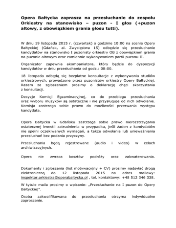 Opera Bałtycka zaprasza na przesłuchanie do zespołu Orkiestry na stanowisko – puzon - I głos (+puzon altowy, z obowiązkiem grania głosu tutti). W dniu 19 listopada 2015 r. (czwartek) o godzinie 10:00 na scenie Opery Bałtyckiej (Gdańsk, al. Zwycięstwa 15) odbędzie się przesłuchanie kandydatów na stanowisko I puzonisty orkiestry OB z obowiązkiem grania na puzonie altowym oraz zamiennie wykonywaniem partii puzonu II. Organizator zapewnia akompaniatora, który będzie kandydatów w dniu przesłuchania od godz.: 08:00. do dyspozycji 18 listopada odbędą się bezpłatne konsultacje z wykonywania studiów orkiestrowych, prowadzone przez puzonistów orkiestry Opery Bałtyckiej. Razem ze zgłoszeniem prosimy o deklarację chęci skorzystania z konsultacji. Decyzje Komisji Egzaminacyjnej, co do przebiegu przesłuchania oraz wyboru muzyków są ostateczne i nie przysługuje od nich odwołanie. Komisja zastrzega sobie prawo do możliwości przerwania występu kandydata. Opera Bałtycka w Gdańsku zastrzega sobie prawo nierozstrzygania ostatecznej kwestii zatrudnienia w przypadku, jeśli żaden z kandydatów nie spełni oczekiwanych wymagań, a także odwołania lub unieważnienia przesłuchań bez podania przyczyny. Przesłuchania będą archiwizacyjnych. Opera nie rejestrowane zwraca kosztów (audio podróży i video) oraz w celach zakwaterowania. Dokumenty i zgłoszenia (list motywacyjny + CV) prosimy nadsyłać drogą elektroniczną do 12 listopada 2015 na adres mailowy: [email protected] , tel. kontaktowy: +48 512 346 338. W tytule maila prosimy o wpisanie: „Przesłuchanie na I puzon do Opery Bałtyckiej”. Osoba zakwalifikowana zaproszenie. do przesłuchania otrzyma indywidualne Program przesłuchań na I puzon: ETAP I (za kotarą): Do wyboru: F. David – Concertino na puzon i orkiestrę Es - dur, Op. 4; L. Grøndahl – Concerto na puzon ETAP II: Studia orkiestrowe – fragmenty do przygotowania: Puzon: • • • • • • W. A. Mozart – Requiem - Tuba mirum M. Ravel – Bolero A. Borodin – Kniaź Igor – Tańce połowieckie G. Verdi – Otello G. Puccini – Tosca G. Bizet - Carmen Puzon altowy: • • W. A. Mozart – Requiem – VIII. Communio; W. A. Mozart – Czarodziejski flet – Nr 10 Aria mit Chor; Studia orkiestrowe dla zainteresowanych osób w formacie PDF dostępne są tutaj. Przy dużej liczbie kandydatów czas trwania przesłuchań może zostać skrócony. W przypadku wyrównanego poziomu finalistów ETAPU II dopuszcza się ETAP III, czyli czynne uczestnictwo w próbie orkiestry do aktualnego repertuaru Opery. Termin Etapu III zostanie ustalony indywidualnie ze zwycięzcami Etapu II.