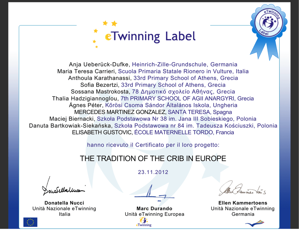 Anja Ueberück-Dufke, Heinrich-Zille-Grundschule, Germania Maria Teresa Carrieri, Scuola Primaria Statale Rionero in Vulture, Italia Anthoula Karathanassi, 33rd Primary School of Athens, Grecia Sofia Bezertzi, 33rd Primary School of Athens, Grecia Sossana Mastrokosta, 78 Δημοτικό σχολείο Αθήνας, Grecia Thalia Hadzigiannoglou, 7th PRIMARY SCHOOL OF AGII ANARGYRI, Grecia Ágnes Péter, Kőrösi Csoma Sándor Általános Iskola, Ungheria MERCEDES MARTINEZ GONZALEZ, SANTA TERESA, Spagna Maciej Biernacki, Szkoła Podstawowa Nr 38 im. Jana III Sobieskiego, Polonia Danuta Bartkowiak-Siekańska, Szkoła Podstawowa nr 84 im. Tadeusza Kościuszki, Polonia ELISABETH GUSTOVIC, ÉCOLE MATERNELLE TORDO, Francia hanno ricevuto il Certificato per il loro progetto: THE TRADITION OF THE CRIB IN EUROPE 23.11.2012 Donatella Nucci Unità Nazionale eTwinning Italia Marc Durando Unità eTwinning Europea Ellen Kammertoens Unità Nazionale eTwinning Germania