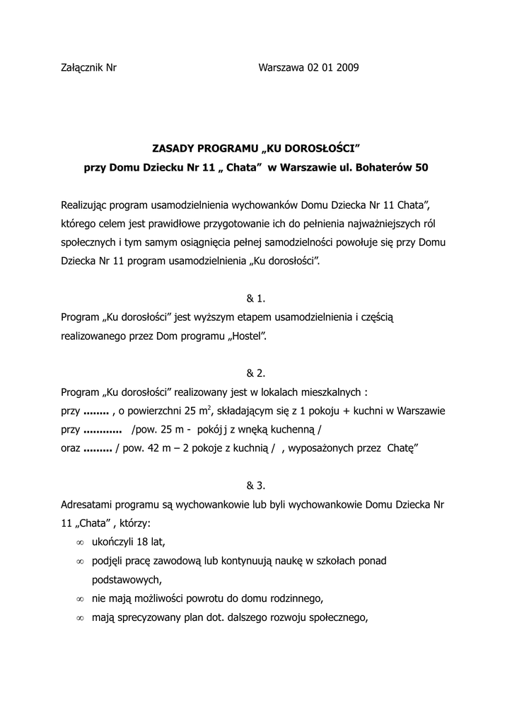 Załącznik Nr Warszawa 02 01 2009 ZASADY PROGRAMU „KU DOROSŁOŚCI” przy Domu Dziecku Nr 11 „ Chata” w Warszawie ul. Bohaterów 50 Realizując program usamodzielnienia wychowanków Domu Dziecka Nr 11 Chata”, którego celem jest prawidłowe przygotowanie ich do pełnienia najważniejszych ról społecznych i tym samym osiągnięcia pełnej samodzielności powołuje się przy Domu Dziecka Nr 11 program usamodzielnienia „Ku dorosłości”. & 1. Program „Ku dorosłości” jest wyższym etapem usamodzielnienia i częścią realizowanego przez Dom programu „Hostel”. & 2. Program „Ku dorosłości” realizowany jest w lokalach mieszkalnych : przy ........ , o powierzchni 25 m2, składającym się z 1 pokoju + kuchni w Warszawie przy ............ /pow. 25 m - pokój j z wnęką kuchenną / oraz ......... / pow. 42 m – 2 pokoje z kuchnią / , wyposażonych przez Chatę” & 3. Adresatami programu są wychowankowie lub byli wychowankowie Domu Dziecka Nr 11 „Chata” , którzy: • ukończyli 18 lat, • podjęli pracę zawodową lub kontynuują naukę w szkołach ponad podstawowych, • nie mają możliwości powrotu do domu rodzinnego, • mają sprecyzowany plan dot. dalszego rozwoju społecznego, & 4. Osoby zdecydowane na uczestnictwo w programie składają pisemną prośbę do Dyrektora Domu . Decyzję o uczestnictwie w programie podejmuje Dyrektor Centrum Pomocy Rodzinie na wniosek Dyrektora Domu / decyzja administracyjna/ & 5. Wychowankowie zakwalifikowani do uczestnictwa w programie zawierają z Dyrektorem Domu indywidualny kontrakt określający: • czas pobytu /nie dłuższy niż 1 rok z możliwością negocjacji w indywidualnych przypadkach/, • zadania i cele realizowane w trakcie uczestnictwa w programie, • zobowiązania do przestrzegania zasad ustalonych wewnętrznym regulaminem, • zobowiązania do pokrywania kosztów utrzymania mieszkania /czynsz, gaz, energia/ w części ma przynależnej. & 6. Rażące naruszanie zasad kontraktu zrywa go ze skutkiem natychmiastowym. & 7. Osobą pełniącą funkcję doradcy i mediatora z ramienia Chaty jest pracownik socjalny. Dyrektor Chaty wyznacza pracownika merytorycznego który jest odpowiedzialny za mieszkania chronione.
