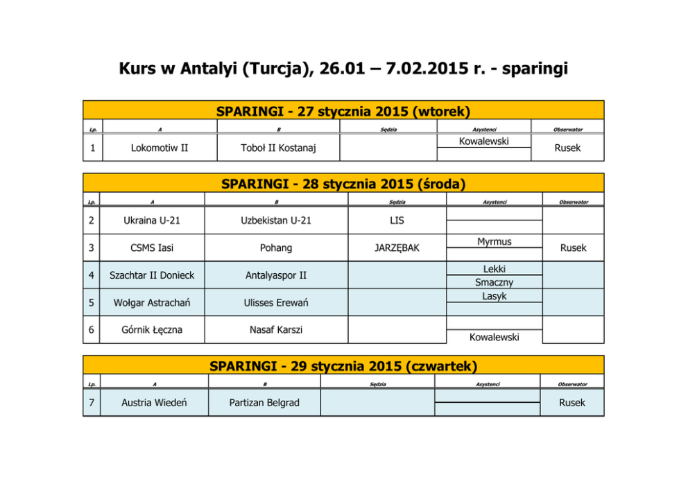 Kurs w Antalyi (Turcja), 26.01 – 7.02.2015 r. - sparingi SPARINGI - 27 stycznia 2015 (wtorek) Lp. A B 1 Lokomotiw II Toboł II Kostanaj Sędzia Asystenci Kowalewski Obserwator Rusek SPARINGI - 28 stycznia 2015 (środa) Lp. A B Sędzia 2 Ukraina U-21 Uzbekistan U-21 LIS 3 CSMS Iasi Pohang JARZĘBAK 4 Szachtar II Donieck Antalyaspor II 5 Wołgar Astrachań Ulisses Erewań 6 Górnik Łęczna Nasaf Karszi Asystenci Myrmus Obserwator Rusek Lekki Smaczny Lasyk Kowalewski SPARINGI - 29 stycznia 2015 (czwartek) Lp. A B 7 Austria Wiedeń Partizan Belgrad Sędzia Asystenci Obserwator Rusek 8 Viitorul Konstanca Buniodkor Taszkent LASYK 9 Lech Poznań Metalist Charków WAJDA Lekki Lis Myrmus SPARINGI - 30 stycznia 2015 (piątek) Lp. A B 10 Pogoń Szczecin Wolfsberger AC 11 Dynamo Tbilisi Worskła Połtawa 12 Szachtar II Donieck Myanmar U-20 Sędzia Asystenci Obserwator Kowalewski Myrmus SMACZNY Jarzębak Rusek