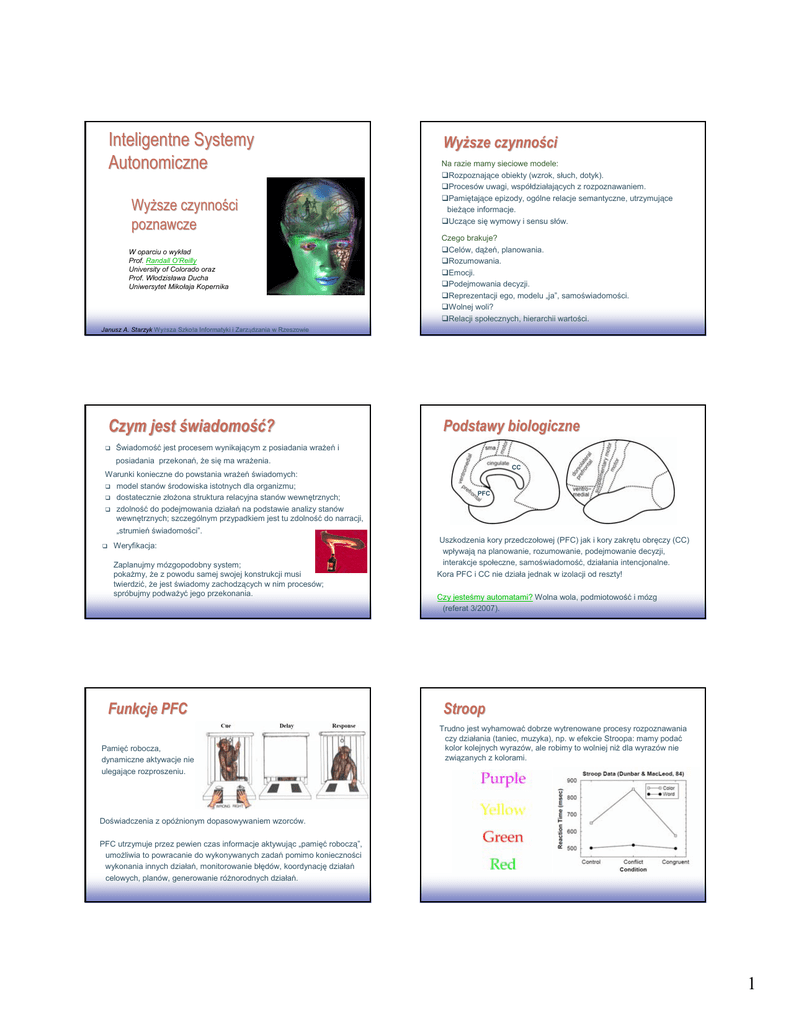 Inteligentne Systemy Autonomiczne Wyż Wyższe czynnoś czynności Na razie mamy sieciowe modele: Rozpoznające obiekty (wzrok, słuch, dotyk). Procesów uwagi, współdziałających z rozpoznawaniem. Pamiętające epizody, ogólne relacje semantyczne, utrzymujące bieżące informacje. Uczące się wymowy i sensu słów. Wyż Wyższe czynnoś czynności poznawcze W oparciu o wykład Prof. Randall O'Reilly University of Colorado oraz Prof. Włodzisława Ducha Uniwersytet Mikołaja Kopernika 1 EE141 Janusz Czego brakuje? Celów, dążeń, planowania. Rozumowania. Emocji. Podejmowania decyzji. Reprezentacji ego, modelu „ja”, samoświadomości. Wolnej woli? Relacji społecznych, hierarchii wartości. 2 EE141 A. Starzyk Wyższa Szkoła Informatyki i Zarządzania w Rzeszowie Czym jest śświadomość? wiadomość? Podstawy biologiczne Świadomość jest procesem wynikającym z posiadania wrażeń i posiadania przekonań, że się ma wrażenia. CC Warunki konieczne do powstania wrażeń świadomych: model stanów środowiska istotnych dla organizmu; dostatecznie złożona struktura relacyjna stanów wewnętrznych; zdolność do podejmowania działań na podstawie analizy stanów wewnętrznych; szczególnym przypadkiem jest tu zdolność do narracji, PFC „strumień świadomości”. Uszkodzenia kory przedczołowej (PFC) jak i kory zakrętu obręczy (CC) wpływają na planowanie, rozumowanie, podejmowanie decyzji, interakcje społeczne, samoświadomość, działania intencjonalne. Kora PFC i CC nie działa jednak w izolacji od reszty! Weryfikacja: Zaplanujmy mózgopodobny system; pokażmy, że z powodu samej swojej konstrukcji musi twierdzić, że jest świadomy zachodzących w nim procesów; spróbujmy podważyć jego przekonania. 3 EE141 Czy jesteśmy automatami? Wolna wola, podmiotowość i mózg (referat 3/2007). 4 EE141 Funkcje PFC Stroop Trudno jest wyhamować dobrze wytrenowane procesy rozpoznawania czy działania (taniec, muzyka), np. w efekcie Stroopa: mamy podać kolor kolejnych wyrazów, ale robimy to wolniej niż dla wyrazów nie związanych z kolorami. Pamięć robocza, dynamiczne aktywacje nie ulegające rozproszeniu. Doświadczenia z opóźnionym dopasowywaniem wzorców. PFC utrzymuje przez pewien czas informacje aktywując „pamięć roboczą”, umożliwia to powracanie do wykonywanych zadań pomimo konieczności wykonania innych działań, monitorowanie błędów, koordynację działań celowych, planów, generowanie różnorodnych działań. 5 EE141 6 EE141 1 Model Stroopa Stroop: Stroop: kształ kształty Rozpoznawanie słów bądź kolorów. Poziom fonologiczny: nieistniejące słowa nie wzbudzają głębszych obszarów. Poziom głęboki: błędy fonologiczne i semantyczne (kąt – kot, kot - pies), pomyłki w rozpoznawaniu znaków. Wyniki są całkiem zgodne z doświadczeniem. Jest sporo wariantów tego doświadczenia i możliwości śledzenia zmian w czasie wielokrotnego powtarzania. 7 EE141 Powierzchniowe obserwacje: nowe słowa + dostęp semantyczny + trudności w czytaniu wyjątków + pomyłki w rozpoznawaniu. 8 EE141 Stroop: Stroop: kształ kształty Dynamiczna kategoryzacja Wisconsin card sort test WCST Sortowanie według koloru W WCST pacjenci maja sortować karty według jednego z wybranych wzorców – kształtu, koloru lub liczby figur Powierzchniowe obserwacje: nowe słowa + dostęp semantyczny + trudności w czytaniu wyjątków + pomyłki w rozpoznawaniu. 9 EE141 Zmiana zasad sortowania jest utrudniona wśród pacjentów z uszkodzeniami przedniej kory Dynamiczna kategoryzacja Dynamiczna kategoryzacja Sortowanie według koloru Wisconsin card sort Badania tego typu pozwalają na lokalizacje specyficznych rodzajów przetwarzania informacji w mózgu Sortowanie według koloru Wisconsin card sort 11 EE141 10 EE141 12 EE141 2 Dynamiczna kategoryzacja Dział Działania synaptyczne i dynamiczne Decyzja jaki podjąć wybór Wisconsin card sort: pacjenci z uszkodzeniami kory przedczołowej trzymają się pierwszej reguły i nie potrafią jej zmienić. 13 EE141 Kategoryzacja dynamiczna 14 Kategoryzacja dynamiczna Decyzja jaki podjąć wybór – prosty test przeprowadzany na małpach Należy wybrać jeden z obrazów przedstawiający ta sama 2D figurę Po tym jak badany osobnik osiągał 90% poprawnych wyników zasada została zmieniona i należy wybrać a) nowa 2D figurę (IDS) b) ta sama 1D figurę (EDR) c) nowa 1D figurę (EDS) d) odwrócić role (IDR) - przy odwróceniu rol wybieramy figurę ta której nie wybieraliśmy przedtem Powierzchniowe obserwacje: nowe słowa + dostęp semantyczny + trudności w czytaniu wyjątków + pomyłki w rozpoznawaniu. Powierzchniowe obserwacje: nowe słowa + dostęp semantyczny + trudności w czytaniu wyjątków + pomyłki w rozpoznawaniu. EE141 Orbital PFC: reprezentuje cechy, boczna PFC abstrakcyjne wymiary. Albo ... Orbital = hamowanie afektywne Lateral = wybór dzięki uwadze. Aktywacja PFC pozwala na zmianę działania przez: Orbitalne: nowe cechy (IDR) Boczne: nowe wymiary (EDS) 15 EE141 Trwanie: wpływy synaptyczne przy braku dynamicznej aktywacji w PFC U osobników z uszkodzeniami orbitalnymi trudniej jest odwrócić zasadę w figurach o tej samej wymiarowości (IDR) a u osobników z uszkodzeniami bocznego PFC trudniej jest zmienić zasadę przy wyborze 16 nowych figur o innej wymiarowości (EDS). EE141 Model IDE/ED IDR/EDS w modelu Uwaga: aktywacja PFC: nadaje kierunek, VTA działa jako adaptujący się krytyk, powoduje zmiany w PFC i nagrodę. Trwanie: wpływy synaptyczne przy braku dynamicznej aktywacji w PFC Trwanie: wpływy synaptyczne przy braku dynamicznej aktywacji w PFC 17 EE141 18 EE141 3 Model i doś doświadczenie Zadania PFC •Dynamiczna pamięć robocza: neurony PFC utrzymują swoją aktywację pozwalając na jednoczesne wykonywanie kilku funkcji. •Monitorowanie/ocena wyników działań: monitorowanie błędów sprzężone z dopaminoergicznym mechanizmem nagrody. • • Wydaje się, że właśnie te infor