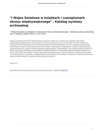 Archiwum Panstwowe w Siedlcach "I Wojna Światowa w książkach i czasopismach okresu międzywojennego" , Katalog wystawy archiwalnej "I Wojna Światowa w książkach i czasopismach okresu międzywojennego" , Katalog wystawy archiwalnej, opr. A. Rogalski, Siedlce 2014, ss. 112, 154 il. Katalog wystawowy Archiwum Państwowego w Siedlcach składa się ze wstępu oraz katalogu właściwego zawierającego komplet plansz wystawowych. Ten ostatni podzielony jest na cztery bloki. Pierwszy to plansze z ilustracjami Kamilia Mackiewicza do książki Bronisławy Ostrowskiej Bohaterski miś czyli przygody bohaterskiego niedźwiadka na wojnie. Część druga to wizerunki afiszów, rozporządzeń i obwieszczeń z czasów I wojny światowej przedrukowanych za „Gazetą urzędową powiatów węgrowskiego i sokołowskiego” oraz książką Pamiątki wojenne. W skład trzeciej części Katalogu weszły podobizny okładek zebranych z archiwalnej biblioteki publikacji wydanych w latach 1914-1918, oraz książek z okresu międzywojennego dotyczących I Wojny Światowej. Katalog zamyka wybór „pierwszowojennych” artykułów z międzywojennej prasy wojskowej. W publikacji znalazły się materiały pochodzące z zasobu bibliotecznego AP w Siedlcach oraz zbiorów prywatnych. CENA 15 zł Zamówienia można dokonać poprzez formularz kontaktowy w zakładce KONTAKT 1