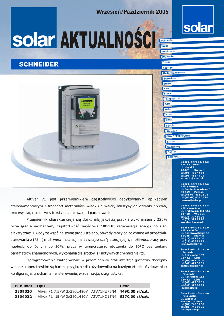 Wrzesień/Październik 2005 AKTUALNOŚCI Schneider Jacob Weidmuller Ingremio Thorn SCHNEIDER nf ss Dao HellermannTyton Schneider Ensto Arot Fibox PhilipsaF rel ABB Bals Fluke Rittal Bosch Siemens OBO BETTERMANN Eltcrac Spelsberg Roblon Solar Plus Solar Elektro Sp. z o.o. - Filia Szczecin ul. Heyki 3 70-631 Szczecin tel.(91) 485 44 00 tel.(91) 485 44 01 [email protected] Altivar 71 jest przemiennikiem częstotliwości dedykowanym aplikacjom stałomomentowym : transport materiałów, windy i suwnice, maszyny do obróbki drewna, procesy ciągłe, maszyny tekstylne, pakowanie i paczkowanie. Przemiennik charakteryzuje się doskonałą jakością pracy i wykonaniem : 220% przeciążenie momentem, częstotliwość wyjściowa 1000Hz, regeneracja energii do sieci elektrycznej, układy ze wspólną szyną prądu stałego, obwody mocy odizolowane od przedziału sterowania z IP54 ( możliwość instalacji na zewnątrz szafy sterującej ), możliwość pracy przy napięciu obniżonym do 50%, praca w temperaturze otoczenia do 50°C bez zmiany parametrów znamionowych, wykonania dla środowisk aktywnych chemicznie itd. Oprogramowanie zintegrowane w przemienniku oraz interfejs graficzny dostępny w panelu operatorskim są bardzo przyjazne dla użytkownika na każdym etapie użytkowania : konfiguracja, uruchamianie, sterowanie, wizualizacja, diagnostyka. El-numer Opis 3809020 Alivar 71 7.5kW 3x380..480V ATV71HU75N4 4490,00 zł/szt. Cena 3809022 Alivar 71 15kW 3x380..480V ATV71HD15N4 6370,00 zł/szt. Solar Elektro Sp. z o.o. - Filia Poznań ul. Smoluchowskiego 7 60-179 Poznań tel.(48 61) 863 02 04 tel.(48 61) 863 02 70 [email protected] Solar Elektro Sp. z o.o. - Filia Wrocław ul. Krakowska 141-155 50-428 Wrocław tel.(71) 377 19 00 tel.(71) 377 19 16 [email protected] Solar Elektro Sp. z o.o. - Filia Kraków ul. Radzikowskiego 35 31-315 Kraków tel.(12) 638 91 00 tel.(12) 638 91 22 [email protected] Solar Elektro Sp. z o.o. - Centrala ul. Rokicińska 162 92-412 Łódz tel.(42) 677 58 00 tel.(42) 677 58 01 [email protected] Solar Elektro Sp. z o.o. - Filia Łódz ul. Rokicińska 162 92-412 Łódz tel.(42) 677 58 31 tel.(42) 677 58 30 [email protected] Solar Elektro Sp. z o.o. - Filia Lublin ul. Witosa 3 20-330 Lublin tel.(81) 745 59 00 tel.(81) 745 59 05 [email protected] JACOB - dławnice kablowe i akcesoria Dławnice kablowe CONUS Szeroki zakres uszczelniania, zastosowanie w instalacjach bez szczególnych wymagań. Śruba dociskowa: poliamid PA6 GF30 Pierścień dociskowy: polietylen PE-LD Pierścień uszczelniający SBR/NBR z możliwością wycinania Króciec pośredni: poliamid PA6 GF30 Stopień ochrony: IP55 Zakres pracy: -30 do + 800C El-numer Opis 1504114 Dławnica M 16 x 1.5 do kabla 8-10mm 6309M16PA szara Cena 93,00 zł/100szt. 1504115 Dławnica M 20 x 1.5 do kabla 10-12mm 6313M20PA szara 126,00 zł/100szt. 1504116 Dławnica M 20 x 1.5 do kabla 12-14mm 6316M20PA szara 140,00 zł/100szt. 1504118 Dławnica M 25 x 1.5 do kabla 15-17mm 6321M25PA szara 170,00 zł/100szt. 1504119 Dławnica M 32 x 1.5 do kabla 24-26mm 6329M32PA szara 356,00 zł/100szt. Dławnice kablowe PERFECT Zintegrowane zabezpieczenie przed wyrywaniem, duży zakres uszczelniania i zaciskania, łatwa w montażu Nakrętka kołpakowa: poliamid PA6 V-2 Pierścień uszczelniający: kauczuk polichloroprenowo-nitrylowy CR/NBR Króciec pośredni: poliamid PA6 V-2 Stopień ochrony: IP 68, 5 bar (30 min ) Zakres pracy: -20 do + 1000C El-numer 2 Opis Cena 1504122 Dławnica M 12 x 1.5 do kabla 3-6mm 50.612PA7035 szara 100,00 zł/100szt. 1504123 Dławnica M 16 x 1.5 do kabla 5-10mm 50.616PA7035 szara 105,00 zł/100szt. 1504124 Dławnica M 20 x 1.5 do kabla 8-13mm 50.620PA7035 szara 130,00 zł/100szt. 1504125 Dławnica M 25 x 1.5 do kabla 11-17mm 50.625PA7035 szara 175,00 zł/100szt. 1504126 Dławnica M 32 x 1.5 do kabla 15-21mm 50.632PA70 szara 295,00 zł/100szt. Podane ceny netto! Oferta do wyczerpania zapasów. JACOB Nakrętki sześciokątne do niezawodnego mocowania dławic kablowych El-numer Opis Cena 1504135 Nakrętka M 16 x 1.5 szara 50.216PA7035 26,00 zł/100szt. 1504136 Nakrętka M 20 x 1.5 szara 50.220PA7035 30,00 zł/100szt. 1504137 Nakrętka M 25 x 1.5 szara 50.225PA7035 34,00 zł/100szt. 1504138 Nakrętka M 32 x 1.5 szara 50.232PA7035 102,00 zł/100szt. Dławnice kablowe PERFECT mosiężne Dodatkowe zabezpieczenie przed wyrywaniem i przekręceniem, duży zakres uszczelniania i zaciskania, łatwa w montażu - Nakrętka kołpakowa: mosiądz CuZn39Pb3, niklowany galwanicznie - Wkładka płytkowa: poliamid PA6 V-2 - Pierścień uszczelniający: kauczuk polichloroprenowo-nitrylowy CR/NBR - Króciec pośredni: mosiądz CuZn39Pb3, niklowany galwanicznie - O-ring: kauczuk nitrylowy NBR - Stopień ochrony: IP 68, 5 bar (30 min ) - Zakres pracy: -20 do + 100st.C El-numer Opis 5101100 Dławnica M 12 x 1.5 do kabla 3-6mm 50.612 M 400,00 zł/100szt. Cena 5101102 Dławnica M 16 x 1.5 do kabla 5-9mm 50.616 M 413,00 zł/100szt. 50.620 M 5101104 Dławnica M 20 x 1.5 do kabla 9-13mm 5101106 Dławnica M 25 x 1.5 do kabla 11-16mm 50.625 M 800,00 zł/100szt. 510,00 zł/100szt. 5101108 Dławnica M 32 x 1.5 do kabla 14-21mm 50.632 M 1 155,00 zł/100szt. Jeśli jesteś zainteresowany szerszą ofertą dławnic kablowych zamów katalog firmy JACOB "Przegląd produktów" Kontakt : [email protected] Podane ceny netto! Oferta do wyczerpania zapasów. 3 Weidmuller D-strip Eurozłączki 12 biegunowe listwy złączkowe dla przewodów o przekroju do 25mm Materiał izolacyjny poliamid lub polietylen Niewypadające śruby Liczne dopuszczenia międzynarodowe El-numer Opis Cena 1504301 2.5-4/12 bieg natural eurozłączka poliamidowa 2,28 zł/szt. 1504303 2.5-4/12 bieg czarna eurozłączka polietylenowa 1,83 zł/szt. 1504305 2.5-4/12 bieg biała eurozłączka polietylenowa 1,83 zł/szt. 1504307 4-6/12 bieg czarna eurozłączka polietylenowa 2,94 zł/szt. 1504309 4-6/12 bieg biała eurozłączka polietylenowa 2,94 zł/szt. 1504311 6-10/12 bieg czarna eurozłączka polie