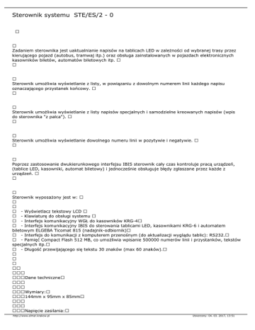 Sterownik systemu STE/ES/2 - 0 Zadaniem sterownika jest uaktualnianie napisów na tablicach LED w zależności od wybranej trasy przez kierującego pojazd (autobus, tramwaj itp.) oraz obsługa zainstalowanych w pojazdach elektronicznych kasowników biletów, automatów biletowych itp. Sterownik umożliwia wyświetlanie z listy, w powiązaniu z dowolnym numerem linii każdego napisu oznaczającego przystanek końcowy. Sterownik umożliwia wyświetlanie z listy napisów specjalnych i samodzielne kreowanych napisów (wpis do sterownika "z palca"). Sterownik umożliwia wyświetlanie dowolnego numeru linii w pozytywie i negatywie. Poprzez zastosowanie dwukierunkowego interfejsu IBIS sterownik cały czas kontroluje pracą urządzeń, (tablice LED, kasowniki, automat biletowy) i jednocześnie obsługuje błędy zgłaszane przez każde z urządzeń. Sterownik wyposażony jest w: - Wyświetlacz tekstowy LCD - Klawiaturę do obsługi systemu - Interfejs komunikacyjny WGŁ do kasowników KRG-4 - Interfejs komunikacyjny IBIS do sterowania tablicami LED, kasownikami KRG-6 i automatem biletowym ELGEBA Ticomat 815 (nadajnik-odbiornik) - Interfejs do komunikacji z komputerem przenośnym (do aktualizacji wyglądu tablic): RS232. - Pamięć Compact Flash 512 MB, co umożliwia wpisanie 500000 numerów linii i przystanków, tekstów specjalnych itp. - Długość przewijającego się tekstu 30 znaków (max 60 znaków). Dane techniczne Wymiary: 144mm x 95mm x 85mm Napięcie zasilania: http://www.elmar.krakow.pl Utworzony: 04. 03. 2017, 13:51 12-36V Zakres temperatury pracy: -30ºC do +70ºC Masz pytanie? Napisz lub zadzwoń. http://www.elmar.krakow.pl Utworzony: 04. 03. 2017, 13:51