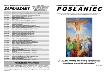 Polska Misja Katolicka Mannheim Luty 2016 ZAPRASZAMY Kościół – St. Matthäus-Spitalkirche E 6; Sala: D 6,9-11; Biuro: A 4,1 68159 Mannheim; Tel.: 0621-247 15; Fax: 0621- 12 86 862; E-Mail: [email protected] Internet: www.pmk-mannheim.eu 01.02.2016 02.02.2016 02.02.2016 03.02.2016 04.02.2016 05.02.2016 05.02.2016 10.02.2016 Wielki Post Wielki Post 13.02.2016 14.02.2016 15.02.2016 19.02.2016 20.02.2016 21.02.2016 22.02.2016 26.02.2016 27.02.2016 27.02.2016 29.02.2016 Spotkanie dla rodziców dzieci przygotowujących się do Pierwszej Spowiedzi i Komunii Świętej Miejsce: Sala Polskiej Misji Katolickiej (D 6,9-11); Czas: Grupa I - 17.00, Grupa II – 18.00 Święto Ofiarowania Pańskiego. Msza św. błogosławieństwem świec Miejsce: St.Matthäus-Spitakirche (E 6); Czas: 18.30 Rozbieranie choinek i żłóbka Miejsce: St.Matthäus-Spitakirche (E 6); Czas: 19.30 Spotkanie 50+ Miejsce: Sala Polskiej Misji Katolickiej (D 6, 9-11); Czas: 15.45 Pierwszy czwartek miesiąca – Msza święta i adoracja. Miejsce: St.Matthäus-Spitakirche (E 6); Czas: 18.30 Spotkanie Dzieci Bożych. Miejsce: Sala Polskiej Misji Katolickiej (D 6,9-11); Czas: 17.00 Pierwszy piątek miesiąca. Msza św. z Litanią do Serca Pana Jezusa. Miejsce: St.Matthäus-Spitakirche (E 6); Czas: 18.30 Środa Popielcowa. Msza święta z posypaniem głów popiołem. Miejsce: St.Matthäus-Spitakirche (E 6); Czas: 18.30 W piątki po Mszy świętej nabożeństwo Drogi Krzyżowej. Miejsce: St.Matthäus-Spitakirche (E 6); Czas: ok. 19.00 W soboty po Mszy świętej nabożeństwo Gorzkich Żali Miejsce: St.Matthäus-Spitakirche (E 6); Czas: ok. 19.15 Spotkanie lektorów i ministrantów Miejsce: St.Matthäus-Spitakirche (E 6); Czas: ok. 16.30 Wykład: Porozumienie bez przemocy. Miejsce: Sala Polskiej Misji Katolickiej (D 6, 9-11); Czas: 16.00 Katecheza przedmałżeńska. Spotkanie pierwsze. Miejsce: Sala Polskiej Misji Katolickiej (D 6, 9-11); Czas: 20.00 Wieczór Uwielbienia i Modlitwy. Msza święta i Droga Krzyżowa. Miejsce: St.Matthäus-Spitakirche (E 6); Czas: 18.30 Dyskusyjny Klub Filmowy. Film: Chce się żyć. Miejsce: Sala Polskiej Misji Katolickiej (D 6,9-11); Czas: 20.15 Świadectwo AA. Miejsce: St.Matthäus-Spitakirche (E 6); Czas: Po Mszach św. o 9.30 i 12.00 Katecheza przedmałżeńska. Miejsce: Sala Polskiej Misji Katolickiej (D 6, 9-11); Czas: 20.00 Krąg Biblijny Miejsce: Sala Polskiej Misji Katolickiej (D 6, 9-11); Czas: 20.00 Otwarty Meeting AA. Miejsce: Sala Polskiej Misji Katolickiej (D 6, 9-11); Czas: 16.00 Adoracja eucharystyczna w ciszy i okazja do spowiedzi świętej Miejsce: St.Matthäus-Spitakirche (E 6); Czas: 17.30 Katecheza przedmałżeńska. Miejsce: Sala Polskiej Misji Katolickiej (D 6, 9-11); Czas: 20.00 REKOLEKCJE PARAFIALNE Rekolekcje parafialne w Polskiej Misji Katolickiej w Mannheim będą w tym roku połączone z peregrynacją obrazu Chrystusa Miłosiernego. Rozpoczną się one w piątek: 18 marca (piątek przed Niedzielą Palmową) i będą trwały do środy: 23 marca (Wielka Środa). Program rekolekcji i inne informacje zostaną podane w kolejnym Posłańcu. Do wzięcia udziału w rekolekcjach już dzisiaj zapraszamy! Polska Misja Katolicka Mannheim Luty 2016 POSŁANIEC Kościół – St. Matthäus-Spitalkirche E 6; Sala: D 6, 9-11; Biuro: A 4, 1; 68159 Mannheim; Tel.: 0621-247 15; Fax: 0621- 12 86 862; E-Mail: [email protected] Internet: www.pmk-mannheim.eu „A Ja, gdy zostanę nad ziemię wywyższony, przyciągnę wszystkich do siebie.” J 12,32 PORZĄDEK NABOŻEŃSTW DROGA KRZYŻOWA Mannheim, Spitalkirche-St.Matthäus E 6 Msze św. w języku polskim: Środa Piątek Pierwszy czwartek miesiąca godz. 18.30 godz. 9.30 godz. 12.00 godz. 18.30 godz. 18.30 godz. 18.30 Adoracja Eucharystyczna: Ostatnia sobota miesiąca Pierwszy czwartek miesiąca godz. 17.30 godz. 19.00 Okazja do spowiedzi świętej: Środa, piątek i sobota Ostatnia sobota miesiąca Pierwszy czwartek miesiąca Pierwszy piątek miesiąca godz. 18.00 godz. 17.30 godz. 18.00 godz. 17.30 Sobota Niedziela Brühl-Rohrhof, St. Michael, Kaiserstr. 4. Msza św. w języku polskim: Trzecia niedziela miesiąca godz. 16.00 Heidelberg, St. Anna, Plöck 4. Msza św. w języku polskim: Czwarta niedziela miesiąca godz. 16.00 OKRES WIELKIEGO POSTU Wielki Post jest w Kościele czasem szczególnym. Poprzedza on i przygotowuje świętowanie Paschy. Ma to być czas zatrzymania i refleksji; czas słuchania słowa Bożego i nawrócenia. Wielki Post to także czas pojednania z Bogiem i braćmi. To czas, gdy specjalnego znaczenia nabierają uczynki postne: modlitwa, post i jałmużna. Wielki Post trwa od Środy Popielcowej do Mszy Świętej Wieczerzy Pańskiej w Wielki Czwartek. Pierwsza część Wielkiego Postu ma wymiar chrzcielny. To przygotowanie do chrztu i świętowanie jego pamiątki. Druga część – począwszy od Piątej Niedzieli Wielkiego Postu – poświęcona jest tematyce Męki Pańskiej. Szósta Niedziela Wielkiego Postu nazywana jest Niedzielą Palmową, czyli Męki Pańskiej i rozpoczyna się nią Wielki Tydzień. Pokutny charakter Okresu Wielkiego Postu podkreśla fioletowy kolor szat liturgicznych, a także brak śpiewu „Chwała” i „Alleluja”. W czasie Wielkiego Postu nie ozdabia się ołtarza kwiatami. Do specjalnych nabożeństw wielkopostnych należą Droga Krzyżowa i Gorzkie Żale. Zazwyczaj w czasie Wielkiego Postu urządza się rekolekcje parafialne. Po Okresie Wielkiego Postu następuje najkrótszy okres roku liturgicznego – Święte Triduum Paschalne Męki i Zmartwychwstania Pańskiego. ŚRODA POPIELCOWA W Środę Popielcową rozpoczniemy Okres Wielkiego Postu. Na znak podjęcia pokuty i umartwienia dokonywany jest w ten dzień obrzęd posypania głów popiołem. W Środę Popielcową obowiązuje post ścisły i abstynencja. Według prawa kanonicznego post ścisły to 3 posiłki dziennie (według tradycji polskiej: 2 razy lekko, raz do syta); obowiązuje on osoby pomiędzy 18 i 60 rokiem życia; Abstynencja to powst