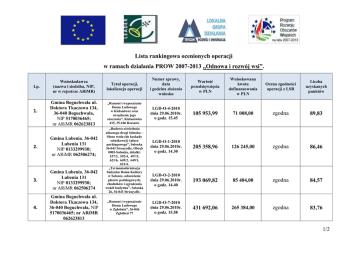 Lista rankingowa ocenionych operacji w ramach działania PROW 2007-2013 „Odnowa i rozwój wsi”. Lp. Wnioskodawca (nazwa i siedziba, NIP, nr w rejestrze ARiMR) Tytuł operacji, lokalizacja operacji Numer sprawy, data i godzina złożenia wniosku Wartość przedsięwzięcia w PLN Wnioskowana kwota dofinansowania w PLN Ocena zgodności operacji z LSR Liczba uzyskanych punktów 1. Gmina Boguchwała ul. Doktora Tkaczowa 134, 36-040 Boguchwała, NIP 5170036465; nr ARiMR 062623813 „Remont i wyposażenie Domu Ludowego w Kielanówce oraz urządzenie jego otoczenia”, Kielanówka 415, 35-106 Rzeszów LGD-O-4-2010 dnia 29.06.2010r. o godz. 15.45 105 953,99 71 008,00 zgodna 89,83 LGD-O-1-2010 dnia 29.06.2010r. o godz. 14.30 205 358,96 126 245,00 zgodna 86,46 LGD-O-2-2010 dnia 29.06.2010r. o godz. 14.40 193 069,82 85 404,00 zgodna 84,57 LGD-O-7-2010 dnia 29.06.2010r. o godz. 15.58 431 692,06 265 384,00 zgodna 83,76 2. Gmina Lubenia, 36-042 Lubenia 131 NIP 8133299930; nr ARiMR 062506274; 3. Gmina Lubenia, 36-042 Lubenia 131 NIP 8133299930; nr ARiMR 062506274 4. Gmina Boguchwała ul. Doktora Tkaczowa 134, 36-040 Boguchwała, NIP 5170036465; nr ARiMR 062623813 „Budowa oświetlenia ulicznego drogi Sołonka – Słona woda (do kaskady solankowej) i placu parkingowego”, Sołonka 36-043 Straszydle, Obręb 0003-Sołonka, działki: 537/3, 592/4, 497/5, 621/6, 649/2, 649/1, 621/4. „Termomodernizacja budynku Domu Kultury w Sołonce, odnowienie placów parkingowych, chodników i ogrodzenia wokół budynku”, Sołonka 26, 36-043 Straszydle. „Remont i wyposażenie Domu Ludowego w Zgłobniu”, 36-046 Zgłobień 77 1/2 5. 6. 7. Gmina Boguchwała ul. Doktora Tkaczowa 134, 36-040 Boguchwała, NIP 5170036465; nr ARiMR 062623813 Gmina Boguchwała ul. Doktora Tkaczowa 134, 36-040 Boguchwała, NIP 5170036465; nr ARiMR 062623813 Gmina Świlcza, 36-072 Świlcza 168, NIP 5170045613; nr ARiMR 063209804. „Remont i wyposażenie Domu Ludowego w Nosówce”, Nosówka 129, 36-046 Zgłobień LGD-O-6-2010 dnia 29.06.2010r. o godz. 15.55 375 427,67 230 823,00 zgodna 79,21 „Organizacja centrum wsi oraz remont i wyposażenie Domu Ludowego w Zarzeczu”, 36-041 Zarzecze 128 LGD-O-5-2010 dnia 29.06.2010r. o godz. 15.50 349 404,04 214 797,00 zgodna 75,22 „Poprawa infrastruktury kulturalnej w Świlczy poprzez modernizację budynku Domu Strażaka – II etap”, 36-072 Świlcza, Obręb Świlcza, działki: 3692, 3691, 4023, 4025/1. LGD-O-3-2010 dnia 29.06.2010r. o godz. 15.00 1 670 925,93 500 000,00 zgodna 58,85 Łączna wartość wnioskowanych dotacji 1 493 661,00 PLN Całkowita kwota środków przewidzianych w LSR na dofinansowanie operacji w tym naborze wynosi 1 500 000,00 PLN …………………………… (data, podpis) 2/2