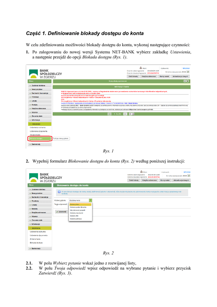 Część 1. Definiowanie blokady dostępu do konta W celu zdefiniowania możliwości blokady dostępu do konta, wykonaj następujące czynności: 1. Po zalogowaniu do nowej wersji Systemu NET-BANK wybierz zakładkę Ustawienia, a następnie przejdź do opcji Blokada dostępu (Rys. 1). Rys. 1 2. Wypełnij formularz Blokowanie dostępu do konta (Rys. 2) według poniższej instrukcji: Rys. 2 2.1. 2.2. W polu Wybierz pytanie wskaż jedno z rozwijanej listy, W polu Twoja odpowiedź wpisz odpowiedź na wybrane pytanie i wybierz przycisk Zatwierdź (Rys. 3). Rys. 3 2.3. 2.4. Wprowadź kod PIN (w przypadku korzystania z klucza) lub kod SMS. Po poprawnym wykonaniu powyższych czynności otrzymasz informację, że blokada dostępu do konta jest aktywna (Rys. 4). Rys. 4 Część 2. Blokowanie dostępu do konta W celu zablokowania dostępu do konta wykonaj następujące czynności: 1. W formularzu logowania do nowej wersji Systemu NET-BANK (Rys.1) wybierz opcję Zablokuj dostęp do konta. Rys. 1 2. Wypełnij formularz Blokowanie dostępu do konta (Rys. 2) według poniższej instrukcji: 2.1. 2.2. Rys. 2 Podaj swój identyfikator lub wybierz opcję Nie pamiętam, a następnie wprowadź swoje imię i nazwisko i wybierz przycisk Dalej. Z rozwijanej listy wybierz pytanie, zdefiniowane przez siebie w Systemie NET-BANK w celu blokowania dostępu do konta, udziel na nie odpowiedzi i wybierz przycisk Dalej (Rys. 3) Rys. 3 Uwaga: Jeżeli nie pamiętasz lub nie zdefiniowałeś w Systemie NET-BANK pytania i odpowiedzi niezbędnych do zablokowania konta (Część I niniejszej Instrukcji) skontaktuj się z Bankiem tel. 42 716 66 00, e-mail [email protected]. 2.3. 2.4. Zaznacz dysponenta, dla którego ma zostać zablokowany dostęp do konta i wybierz przycisk Dalej (Rys. 4) Rys. 4 Po poprawnym wykonaniu powyższych czynności otrzymasz informację, że dostęp do konta został zablokowany (Rys. 5). Uwaga: W celu odblokowania dostępu do konta skontaktuj się z Bankiem tel 42 716 66 00, e-mail [email protected]