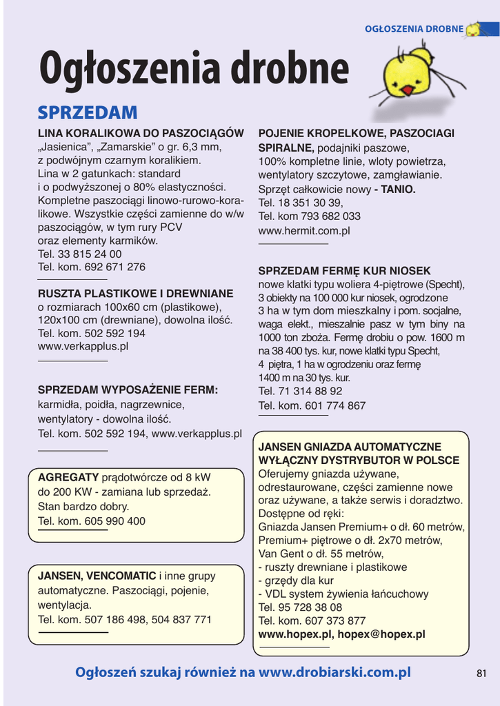 OGŁOSZENIA DROBNE Ogłoszenia drobne SPRZEDAM LINA KORALIKOWA DO PASZOCIĄGÓW „Jasienica”, „Zamarskie” o gr. 6,3 mm, z podwójnym czarnym koralikiem. Lina w 2 gatunkach: standard i o podwyższonej o 80% elastyczności. Kompletne paszociągi linowo-rurowo-koralikowe. Wszystkie części zamienne do w/w paszociągów, w tym rury PCV oraz elementy karmików. Tel. 33 815 24 00 Tel. kom. 692 671 276 RUSZTA PLASTIKOWE I DREWNIANE o rozmiarach 100x60 cm (plastikowe), 120x100 cm (drewniane), dowolna ilość. Tel. kom. 502 592 194 www.verkapplus.pl SPRZEDAM WYPOSAŻENIE FERM: karmidła, poidła, nagrzewnice, wentylatory - dowolna ilość. Tel. kom. 502 592 194, www.verkapplus.pl AGREGATY prądotwórcze od 8 kW do 200 KW - zamiana lub sprzedaż. Stan bardzo dobry. Tel. kom. 605 990 400 JANSEN, VENCOMATIC i inne grupy automatyczne. Paszociągi, pojenie, wentylacja. Tel. kom. 507 186 498, 504 837 771 POJENIE KROPELKOWE, PASZOCIAGI SPIRALNE, podajniki paszowe, 100% kompletne linie, wloty powietrza, wentylatory szczytowe, zamgławianie. Sprzęt całkowicie nowy - TANIO. Tel. 18 351 30 39, Tel. kom 793 682 033 www.hermit.com.pl SPRZEDAM FERMĘ KUR NIOSEK nowe klatki typu woliera 4-piętrowe (Specht), 3 obiekty na 100 000 kur niosek, ogrodzone 3 ha w tym dom mieszkalny i pom. socjalne, waga elekt., mieszalnie pasz w tym biny na 1000 ton zboża. Fermę drobiu o pow. 1600 m na 38 400 tys. kur, nowe klatki typu Specht, 4 piętra, 1 ha w ogrodzeniu oraz fermę 1400 m na 30 tys. kur. Tel. 71 314 88 92 Tel. kom. 601 774 867 JANSEN GNIAZDA AUTOMATYCZNE WYŁĄCZNY DYSTRYBUTOR W POLSCE Oferujemy gniazda używane, odrestaurowane, części zamienne nowe oraz używane, a także serwis i doradztwo. Dostępne od ręki: Gniazda Jansen Premium+ o dł. 60 metrów, Premium+ piętrowe o dł. 2x70 metrów, Van Gent o dł. 55 metrów, - ruszty drewniane i plastikowe - grzędy dla kur - VDL system żywienia łańcuchowy Tel. 95 728 38 08 Tel. kom. 607 373 877 www.hopex.pl, [email protected] Ogłoszeń szukaj również na www.drobiarski.com.pl 81 OGŁOSZENIA DROBNE SPRZEDAM AGREGATY prądotwórcze od 10 kVA do 2500 kVA - dobór agregatu w obiekcie inwestora - dostawy własnym transporetem - montaż - serwis gwarancyjny i pogwarancyjny Tel. 52 351 62 45 Tel. kom. 601 639 554 www.janaszkiewicz.eu ŁUSKARKI lodu „MAJA” i „HIGEL” od 100 do 6000 kg/dobę. Nowe i używane z gwarancją. Remonty maszyn. Najniższe ceny w kraju. Tel. kom. 602 283 252, Tel./fax. 33 815 61 35, e-mail: [email protected] BATERIE HELMANN - MAŁE GRUPY 2010 r. - stan idealny. ODCHOWALNIA KLATKOWA Big Dutchman - super stan Tel. kom. 507 186 237 AGOS SILOSY PASZOWE / ZBOŻOWE 5-140 t największy producent silosów Dozownik ziarna 5% - 50% - montowany pod koszem paszociągu lub z zasobnikiem 1200 kg. www.silosypaszowe.pl Tel/fax. 95 741 16 27 82 AGREGATY PRĄDOTWÓRCZE od 20 KW do 1000 KW, nowe i używane z gwarancją i dowozem na miejsce, naprawy główne i bieżące. Tel. kom. 605 209 828 www.agregaty-pradotworcze-kruszwica.pl WYDZIERŻAWIĘ KURNIK 1200 m z przybudówką mieszkalną 65 m, Mieszalnia pasz. 30 km od Wrocławia w Złotowie. Tel. kom. 504 187 131 SORTOWNICE DO JAJ - naprawy bieżące, remonty kapitalne sortownic do jaj - skup, sprzedaż sortownic do jaj Tomax S.c. Tel. kom. 603 533 506, 603 533 502 www.sortownice.cba.pl SPRZEDAM PIEC DO UTYLIZACJI ODPADÓW ORGANICZNYCH MB 750 firmy Masterburn - testowy wraz z odzyskiem ciepła. Rabat 20 % od ceny nowego urządzenia. Pełna roczna gwarancja. Pomagamy w uzyskaniu zezwoleń. Specyfikacja na www.masterburn.pl Tel. kom. 662 659 916, 600 832 077 Ogłoszeń szukaj również na www.drobiarski.com.pl OGŁOSZENIA DROBNE SPRZEDAM SPRZEDAM KURKI ODCHOWANE RASY NOVOGEN (holenderskie pisklę) 140.000 szt, wstawienie 30.09.2014 r., przewidywany termin sprzedaży styczeń 2015r. Odchów klatkowy, pełna profilaktyka weterynaryjna. Tel. kom. 602 596 455 Tel. stacjonarny (61) 281 2181 woj. wielkopolskie SPRZEDAM UŻYWANE KWOKI GAZOWE FIRMY INFRACONIC HP-5000. Tel. kom. 509 622 660 SPRZEDAM GNIAZDA AUTOMATYCZNE firmy Jansen, dł. od 65 do 100 m wraz z pozostałym wyposażeniem, stan techniczny bardzo dobry. Tel. kom. 502 592 194 www.verkapplus.pl KARCHER - NOWE I UŻYWANE MYJKI CIŚNIENIOWE. Gwarancja, serwis, osprzęt. TRAKTOROWE AGREGATY PRĄDOTWÓRCZE WOM 16-110 kVa. Największy wybór w Polsce. ROZDRABNIACZE, SIECZKARNIE, ŚCIELARKI DO SŁOMY TAGLE, KIDD. Milicz, Tel. kom. 606 211 056, 507 158 699 SORTOWNICE Sprzedaż - Skup Wydajność od 1600 szt./h do 50.000 szt./h, możliwość wraz z drukarką. Naprawy, remonty kapitalne - wszystkie typy. Tel./fax. 61 286 38 38 Tel. kom. 603 930 803 www.sortownicejuszczak.pl SPRZEDAM KURKI ODCHOWANE, towarowe i ogólnoużytkowe w różnym wieku. Tel. kom. 605 834 710 JAJA KURZE SKUP-SPRZEDAŻ Zakład Pakowania Jaj „KURAK”, Bieżuń, woj. mazowieckie. Tel./fax 23 68 41 718 Tel. kom. 606 334 400 SPRZEDAM DRUKARKĘ DO ZNAKOWANIA JAJ Nuovo AG Egg-Jet SOR6. Data produkcji: 2004 r. Drukarka sprawna, 6 kartridżów na 6 rzędów, 9 możliwych napisów do wyboru. Cena do uzgodnienia. Tel. kom. 509 039 479 Ogłoszeń szukaj również na www.drobiarski.com.pl 83 OGŁOSZENIA DROBNE SPRZEDAM SPRZEDAM KURKI OGÓLNOUŻYTKOWE rasy Rosa oraz koguty hodowlane. Tel. kom. 608 691 771 SPRZEDAM KURKI NIOSKI Lohmann Brown oraz Messa - 30 tys. sztuk. Data wstawienia piskląt 03.07.2014 i 15.07.2014. Pełen program szczepień. Możliwy transport. Tel. kom. 532 186 867 ODCHOWAM KURY NIOSKI w ilości 30 tys. sztuk, odchów klatkowy, pełna profilaktyka weterynaryjna, Tel. kom. 601 934 459 SPRZEDAM KURKI Lohmann, Novogen oraz kolorowe Rosa 100 tys. szt., wstawione, 15.05.2014, 29.05.2014, 06.06.2014, 15.06.2014 transport. Tel. kom. 531 658 989 SUPER ALARM FERMOWY powiadomi telefonicznie oraz SMS o braku prądu i przekroczeniu progów min/max temperatury. www.hot-dom.pl/alarm.php Obniżamy koszty energii na fermach! Zadzwoń lub wyślij sms - oddzwonimy. Tel. kom. 608 370 766 84