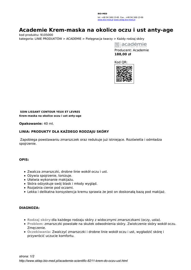 BIO-MED tel. +48 94 348-13-65 Fax.. +48 94 348-13-66 www.bio-med.pl www.sklep.bio-med.pl Academie Krem-maska na okolice oczu i ust anty-age kod produktu: 9105000 kategoria: LINIE PRODUKTÓW > ACADEMIE > Pielęgnacja twarzy > Każdy rodzaj skóry Producent: Academie 188,00 zł Kod QR: SOIN LISSANT CONTOUR YEUX ET LEVRES Krem-maska na okolice oczu i ust anty-age Opakowanie: 40 ml. LINIA: PRODUKTY DLA KAŻDEGO RODZAJU SKÓRY Zapobiega powstawaniu zmarszczek oraz redukuje już istniejące. Rozświetla i odmładza spojrzenie. OPIS: Zwalcza zmarszczki, drobne linie wokół oczu i ust. Ożywia spojrzenie, tonizuje. Ułatwia wykonanie makijażu. Skóra odzyskuje swój blask i młody wygląd. Rozjaśnia cienie pod oczami. Lekka i delikatna konsystencja kremu sprawia że jest on doskonałą bazą pod makijaż. DIAGNOZA: Rodzaj skóry:dla każdego rodzaju skóry z widocznymi zmarszczkami (oczy, usta). Problem: zmarszczki powstałe na skutek odwodnienia skóry. Zwiotczenie skóry wokół oczu. Zmęczenie. Oczekiwania: Zwalczyć zmarszczki i drobne linie wokół oczu i ust, wygładzić skórę i przywrócić uczucie komfortu. strona: 1/2 http://www.sklep.bio-med.pl/academie-scientific-8211-krem-do-oczu-ust.html ZAWARTOŚĆ SKŁADNIKÓW AKTYWNYCH – 14,1%: Pochodne krzemu: 6% Naturalne składniki tkanki łącznej. Wspomagają funkcjonowanie komórek produkujących włókna odpowiedzialne za architekturę skóry. Poprawiają elastyczność i odporność na rozciąganie skóry. Olej z limnanthes alba (meadowfoam): 6 % Wyciąg z roślin, który tworzy na skórze film ochronny i zapobiega utracie wody. Przywraca równowagę skóry. Aktywator syntezy kolagenu (ASC III): 2% Pobudza zdolność syntetyzowania kolagenu typu III (kolagenu młodej skóry i w fazie regeneracji). Odnawia tkankę łączną. Regeneruje włókna kolagenowe, pobudza metabolizm komórkowy. Ceramidy: 0,1 % Naturalne elementy łączące komórki warstwy rogowej tzw. cement międzykomórkowy, który zwiększa jej spójność. Powierzchnia skóry jest jednolita. Podtrzymany jest naturalny poziom nawilżenia, jednocześnie hamowane przeznaskórkowe parowanie wody. SPOSÓB UŻYCIA: Jako krem: Rano i/lub wieczorem, nałożyć cienką warstwę na okolice oczu i ust. Jako maska: Nałożyć średnią warstwę, pozostawić na 5 - 10 minut, lekko wmasować, a następnie zmyć tonikiem soin tonique. KURACJA UZUPEŁNIAJĄCA: Oczyścić i wysubtelnić: Oczyścić skórę delikatnym mleczkiem: Soin démaquillant i nawilżającym tonikiem: Soin tonique. Ustabilizować : Zastosować produkty uzupełniające w przypadku niedoboru wody. Ukierunkować działanie: - przeciwzmarszczkowe (dla skór z widocznymi oznakami starzenia, żeby skutecznie im zapobiec lub je zmniejszyć): stosować rano i wieczorem Soin total restructurant, - na zmarszczki mimiczne: borelax care line corrector, - przeciw zwiotczeniu: soin lift galbe i/lub soin raffermissant visage et cou. strona: 2/2 http://www.sklep.bio-med.pl/academie-scientific-8211-krem-do-oczu-ust.html