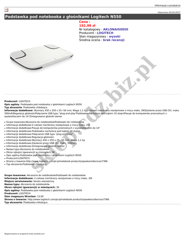 Informacje o produkcie Utworzono 04-03-2017 Podstawka pod notebooka z głośnikami Logitech N550 Cena : 152,99 zł .b iz .p l Nr katalogowy : AKLONAIS0050 Producent : LOGITECH Stan magazynowy : wysoki Średnia ocena : brak recenzji ● ● ● ● ● ● ● ● ● ● ● ● .c ● Grupa towarowa:Akcesoria do notebooków\Podstawki do notebooków Informacje dodatkowe:2-calowe membrany neodymowe o mocy maks. 2W Informacje dodatkowe:Pasuje do komputerów przenośnych z wyświetlaczem do 14" Informacje dodatkowe:Podstawka nachylona pod kątem 10 stopni Informacje dodatkowe:Połączenie USB typu "plug and play" Informacje dodatkowe:Regulacja głośności Informacje dodatkowe:Wymiary 430 x 250 x 25~50 mm; Waga 1,1 kg Informacje dodatkowe:Zasilanie przez USB (5V, maks. 500mA) Informacje dodatkowe:Zintegrowane głośniki stereo Nazwa typu:Akcesoria do notebooków Okres rękojmi (gwarancji) w miesiącach:36 Opis ogólny:Podstawka pod notebooka z głośnikami Logitech N550 Producent:LOGITECH Strona o towarze:http://www.logitech.com/pl-pl/notebook-products/speakers/devices/7366 Typ akcesoria:Podstawka chłodząca le p ● sk ● dz Producent: LOGITECH Opis ogólny: Podstawka pod notebooka z głośnikami Logitech N550 Typ akcesoria: Podstawka chłodząca Informacje dodatkowe: Wymiary 430 x 250 x 25~50 mm; Waga 1,1 kg2-calowe membrany neodymowe o mocy maks. 2WZasilanie przez USB (5V, maks. 500mA)Regulacja głośnościPołączenie USB typu "plug and play"Podstawka nachylona pod kątem 10 stopniPasuje do komputerów przenośnych z wyświetlaczem do 14"Zintegrowane głośniki stereo Grupa towarowa: Akcesoria do notebooków\Podstawki do notebooków Informacje dodatkowe: 2-calowe membrany neodymowe o mocy maks. 2W Miejsce serwisowania: Serwis zewnętrzny Nazwa typu: Akcesoria do notebooków Okres rękojmi (gwarancji) w miesiącach: 36 Opis ogólny: Podstawka pod notebooka z głośnikami Logitech N550 Producent: LOGITECH Stan magazynu Wrocław: 13.00 Strona o towarze: http://www.logitech.com/pl-pl/notebook-products/speakers/devices/7366 Typ akcesoria: Podstawka chłodząca Wygenerowano w programie www.oscGold.com
