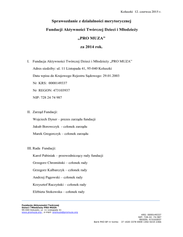 Koluszki 12. czerwca 2015 r. Sprawozdanie z działalności merytorycznej Fundacji Aktywności Twórczej Dzieci i Młodzieży „PRO MUZA” za 2014 rok. I. Fundacja Aktywności Twórczej Dzieci i Młodzieży „PRO MUZA” Adres siedziby: ul. 11 Listopada 41, 95-040 Koluszki Data wpisu do Krajowego Rejestru Sądowego: 29.01.2003 Nr KRS: 0000149337 Nr REGON: 473103937 NIP: 728 24 74 987 II. Zarząd Fundacji: Wojciech Dyner – prezes zarządu fundacji Jakub Borowczyk - członek zarządu Marek Gregorczyk – członek zarządu III. Rada Fundacji: Karol Pabiniak – przewodniczący rady fundacji Grzegorz Chromiński – członek rady Grzegorz Kalbarczyk – członek rady Andrzej Pągowski – członek rady Krzysztof Raczyński – członek rady Elżbieta Stokowska – członek rady _______________________________________________________________________________ Fundacja Aktywności Twórczej Dzieci i Młodzieży PRO MUZA 95-040 Koluszki, ul. 11 Listopada 41 www.promuza.org , e-mail: [email protected] Bank PKO BP nr konta: KRS: 0000149337 NIP: 728-24 -74-987 REGON: 473103937 37 1020 3378 0000 1302 0210 2366 IV. Sprawozdanie z działalności merytorycznej: Fundacja PRO MUZA w 2014 r. kontynuowała działalność pożytku publicznego polegającą na organizowaniu i prowadzeniu zajęć pozaszkolnych związanych z rozwojem własnym dzieci i młodzieży, w tym głównie w zakresie gry na instrumentach muzycznych i organizowaniu koncertów. Nauczanie muzyki było działalnością odpłatną, natomiast koncerty uczniów fundacja organizowała bezpłatnie angażując uczniów i nauczycieli jako wolontariuszy. Nauczanie gry odbywało się w punkcie aktywności twórczej zorganizowanym w Łodzi w Osiedlowym Domu Kultury „ROMUS”, w Ujeździe w Hali Sportowej oraz w Andrzejowie w Szkole Podstawowej nr 204. Ponadto, PRO MUZA zorganizowała placówkę umuzykalniania dzieci i młodzieży w Rogowie i kontynuowała patronat w CUDIM w Koluszkach. Nauką gry organizowaną bezpośrednio w Łodzi, Ujeździe, Andrzejowie i Rogowie objęto ponad 40 uczniów. Na zajęcia umuzykalniające w placówce w Koluszkach pod patronatem fundacji uczęszcza średnio 35 uczniów. Działania, które zostały zrealizowane w roku 2014: 1. 3 stycznia – koncert kolęd w Osiedlowym Domu Kultury „ROMUS” w Łodzi. Uczniowie po raz kolejny samodzielnie zagrali i zaśpiewali kolędy. 2. 27 stycznia – 30 stycznia – zimowe ferie z muzyką. Uczestnicy warsztatów mieli okazję do zapoznania się z instrumentami muzycznymi oraz z metodą nauki gry prowadzoną w CUDIM i Fundacji „PRO MUZA”. 3. 31 stycznia – 2 lutego – Ogólnopolskie Warsztaty Muzyki Rozrywkowej w Koluszkach z udziałem uczestników i instruktorów z całej Polski. 4. 28 lutego – koncert karnawałowy w Gminnym Ośrodku Kultury w Ujeździe. Uczniowie Szkoły Muzycznej „PRO MUZA” zagrali polskie i zagraniczne przeboje. 5. 22 marca – koncert Orkiestry Symfonicznej „Symphonix Ensemble” w Miejskim Ośrodku Kultury w Koluszkach. Koncert odbył się z inicjatywy Prezesa Zarządu Fundacji „PRO MUZA”. 6. 7 kwietnia – III Przegląd Piosenki i Poezji „Zdrowo żyć to szczęśliwym być” zorganizowany w Przedszkolu Miejskim nr 129 w Łodzi, w którym wzięli udział uczniowie Fundacji „PRO MUZA”. 7. 2 maja – 31 grudnia – realizacja projektu „Muzyka łączy pokolenia”. 8. 30 maja – koncert pt. „Dzieci Dzieciom” w Szkole Podstawowej nr 189 w Łodzi. Dla uczniów zagrali młodzi muzycy z Fundacji „PRO MUZA”. _______________________________________________________________________________ Fundacja Aktywności Twórczej Dzieci i Młodzieży PRO MUZA 95-040 Koluszki, ul. 11 Listopada 41 www.promuza.org , e-mail: [email protected] Bank PKO BP nr konta: KRS: 0000149337 NIP: 728-24 -74-987 REGON: 473103937 37 1020 3378 0000 1302 0210 2366 9. 31 maja – koncert z okazji Dnia Rodziny w Szkole Podstawowej nr 204 w Andrzejowie, w którym wystąpili młodzi artyści z Fundacji „PRO MUZA”. 10. 10 czerwca – udział uczniów fundacji i pomoc w organizacji festynu rodzinnego w Przedszkolu Miejskim nr 129 w Łodzi. 11. 18 czerwca – koncert z okazji zakończenia roku szkolnego 2013/2014 w Gminnym Ośrodku Kultury w Niewiadowie. 12. 25 czerwca – koncert z okazji zakończenia roku szkolnego 2013/2014 w Osiedlowym Domu Kultury „ROMUS” w Łodzi. 13. 28 czerwca – koncert w Rogowie z udziałem uczestników projektu „Muzyka łączy pokolenia”. 14. 12 września – występ zespołu seniorów „Muzyka łączy pokolenia” w czasie dni otwartych w CPiK w Brzezinach. 15. 27 września – dni otwarte w Osiedlowym Domu Kultury „ROMUS” w Łodzi. 16. 7 października – występ w Szkole Podstawowej w Woli Rakowej dzieci z punktu aktywności twórczej Fundacji w Ujeździe. 17. 16 października – występ seniorów biorących udział w Projekcie „Muzyka łączy pokolenia” w Europejskim Dniu Seniora w CPiK w Brzezinach. 18. 11 grudnia – koncert Mikołajkowy w Gminnym Ośrodku Kultury w Ujeździe, który był zorganizowany przez Fundację „PRO MUZA” na zakończenie Projektu „Muzyka łączy pokolenia” w wykonaniu jego uczestników. Zarząd Fundacji PRO MUZA: …………………………….. Wojciech Dyner ……………………………. Marek Gregorczyk …………………………… Jakub Borowczyk _______________________________________________________________________________ Fundacja Aktywności Twórczej Dzieci i Młodzieży PRO MUZA 95-040 Koluszki, ul. 11 Listopada 41 www.promuza.org , e-mail: [email protected] Bank PKO BP nr konta: KRS: 0000149337 NIP: 728-24 -74-987 REGON: 473103937 37 1020 3378 0000 1302 0210 2366