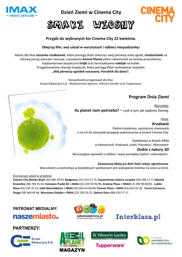 Dzień Ziemi w Cinema City SMAKI WIOSNY Przyjdź do wybranych kin Cinema City 22 kwietnia. Obejrzyj film, weź udział w warsztatach i odbierz niespodziankę! Mamy dla Was nasionka rzodkiewek, które pomogą Wam stworzyć swój pierwszy mały ogród, śniadaniówki na zdrową porcję owoców i warzyw, czasopisma Animal Planet pełne ciekawostek na tematy przyrodnicze, trójwymiarowe bezpieczne linijki oraz termoaktywne naklejki na kubek. Przygotowaliśmy również książeczki, które pomogą Wam wyhodować nowalijki: „Mój pierwszy ogródek warzywny. Poradnik dla dzieci”. Niespodzianki przygotowali dla Was: Grupa Edukacyjna S.A., Wydawnictwo Egmont, Vilmorin Garden oraz Tupperware. Program Dnia Ziemi Warsztaty: Ilu planet nam potrzeba? – czyli o tym jak zjadamy Ziemię. Filmy: Krudowie Piękne krajobrazy, egzotyczne stworzenia a na ich tle niezwykłe przygody jaskiniowców w kinach Cinema City. Dodatkowo w kinach IMAX w Katowicach, Krakowie, Łodzi, Poznaniu i Warszawie: Dzikie z natury 3D Wzruszająca opowieść o miłości i więzi pomiędzy ludźmi i zwierzętami . Zarezerwuj bilety już dziś! Ilość miejsc ograniczona. Warunkiem uczestnictwa w bezpłatnych spotkaniach jest wykupienie biletów na seans w kinie. Kina biorące udział w projekcie: Cinema City Bielsko-Biała (33) 485 39 93, Bydgoszcz (52) 554 37 73, Częstochowa Galeria Jurajska (34) 390 17 71 Gdańsk Krewetka (58) 769 31 02, Katowice Punkt 44 + IMAX (32) 359 59 95/96, Kraków Plaza + IMAX(12) 290 90 80/92, Lublin Plaza (81) 535 25 52, Łódź Manufaktura + IMAX (42) 664 64 46/48, Poznań Plaza + IMAX (61) 662 62 26, Toruń Czerwona Droga (56) 664 64 46, Warszawa Sadyba + IMAX (22) 550 33 22, Zielona Góra (68) 410 77 17.