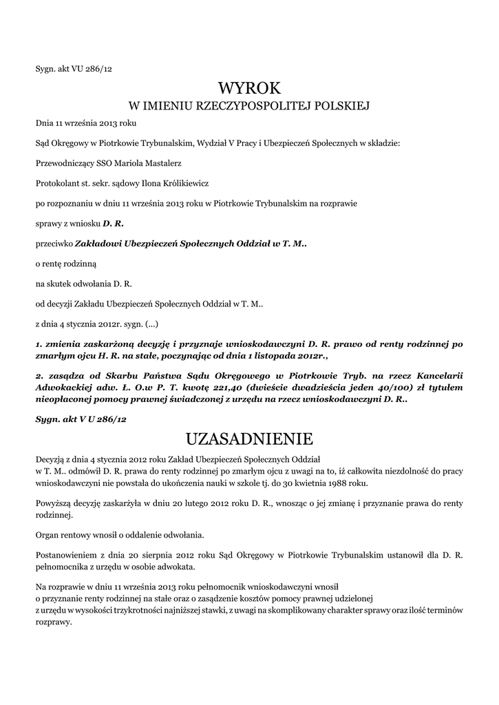 Sygn. akt VU 286/12 WYROK W IMIENIU RZECZYPOSPOLITEJ POLSKIEJ Dnia 11 września 2013 roku Sąd Okręgowy w Piotrkowie Trybunalskim, Wydział V Pracy i Ubezpieczeń Społecznych w składzie: Przewodniczący SSO Mariola Mastalerz Protokolant st. sekr. sądowy Ilona Królikiewicz po rozpoznaniu w dniu 11 września 2013 roku w Piotrkowie Trybunalskim na rozprawie sprawy z wniosku D. R. przeciwko Zakładowi Ubezpieczeń Społecznych Oddział w T. M.. o rentę rodzinną na skutek odwołania D. R. od decyzji Zakładu Ubezpieczeń Społecznych Oddział w T. M.. z dnia 4 stycznia 2012r. sygn. (...) 1. zmienia zaskarżoną decyzję i przyznaje wnioskodawczyni D. R. prawo od renty rodzinnej po zmarłym ojcu H. R. na stałe, poczynając od dnia 1 listopada 2012r., 2. zasądza od Skarbu Państwa Sądu Okręgowego w Piotrkowie Tryb. na rzecz Kancelarii Adwokackiej adw. Ł. O.w P. T. kwotę 221,40 (dwieście dwadzieścia jeden 40/100) zł tytułem nieopłaconej pomocy prawnej świadczonej z urzędu na rzecz wnioskodawczyni D. R.. Sygn. akt V U 286/12 UZASADNIENIE Decyzją z dnia 4 stycznia 2012 roku Zakład Ubezpieczeń Społecznych Oddział w T. M.. odmówił D. R. prawa do renty rodzinnej po zmarłym ojcu z uwagi na to, iż całkowita niezdolność do pracy wnioskodawczyni nie powstała do ukończenia nauki w szkole tj. do 30 kwietnia 1988 roku. Powyższą decyzję zaskarżyła w dniu 20 lutego 2012 roku D. R., wnosząc o jej zmianę i przyznanie prawa do renty rodzinnej. Organ rentowy wnosił o oddalenie odwołania. Postanowieniem z dnia 20 sierpnia 2012 roku Sąd Okręgowy w Piotrkowie Trybunalskim ustanowił dla D. R. pełnomocnika z urzędu w osobie adwokata. Na rozprawie w dniu 11 września 2013 roku pełnomocnik wnioskodawczyni wnosił o przyznanie renty rodzinnej na stałe oraz o zasądzenie kosztów pomocy prawnej udzielonej z urzędu w wysokości trzykrotności najniższej stawki, z uwagi na skomplikowany charakter sprawy oraz ilość terminów rozprawy. Sąd Okręgowy – Sąd Pracy i Ubezpieczeń Społecznych ustalił, co następuje: D. R., urodzona (...), naukę kontynuowała do 30 kwietnia 1988 roku. Wówczas to uzyskała tytuł magistra na Wydziale Ekonomiczno -Socjologicznym na (...). Wnioskodawczyni jest córką zmarłego w dniu(...)H. R.. (okoliczności bezsporne, wniosek o rentę rodzinną k.1-5 akt rentowych) Orzeczeniem z dnia 5 czerwca 1991 Obwodowa Komisja Lekarska ds. Inwalidztwa i Zatrudnienia w P. zaliczyła wnioskodawczynię do drugiej grupy inwalidów z ogólnego stanu zdrowia ze wskazaniem, że inwalidztwo powstało przed 16 rokiem życia, a orzeczeniem z dnia 10 sierpnia 1992 roku do pierwszej grupy inwalidów, w obu przypadkach z powodu rozpoznanego zespołu schizoidalnego (silne urojenia). Natomiast orzeczeniem z dnia 12 lipca 1995 roku została zaliczona również do pierwszej grupy inwalidów z powodu schizofrenii paranoidalnej z defektem psychicznym. (dowód: orzeczenia z dnia 5.06.1991 r. k. 8, k. 9, z dnia 10.08.1992 r. k. 6, z dnia 12.07.1995 r. k. 23,24 w aktach rentowych ) Od 1 października 2003 roku tj. od wejścia w życie przepisów ustawy wnioskodawczyni jest uprawniona do renty socjalnej, a od dnia 1 maj 2005 roku podjęto wypłatę zasiłku pielęgnacyjnego. Obecnie renta socjalna została jej przyznana do 30 czerwca 2015 roku. (dowód: decyzja z dnia 1.10.2003 r. k. 19 akt rentowych r. – k. 49 akt rentowych, decyzja z dnia 31.05.2004 r. k. 23 akt rentowych, decyzja z dnia 28.06.2011 r. k. 113 akt rentowych) W dniu 10 listopada 2011 roku wnioskodawczyni złożyła wniosek o przyznanie jej renty rodzinnej. (dowód: wniosek o rentę k. 1-5 akt rentowych) Orzeczeniem z dnia 7 grudnia 2011roku Lekarz Orzecznik ZUS, a orzeczeniem z dnia 30 stycznia 2012 roku Komisja Lekarska ZUS uznali, że D. R. jest całkowicie niezdolna do pracy a niezdolność ta powstała po 30 kwietnia 1988 roku. (dowód: orzeczenie LO ZUS z dnia 7.12.2011 r. k. 2 akt rentowych, orzeczenie KL ZUS z dnia 30.01.2012 r. k. 8 akt rentowych) Aktualnie u wnioskodawczyni występuje schizofrenia paranoidalna. (dowód: opinia łączna biegłej psycholog M. P. i biegłego psychiatry B. J.k. 10-11, opinia pisemna uzupełniająca biegłego psychiatry B. J. k. 41, opinia pisemna biegłego psychiatry S. W. k. 61-63 oraz opinia uzupełniająca k. 75-77) Z punktu widzenia psychiatrycznego wnioskodawczyni jest całkowicie niezdolna do pracy. Całkowita niezdolność do pracy ma charakter trwały i powstała przed 30 kwietnia 1988 roku, tj. do ukończenia nauki w szkole. (dowód: opinia łączna biegłej psycholog M. P.i biegłego psychiatry B. J.k. 10-11, opinia pisemna uzupełniająca biegłego psychiatry B. J. k. 41, opinia pisemna biegłego psychiatry S. W. k. 61-63 oraz opinia uzupełniająca k. 75-77) Sąd Okręgowy – Sąd Pracy i Ubezpieczeń Społecznych dokonał następującej oceny zgromadzonego materiału dowodowego i zważył, co następuje: Odwołanie jest uzasadnione. W myśl art. 65 ust. 1 ustawy z dnia 17 grudnia 1998 roku o emeryturach i rentach z Funduszu Ubezpieczeń Społecznych (t.j. Dz. U. z 2009 r., nr 153, poz.1227) renta rodzinna przysługuje uprawnionym członkom rodziny osoby, która w chwili śmierci miała ustalone prawo do emerytury lub renty z tytułu niezdolności do pracy lub spełniała warunki wymagane do uzyskania jednego z tych praw. Z kolei przepis art. 68 wyżej powołanej ustawy wskazuje, że uprawnionymi do renty rodzinnej są dzieci własne, dzieci drugiego małżonka i dzieci przysposobione: 1)do ukończenia 16 lat; 2)do ukończenia nauki w szkole, jeżeli przekroczyły 16 lat życia, nie dłużej jednak niż do osiągnięcia 25 lat życia, albo 3)bez względu na wiek, jeżeli stały się całkowicie niezdolne do pracy oraz do samodzielnej egzystencji lub całkowicie niezdolne do pracy w okresie, o którym mowa w pkt 1 lub 2. 2. Jeżeli dziecko osiągnęło 25 lat życia, będąc na ostatnim roku studiów w szkole wyższej, prawo do renty rodzinnej przedłuż