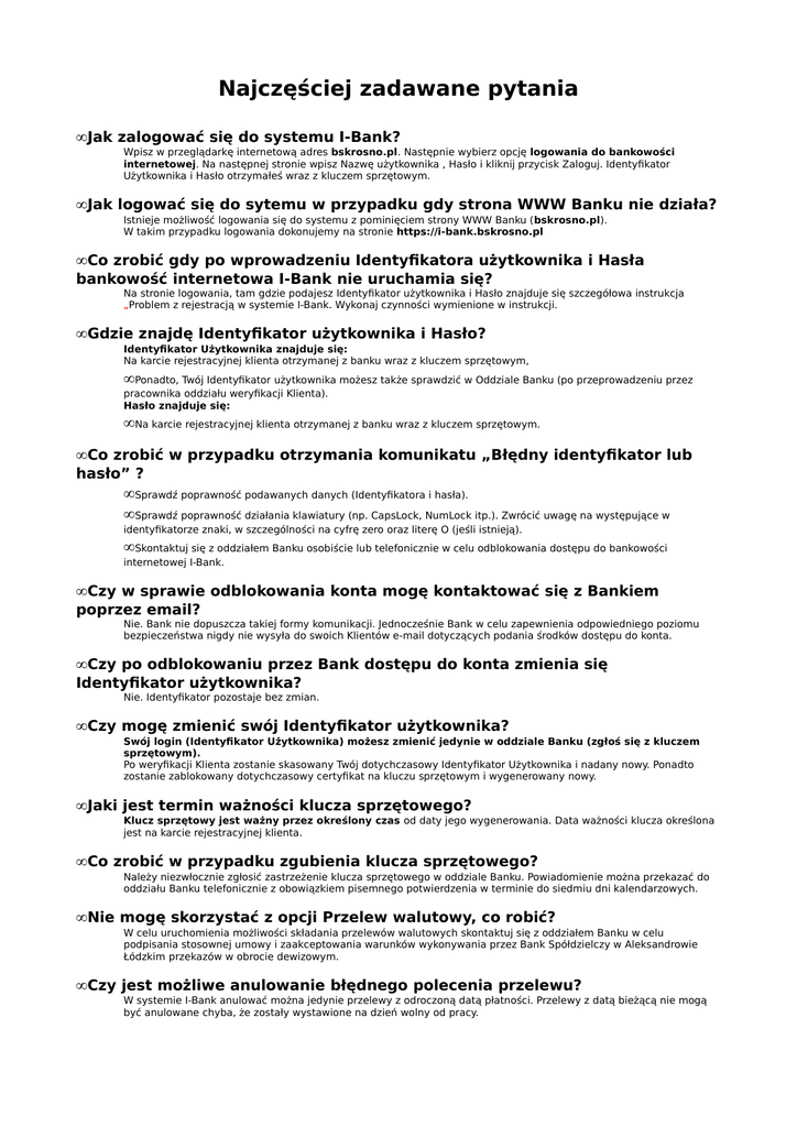 Najczęściej zadawane pytania • Jak zalogować się do systemu I-Bank? Wpisz w przeglądarkę internetową adres bskrosno.pl. Następnie wybierz opcję logowania do bankowości internetowej. Na następnej stronie wpisz Nazwę użytkownika , Hasło i kliknij przycisk Zaloguj. Identyfikator Użytkownika i Hasło otrzymałeś wraz z kluczem sprzętowym. • Jak logować się do sytemu w przypadku gdy strona WWW Banku nie działa? Istnieje możliwość logowania się do systemu z pominięciem strony WWW Banku (bskrosno.pl). W takim przypadku logowania dokonujemy na stronie https://i-bank.bskrosno.pl • Co zrobić gdy po wprowadzeniu Identyfikatora użytkownika i Hasła bankowość internetowa I-Bank nie uruchamia się? Na stronie logowania, tam gdzie podajesz Identyfikator użytkownika i Hasło znajduje się szczegółowa instrukcja „Problem z rejestracją w systemie I-Bank. Wykonaj czynności wymienione w instrukcji. • Gdzie znajdę Identyfikator użytkownika i Hasło? Identyfikator Użytkownika znajduje się: Na karcie rejestracyjnej klienta otrzymanej z banku wraz z kluczem sprzętowym, • Ponadto, Twój Identyfikator użytkownika możesz także sprawdzić w Oddziale Banku (po przeprowadzeniu przez pracownika oddziału weryfikacji Klienta). Hasło znajduje się: • Na karcie rejestracyjnej klienta otrzymanej z banku wraz z kluczem sprzętowym. • Co zrobić w przypadku otrzymania komunikatu „Błędny identyfikator lub hasło” ? • Sprawdź poprawność podawanych danych (Identyfikatora i hasła). • Sprawdź poprawność działania klawiatury (np. CapsLock, NumLock itp.). Zwrócić uwagę na występujące w identyfikatorze znaki, w szczególności na cyfrę zero oraz literę O (jeśli istnieją). • Skontaktuj się z oddziałem Banku osobiście lub telefonicznie w celu odblokowania dostępu do bankowości internetowej I-Bank. • Czy w sprawie odblokowania konta mogę kontaktować się z Bankiem poprzez email? Nie. Bank nie dopuszcza takiej formy komunikacji. Jednocześnie Bank w celu zapewnienia odpowiedniego poziomu bezpieczeństwa nigdy nie wysyła do swoich Klientów e-mail dotyczących podania środków dostępu do konta. • Czy po odblokowaniu przez Bank dostępu do konta zmienia się Identyfikator użytkownika? Nie. Identyfikator pozostaje bez zmian. • Czy mogę zmienić swój Identyfikator użytkownika? Swój login (Identyfikator Użytkownika) możesz zmienić jedynie w oddziale Banku (zgłoś się z kluczem sprzętowym). Po weryfikacji Klienta zostanie skasowany Twój dotychczasowy Identyfikator Użytkownika i nadany nowy. Ponadto zostanie zablokowany dotychczasowy certyfikat na kluczu sprzętowym i wygenerowany nowy. • Jaki jest termin ważności klucza sprzętowego? Klucz sprzętowy jest ważny przez określony czas od daty jego wygenerowania. Data ważności klucza określona jest na karcie rejestracyjnej klienta. • Co zrobić w przypadku zgubienia klucza sprzętowego? Należy niezwłocznie zgłosić zastrzeżenie klucza sprzętowego w oddziale Banku. Powiadomienie można przekazać do oddziału Banku telefonicznie z obowiązkiem pisemnego potwierdzenia w terminie do siedmiu dni kalendarzowych. • Nie mogę skorzystać z opcji Przelew walutowy, co robić? W celu uruchomienia możliwości składania przelewów walutowych skontaktuj się z oddziałem Banku w celu podpisania stosownej umowy i zaakceptowania warunków wykonywania przez Bank Spółdzielczy w Aleksandrowie Łódzkim przekazów w obrocie dewizowym. • Czy jest możliwe anulowanie błędnego polecenia przelewu? W systemie I-Bank anulować można jedynie przelewy z odroczoną datą płatności. Przelewy z datą bieżącą nie mogą być anulowane chyba, że zostały wystawione na dzień wolny od pracy. • Dlaczego mam mniejsze dostępne środki od salda? • Dostępne środki to środki własne zgormadzone na rachunku powiększone o wysokość limitu kredytowego (jeśli posiadasz taki produkt) lub pomniejszone o kwotę zablokowaną (np.: z tytułu transakcji wykonywanej kartą płatniczą). • Saldo to środki własne zgromadzone na rachunku. • Jak wykonać przelew ZUS/US? Przelewu do ZUS lub US dokonasz za pomocą odpowiednich formularzy, które znajdują się w zakładce – Przelewy do ZUS/ Przelew do US. Do wykonania przelewu do ZUS-u i Urzędu Skarbowego wymagane są dodatkowe informacje, inne niż w przypadku przelewu standardowego. Dane wymagane do realizacji przelewu do ZUS: • nazwa skrócona lub imię i nazwisko płatnika, • NIP płatnika, • drugi identyfikator (dowód osobisty, paszport, PESEL, REGON), • typ wpłaty (np. S - składka za jeden miesiąc), • deklaracja (rok i miesiąc, np. 200912), • numer deklaracji, Dane wymagane do realizacji przelewu do Urzędu Skarbowego: • siedziba Urzędu Skarbowego, • nazwa Urzędu Skarbowego, • symbol dokumentu, • nazwa i adres zobowiązanego (płatnika), • NIP lub identyfikator uzupełniający (dowód osobisty, paszport, PESEL, REGON), • okres (np. 09M12) Przelew należy zatwierdzić kodem PIN z użyciem klucza sprzętowego. • Jak wykonać przelew z przyszłą datą realizacji? Na formatce nowego przelewu kliknij na ikonę z prawej strony Daty realizacji i wybierz odpowiednią datę.