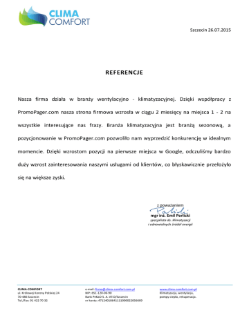 Szczecin 26.07.2015 REFERENCJE Nasza firma działa w branży wentylacyjno - klimatyzacyjnej. Dzięki współpracy z PromoPager.com nasza strona firmowa wzrosła w ciągu 2 miesięcy na miejsca 1 - 2 na wszystkie interesujące nas frazy. Branża klimatyzacyjna jest branżą sezonową, a pozycjonowanie w PromoPager.com pozwoliło nam wyprzedzić konkurencję w idealnym momencie. Dzięki wzrostom pozycji na pierwsze miejsca w Google, odczuliśmy bardzo duży wzrost zainteresowania naszymi usługami od klientów, co błyskawicznie przełożyło się na większe zyski. z poważaniem mgr inż. Emil Perlicki specjalista ds. klimatyzacji i odnawialnych źródeł energii CLIMA-COMFORT ul. Królowej Korony Polskiej 24 70-486 Szczecin Tel./Fax: 91 422 70 32 e-mail: [email protected] NIP: 851-120-06-90 Bank PeKaO S. A. Vll O/Szczecin nr konta: 47124018641111000022056609 www.clima-comfort.com.pl Klimatyzacja, wentylacja, pompy ciepła, rekuperacja.